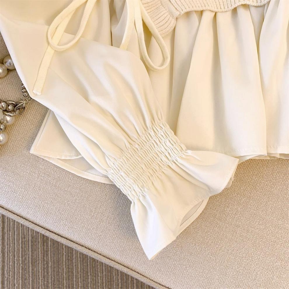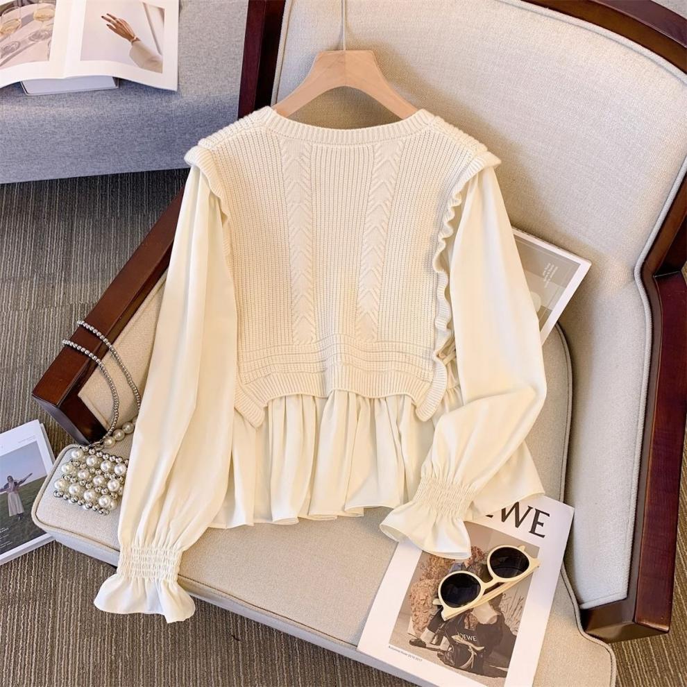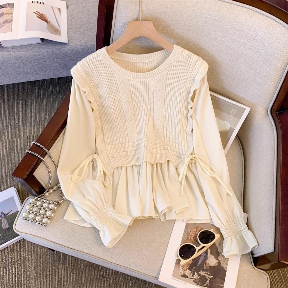 부드러운 가짜 투피스 스티칭 스웨터 여성 디자인 감각 틈새 이른 가을 부드러운 찹쌀 스웨터 느슨한 배 덮개