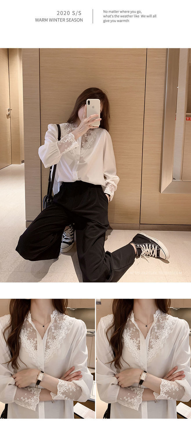 여성을위한 레이스 바닥 셔츠 봄과 가을의 새로운 디자인 감각 틈새 내부 착용 서양식 스키밍 탑 쉬폰 스티칭 셔츠스토어 가기