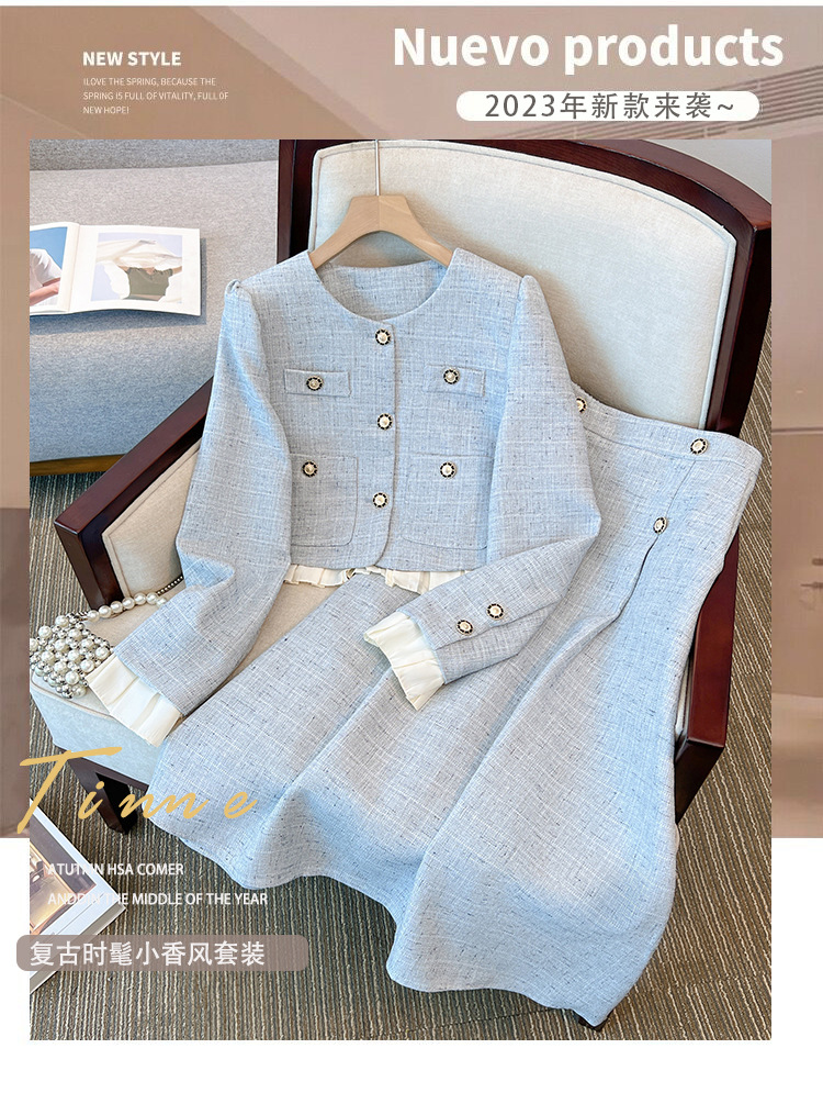 봄과 가을 새로운 플러스 사이즈 여성 의류 샤넬 스타일 세트 프랑스 사교계 코트 스커트 투피스 세트스토어 가기