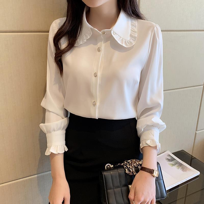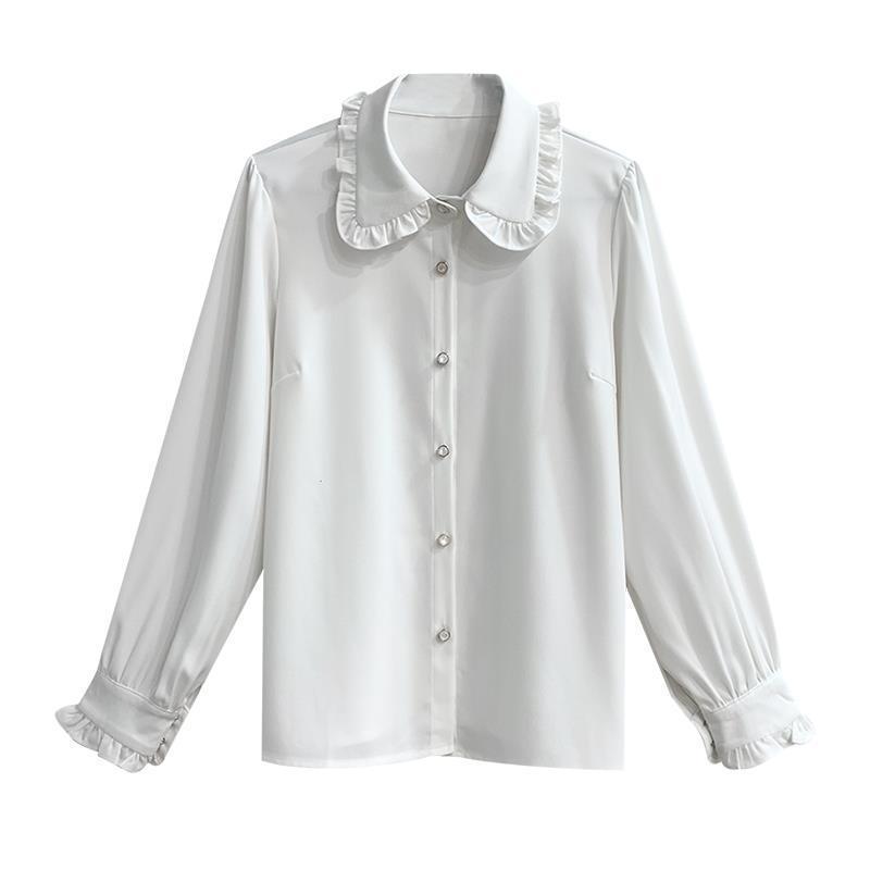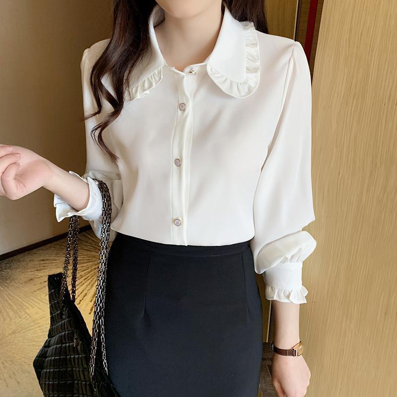 2024 봄과 가을 새로운 우아한 세련된 흰색 쉬폰 셔츠 여성의 여름 긴 소매 인형 칼라 셔츠 얇은 탑스토어 가기