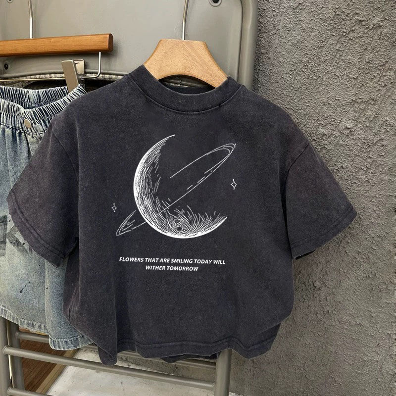 세탁 된 블랙 아동복 빈 복고풍 반팔 티셔츠 순면 소년과 소녀 아기 어린이 잘 생긴 유행 탑