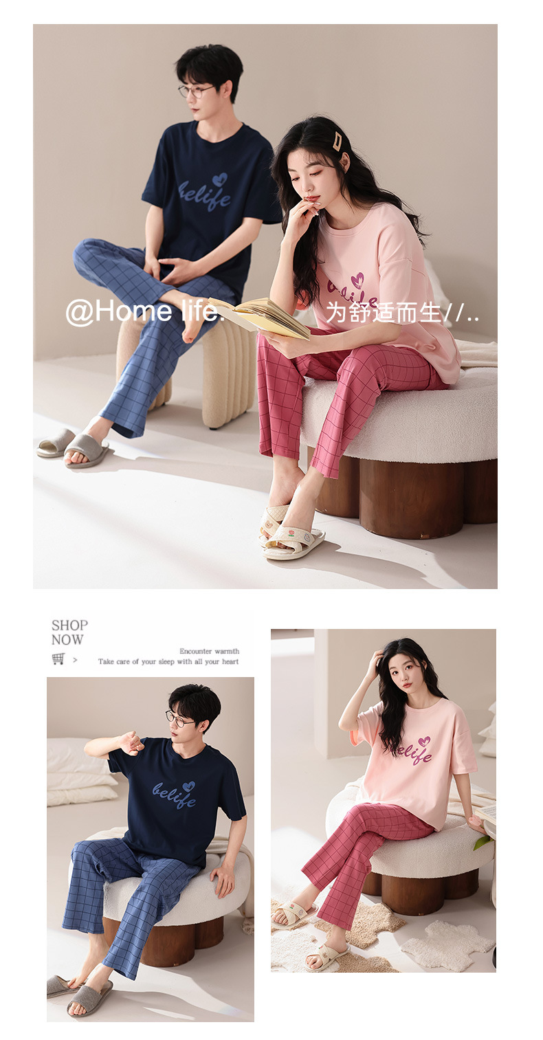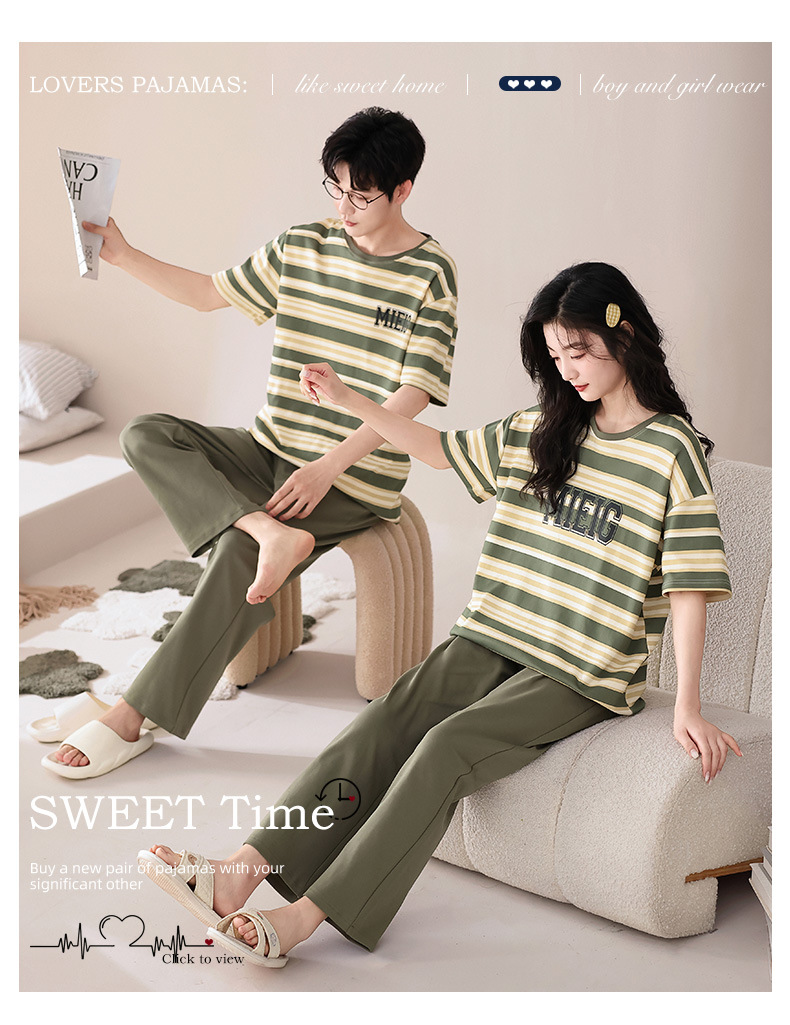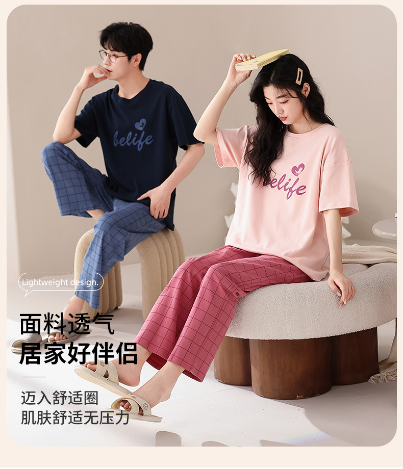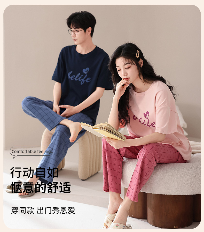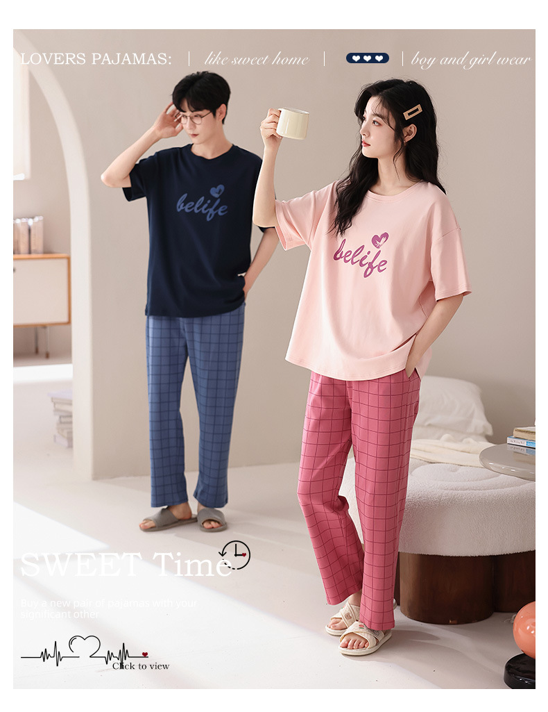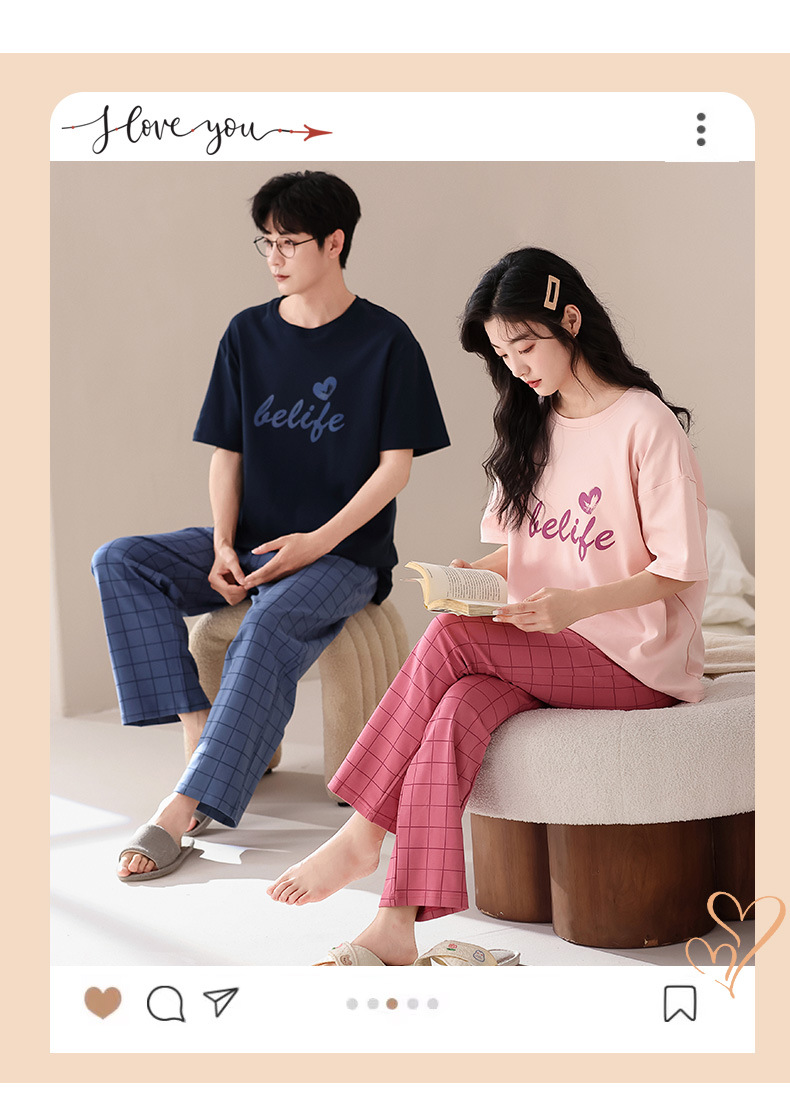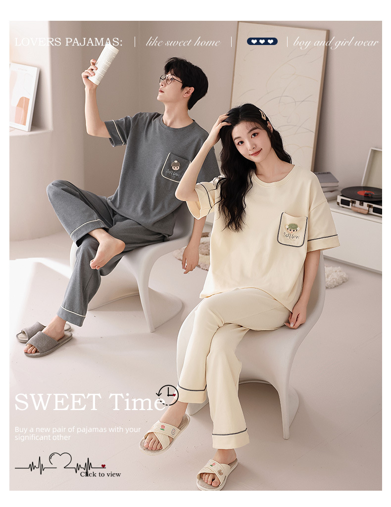 퓨어 코튼 커플 잠옷 여성 여름 라운드 넥 캐주얼 반팔 바지 한국 간단한 겉옷 남성 홈웨어 세트스토어 가기
