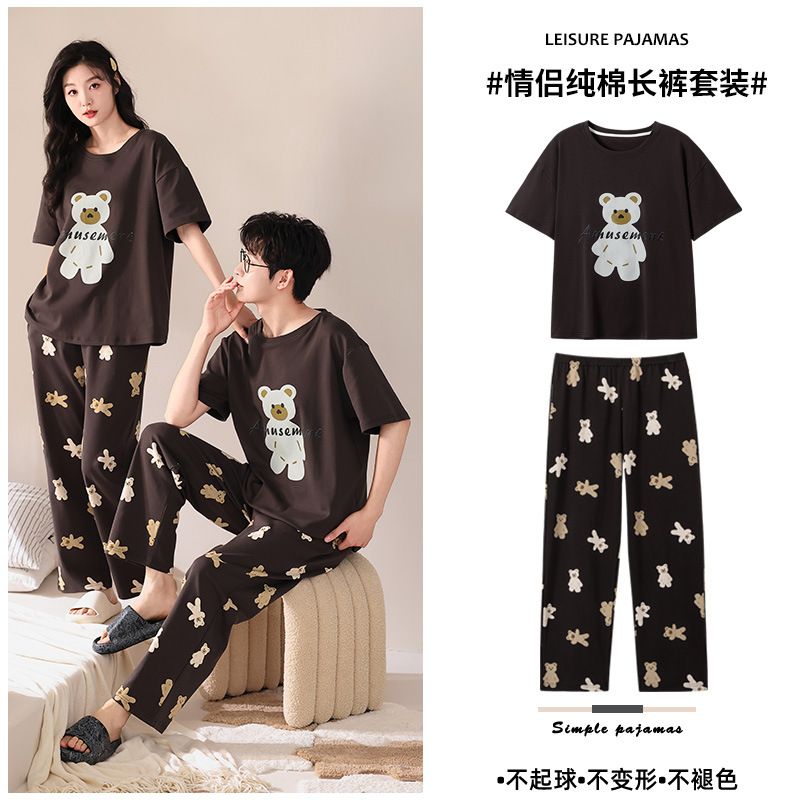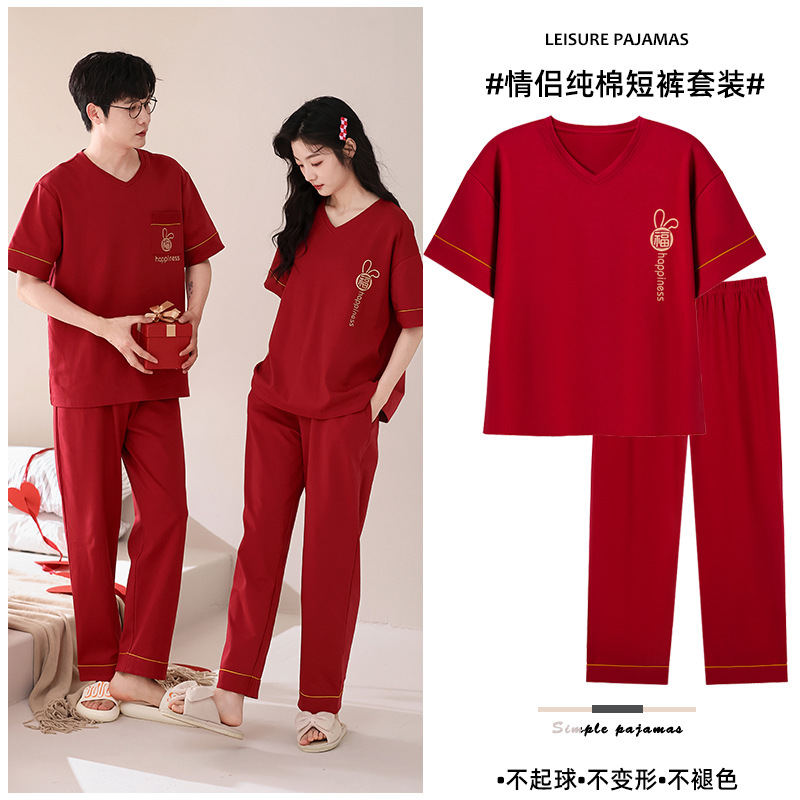 퓨어 코튼 커플 잠옷 여성 여름 라운드 넥 캐주얼 반팔 바지 한국 간단한 겉옷 남성 홈웨어 세트