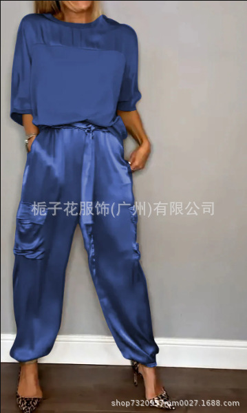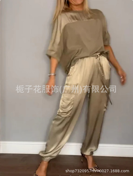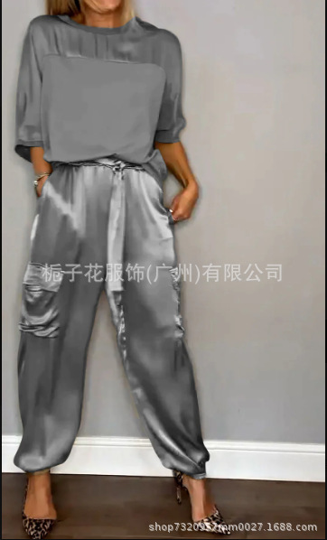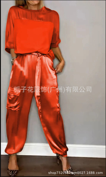 유럽과 미국의 국경 간 여성 세트 독립 역 인기있는 단색 새틴 캐주얼 패션 바지 두 조각 세트 여성