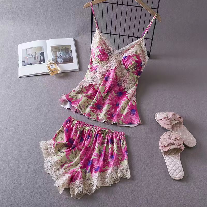섹시한 플러스 사이즈 잠옷 여성 여름 아이스 실크 캐미솔 반바지 투피스 루즈 홈웨어 세트