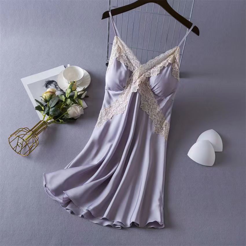 • 새틴 실크 나이트 드레스-부드러운 보라색 레이스 스타일