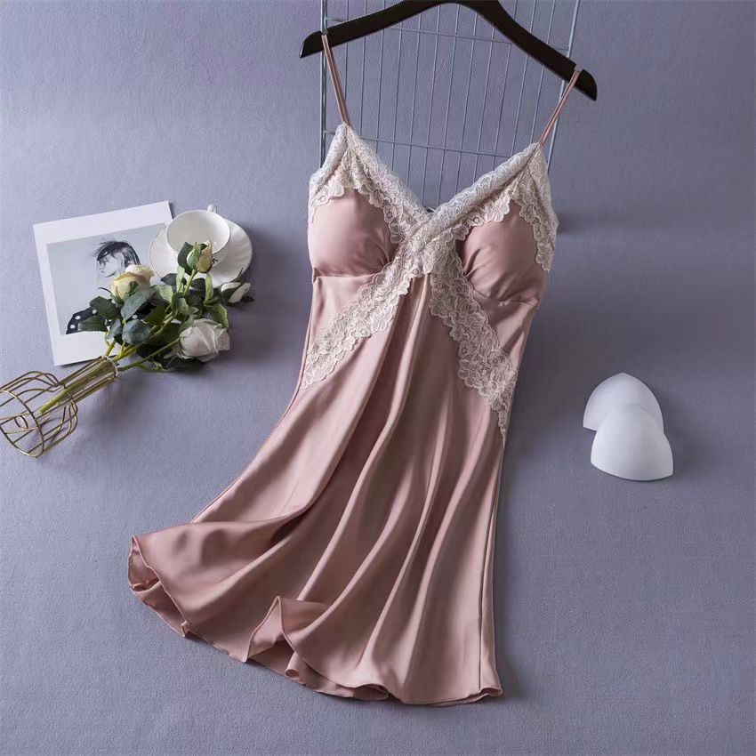 • 새틴 실크 나이트 드레스-핑크 레이스 스타일