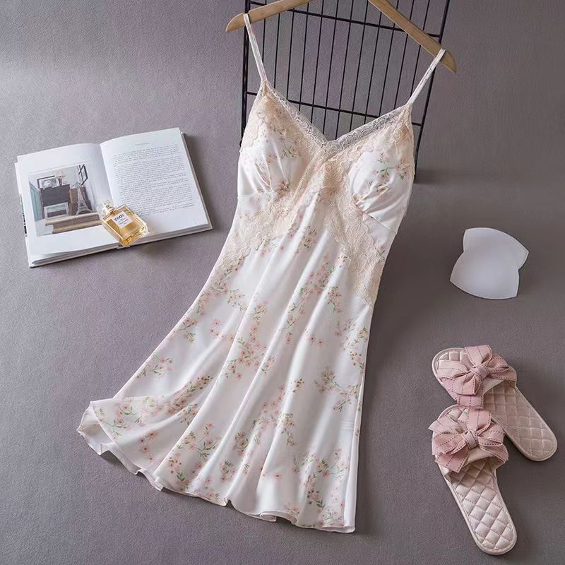 • 새틴 실크 나이트 드레스-벚꽃 핑크 레이스 스타일