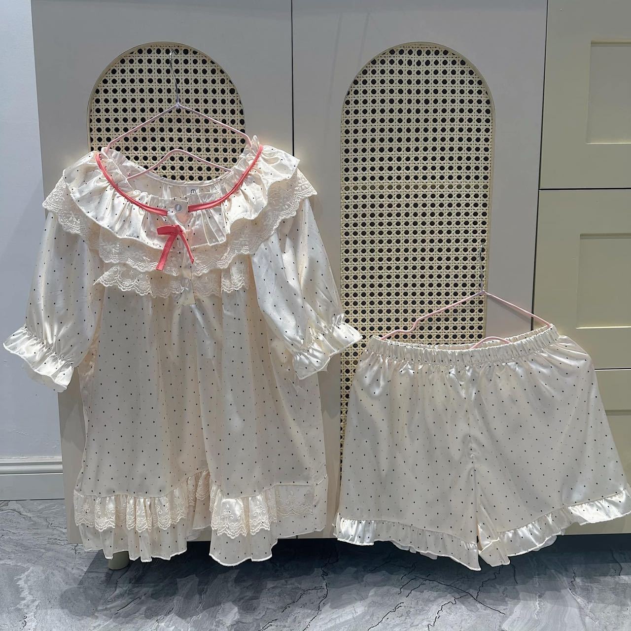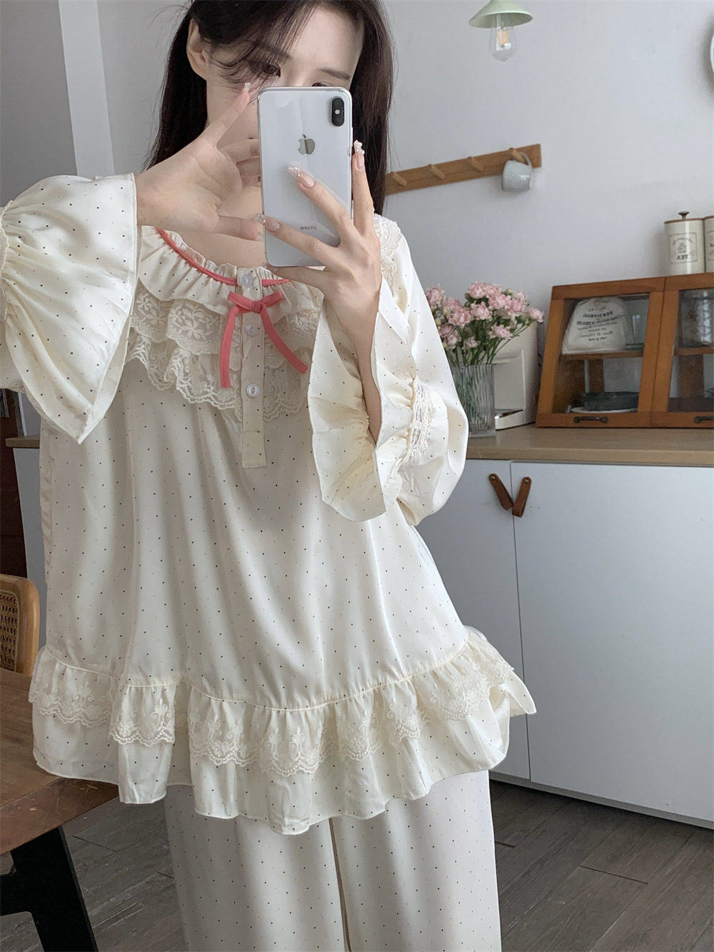 한국의 봄 새로운 달콤한 폴카 도트 공주 스타일 레이스 스티칭 순수한 욕망 스타일 잠옷 여성의 긴팔 홈웨어 세트스토어 가기