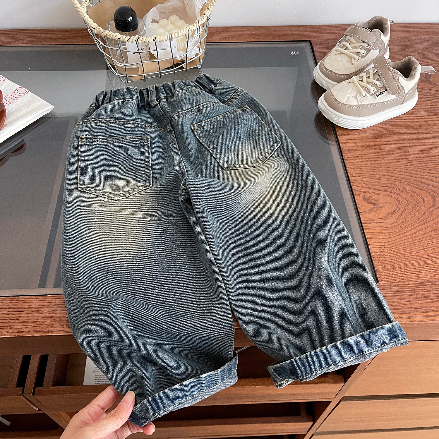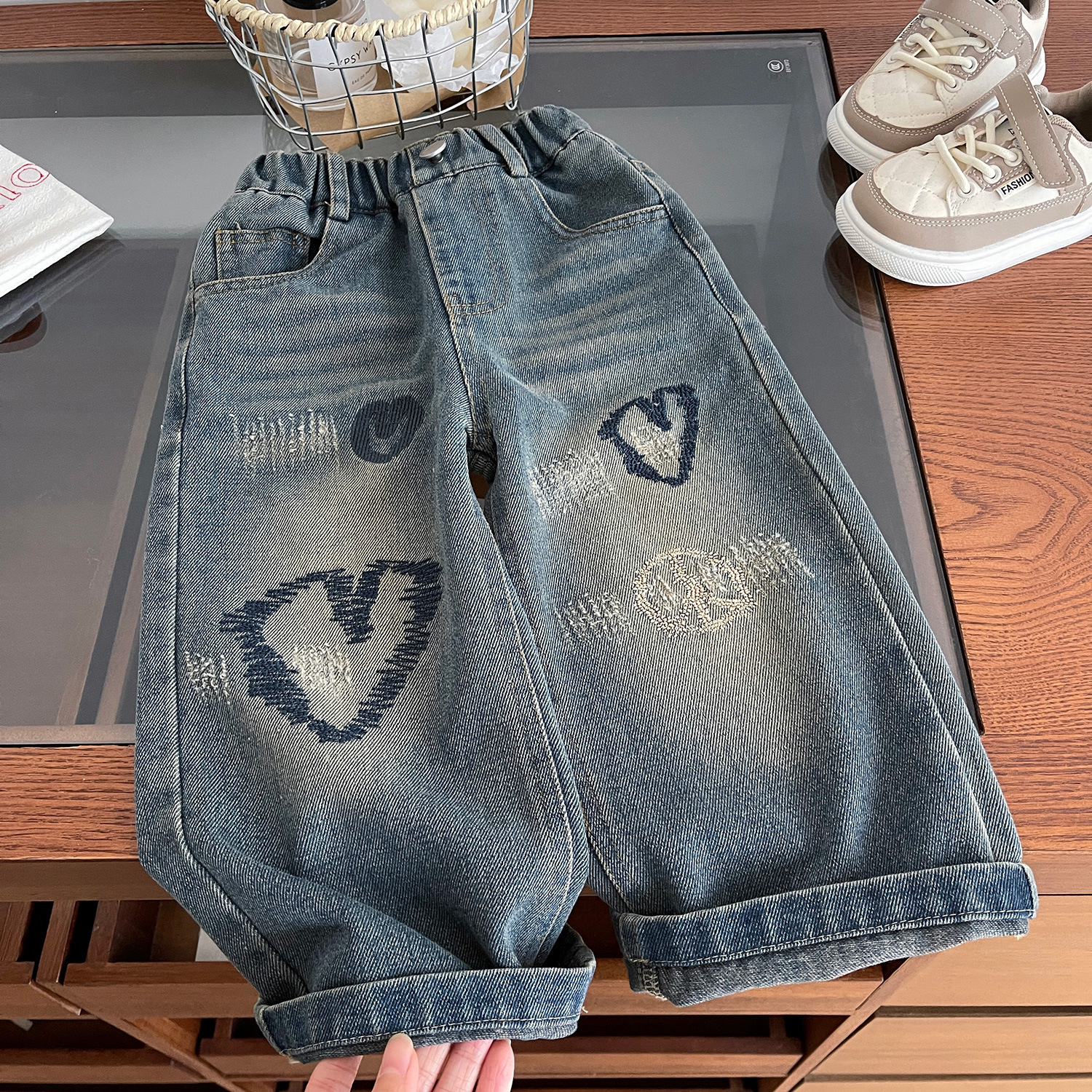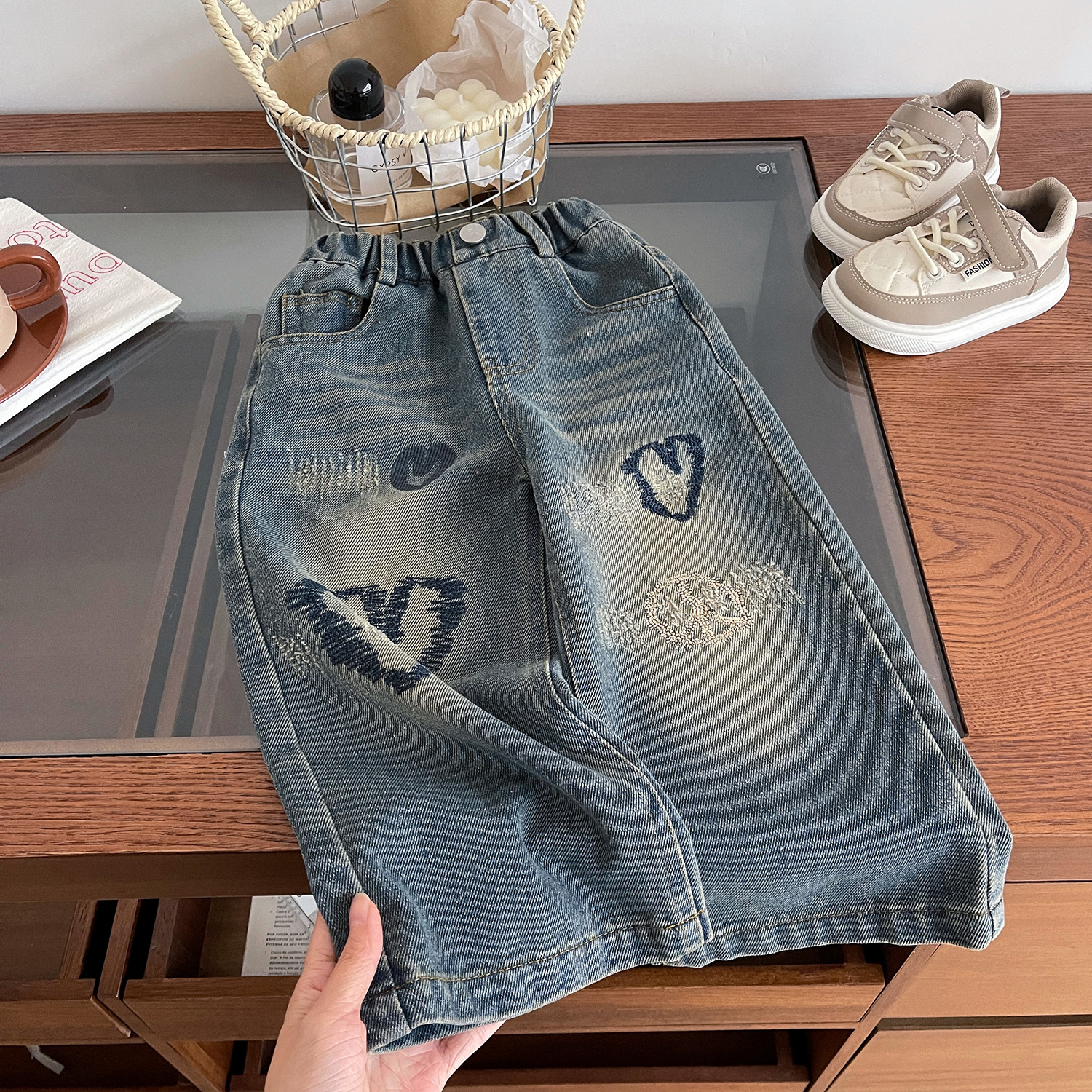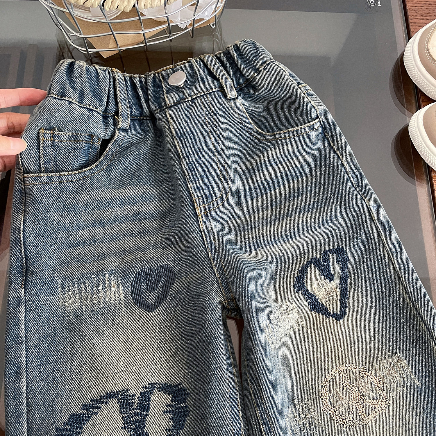 여자 청바지 2024 봄 새로운 한국식 어린이 사랑 수 놓은 스트레이트 올 매치 데님 바지스토어 가기