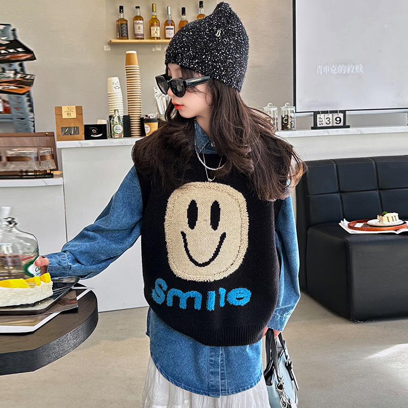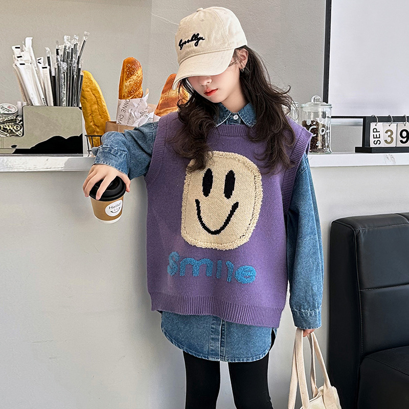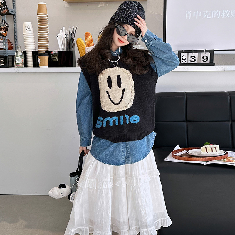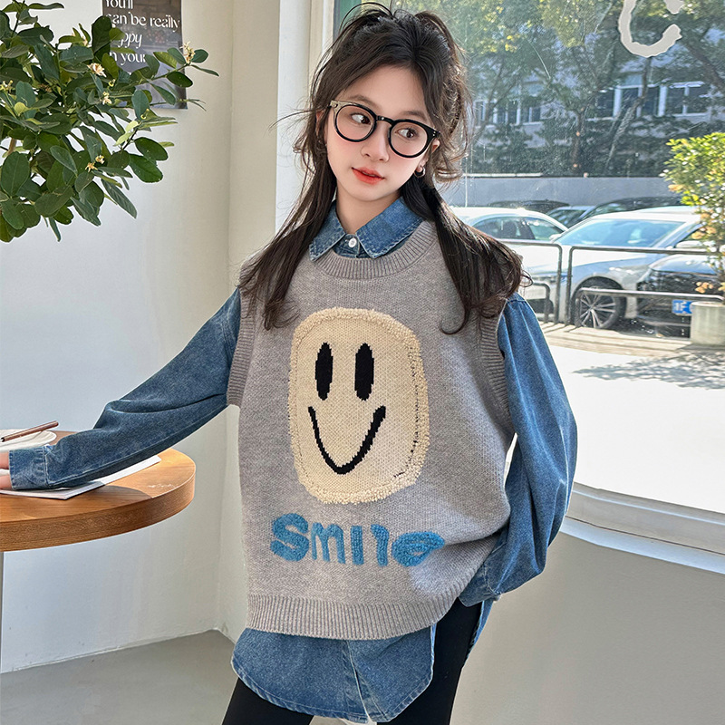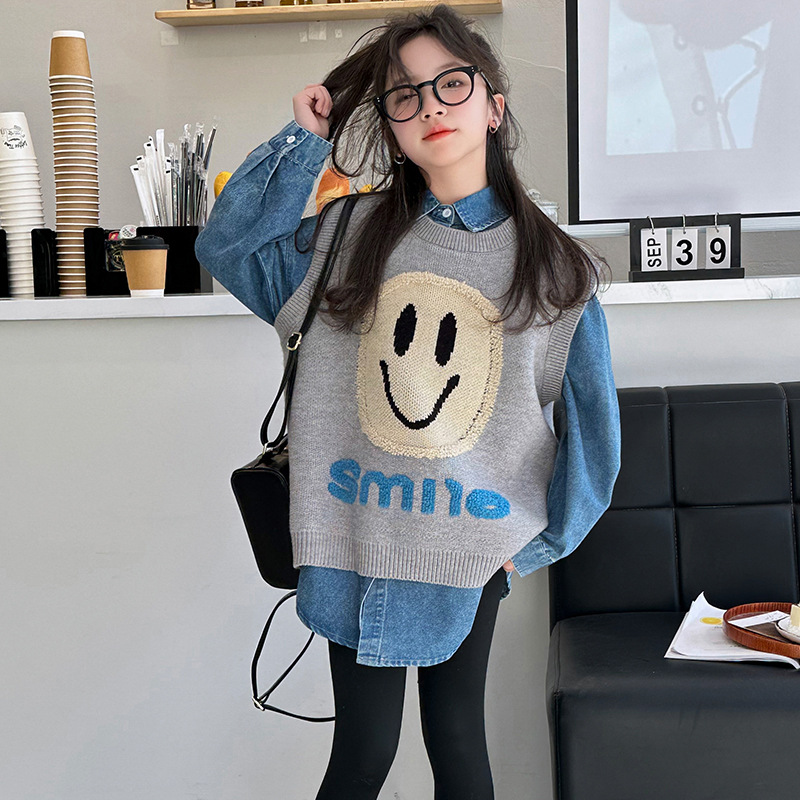 여아 정장 2025 봄 신상 여아 스마일 스웨터 조끼 아동 데님 셔츠 봄 가을 투피스 세트