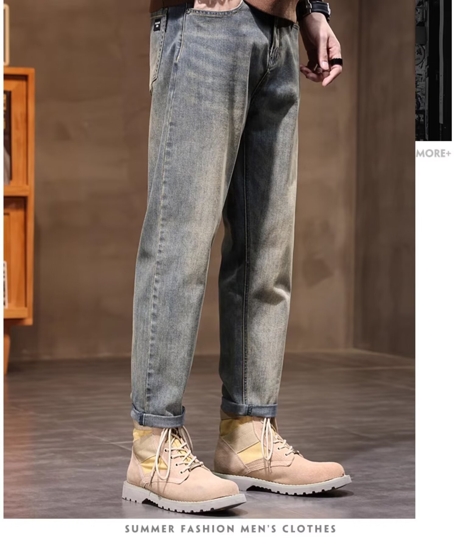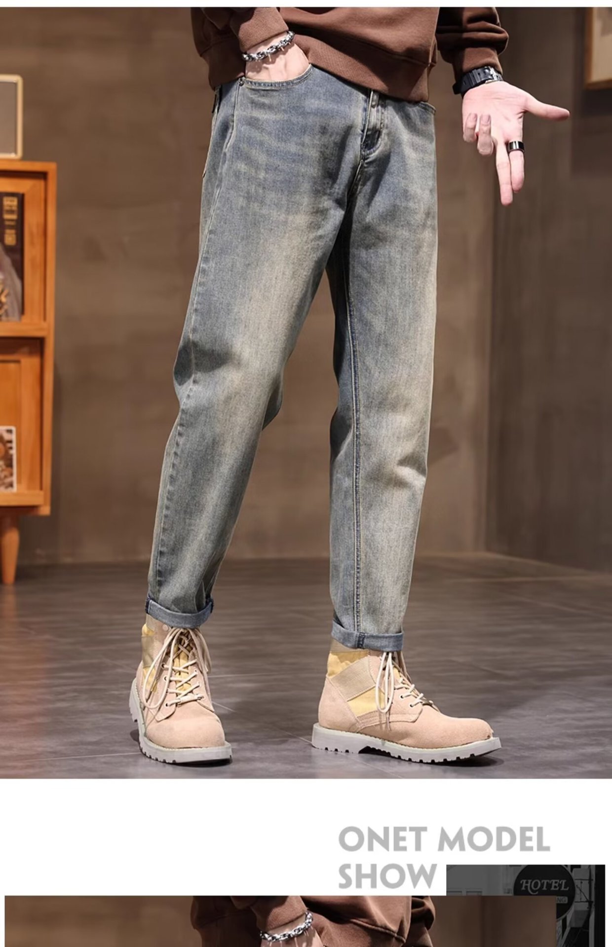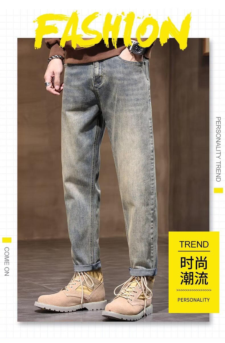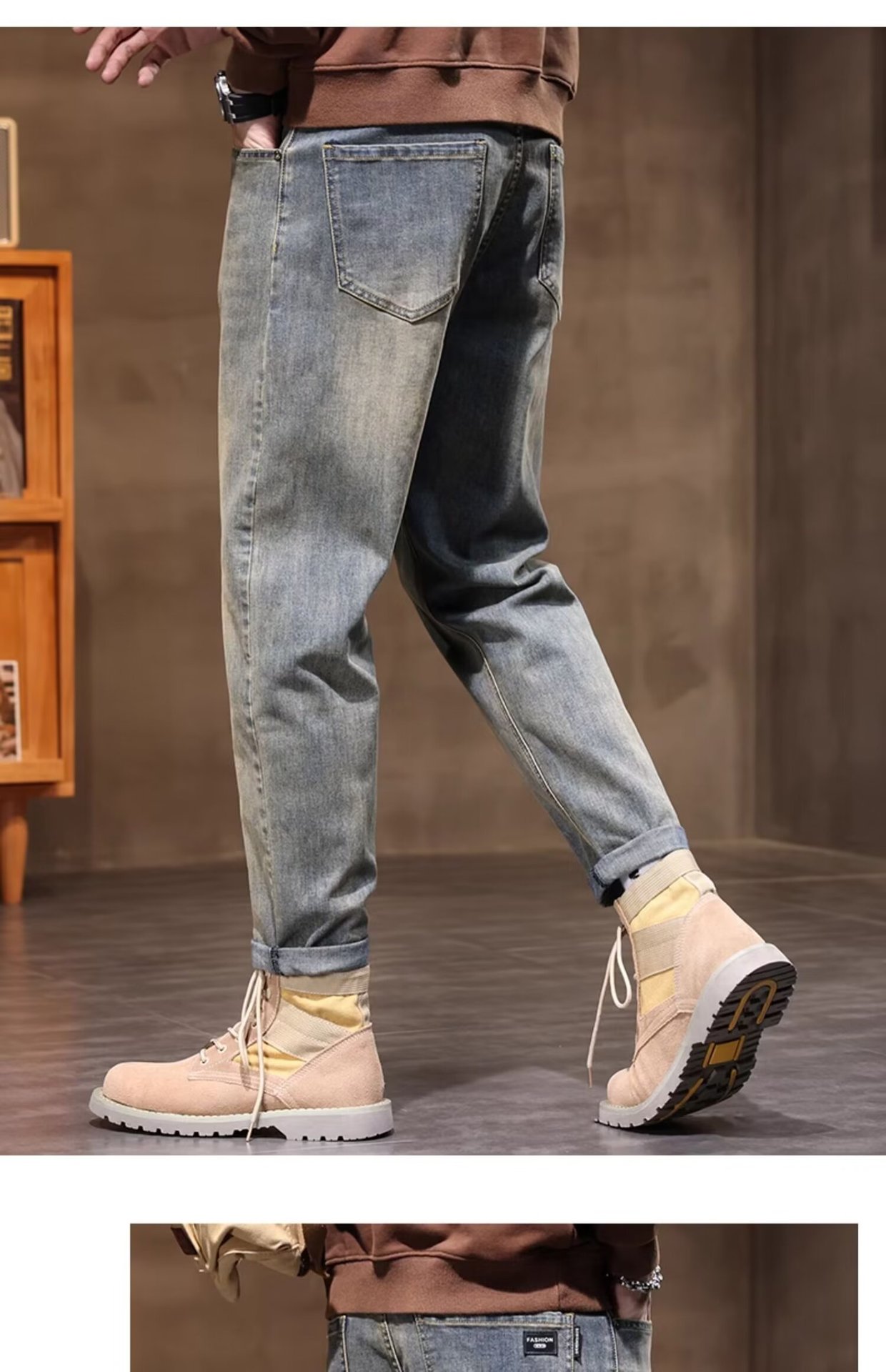 미국식 빈티지 씻은 노란색 진흙 청바지 남성용 봄과 가을 다목적 고급 고민 핏 남성용 캐주얼 바지스토어 가기