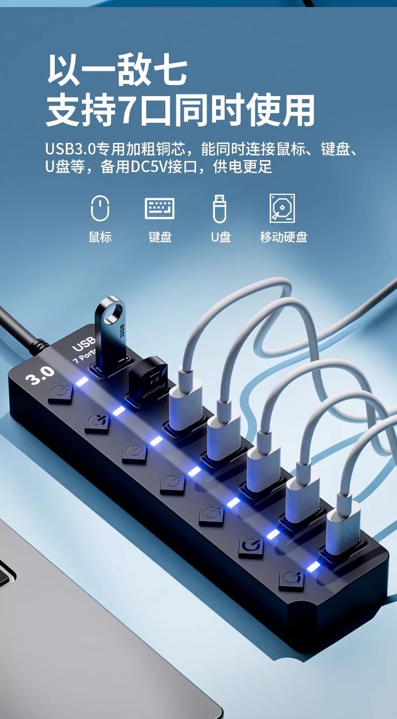 다이아몬드형 7포트 USB3.0 허브 분배기 4포트 허브 USB 확장 도크 허브 다중 인터페이스 변환 분배기스토어 가기