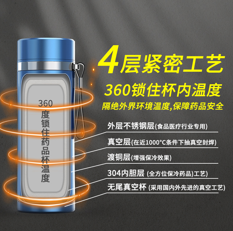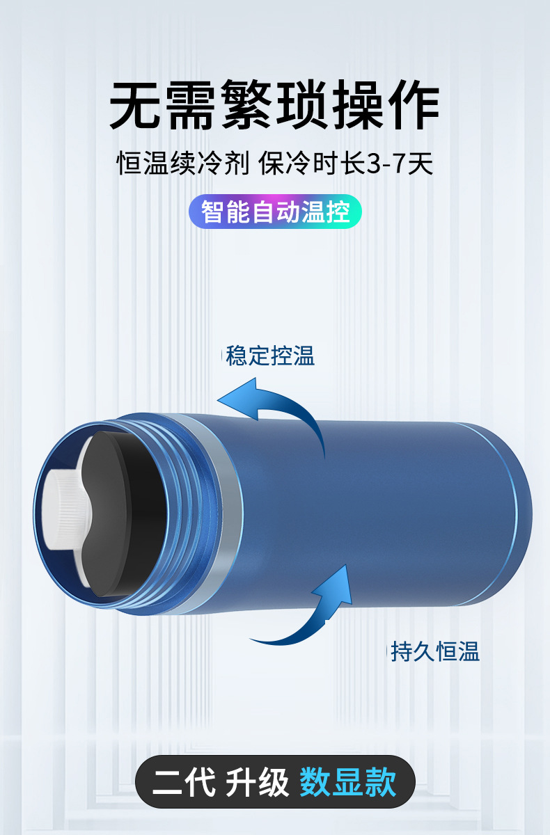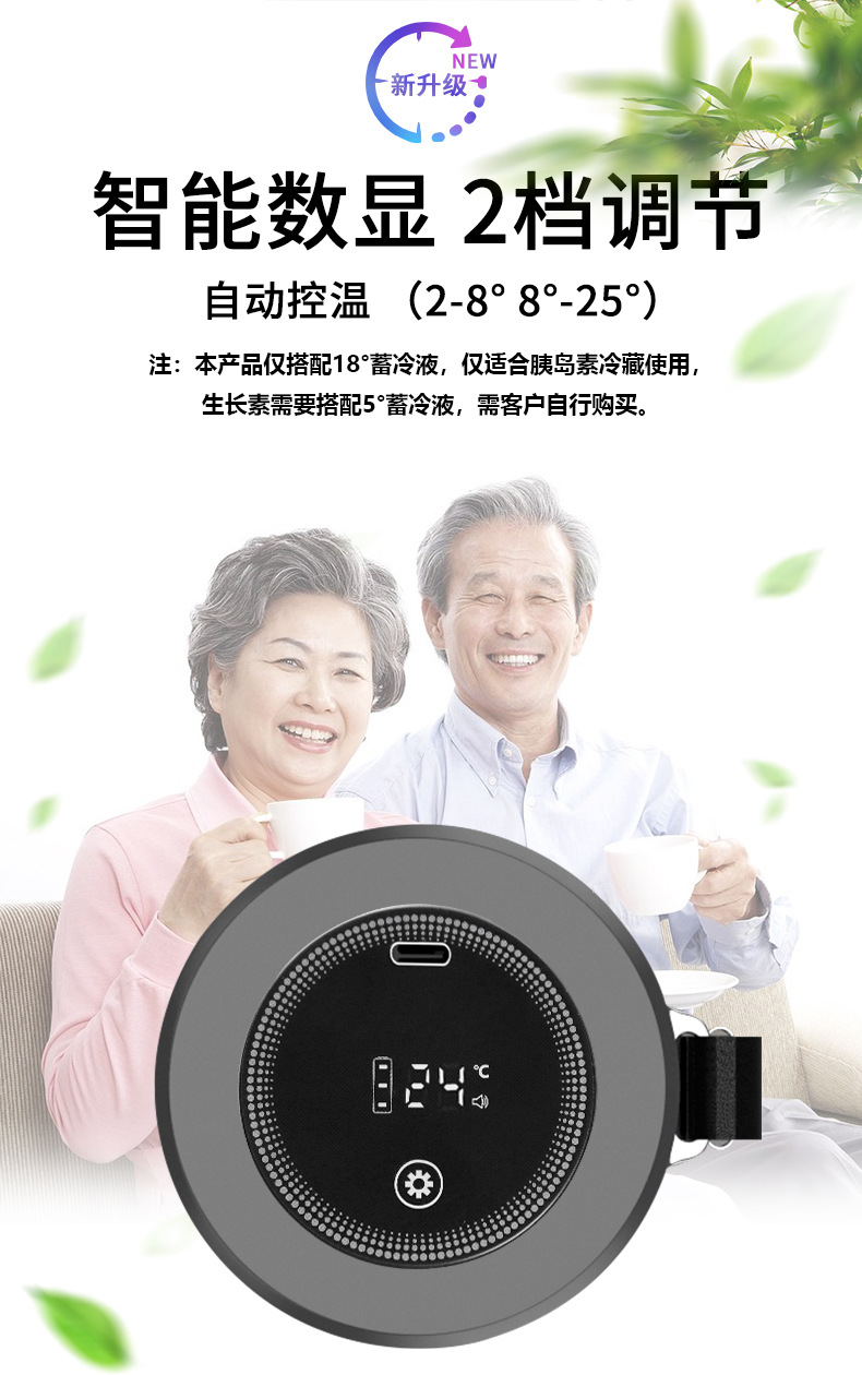 本产品支持2-8°(生长素冷藏)、8-25°(胰岛素冷藏),两档温度监测切换。本品内置蓄冷液为18°蓄冷液,适合胰岛素控温冷藏,如客户需要冷藏生长素,需要自行购买5°的蓄冷液替换。本店目前暂无5°蓄冷液销售。
