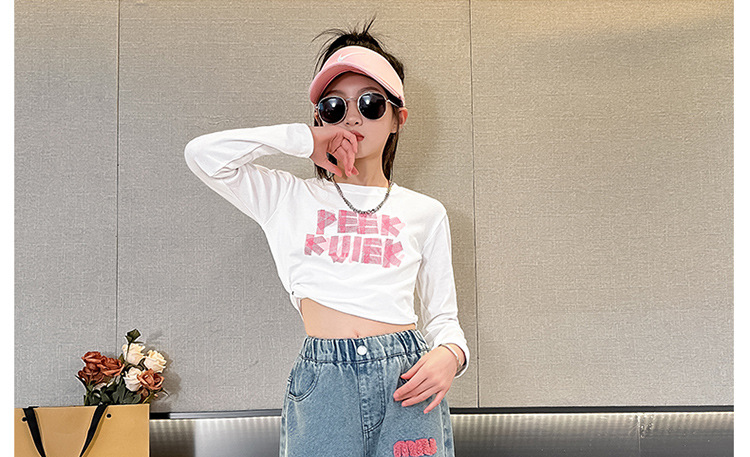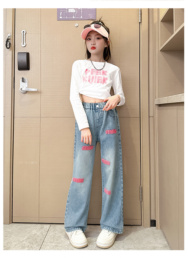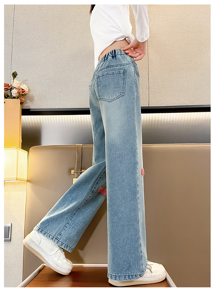소녀 봄 청바지 2024 새로운 패션 소녀 한국식 인터넷 유명인 핑크 수건 자수 와이드 레그 바지