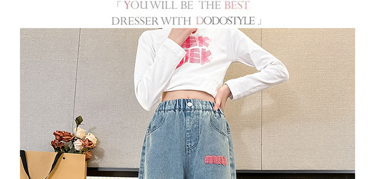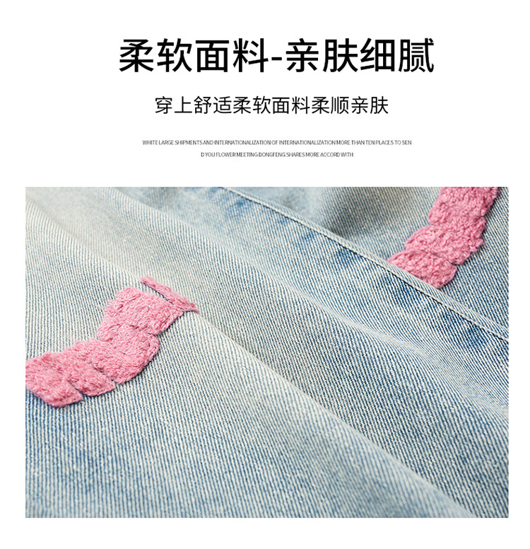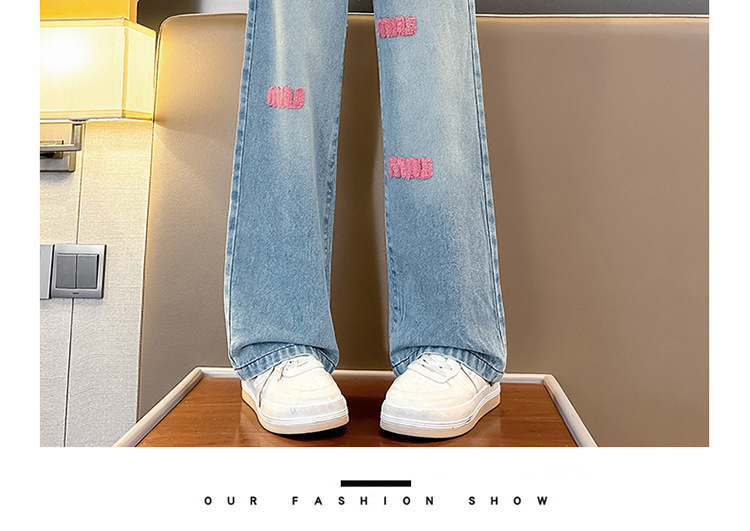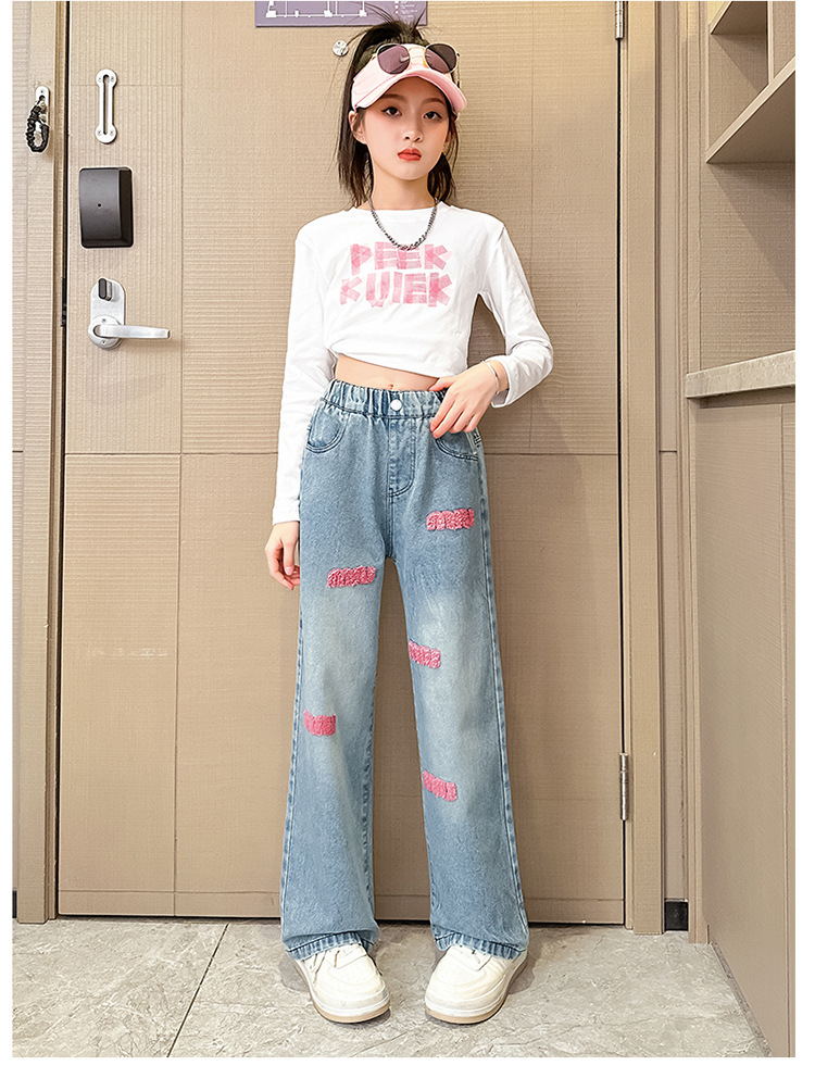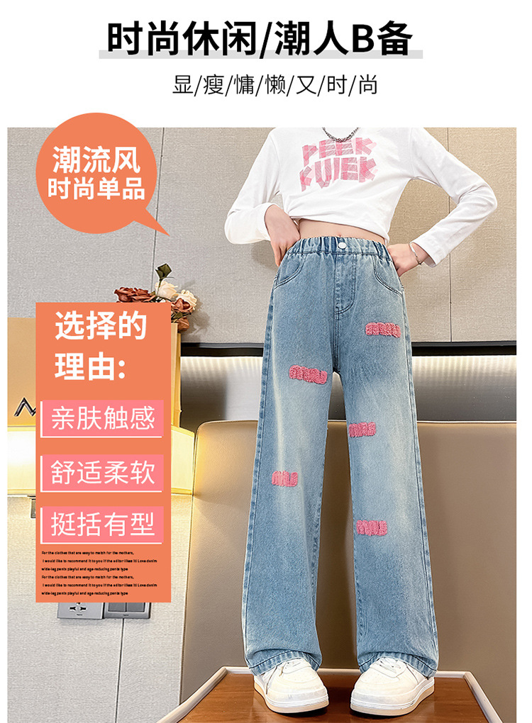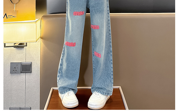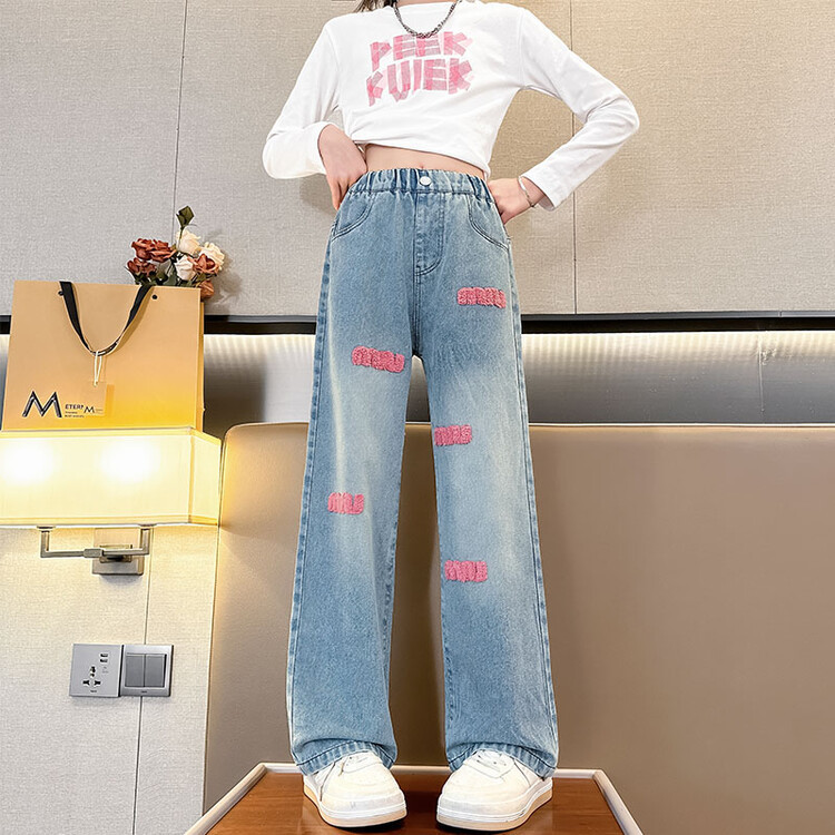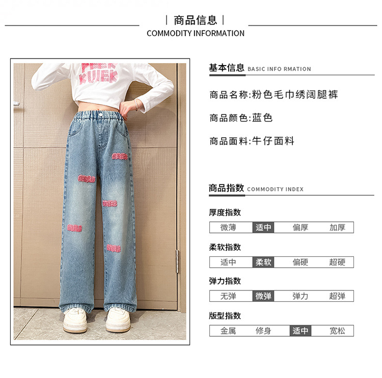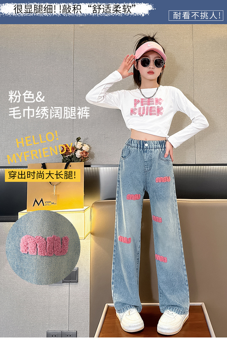 소녀 봄 청바지 2024 새로운 패션 소녀 한국식 인터넷 유명인 핑크 수건 자수 와이드 레그 바지스토어 가기