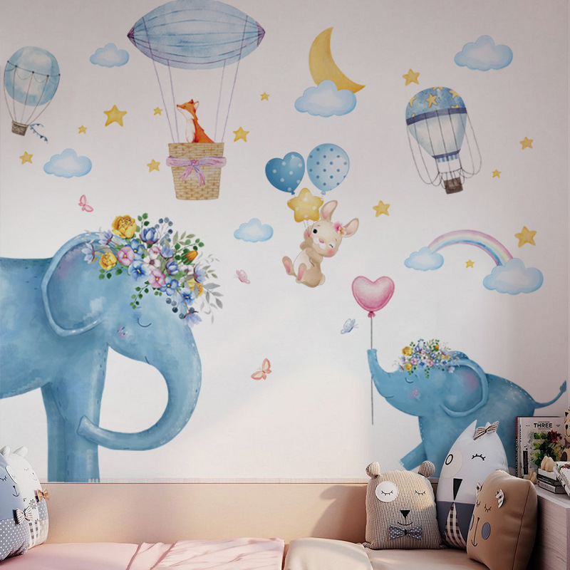 다채로운 만화 코끼리 열기구 벽 스티커 어린이 침실 유치원 조기 교육 센터 배경 장식 CH3906