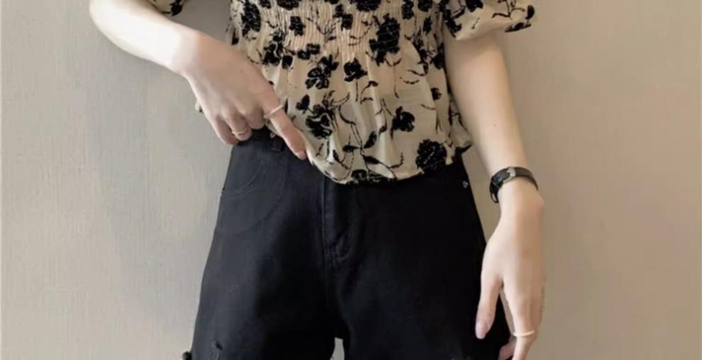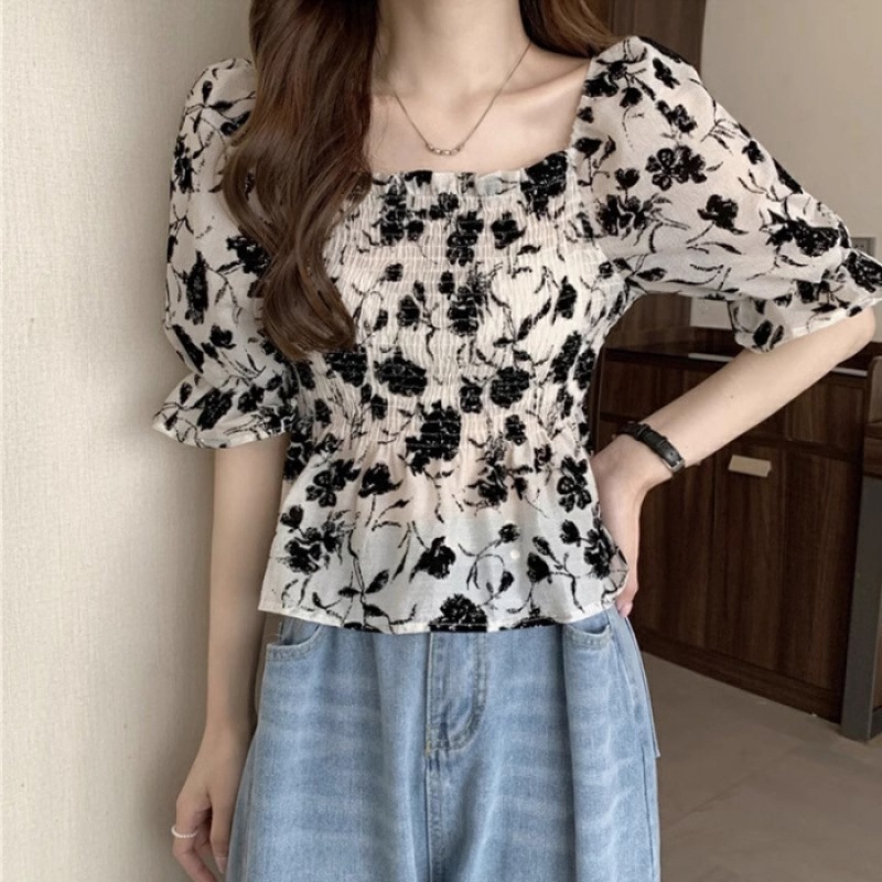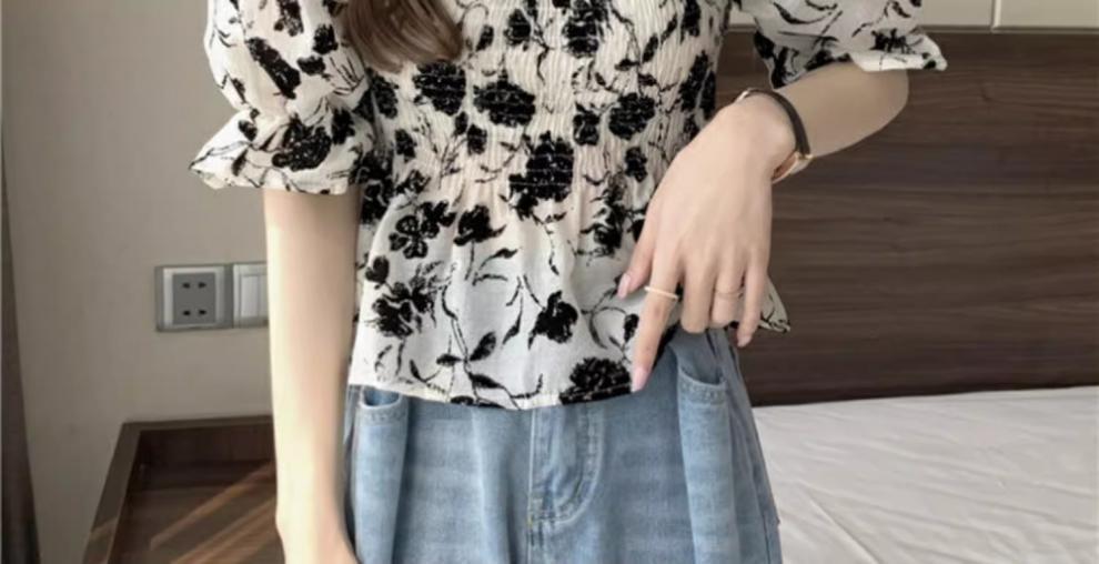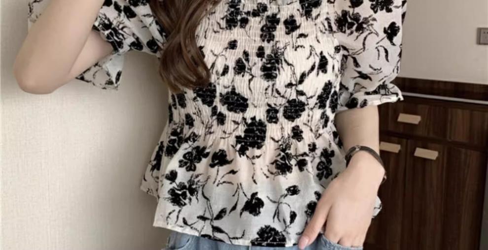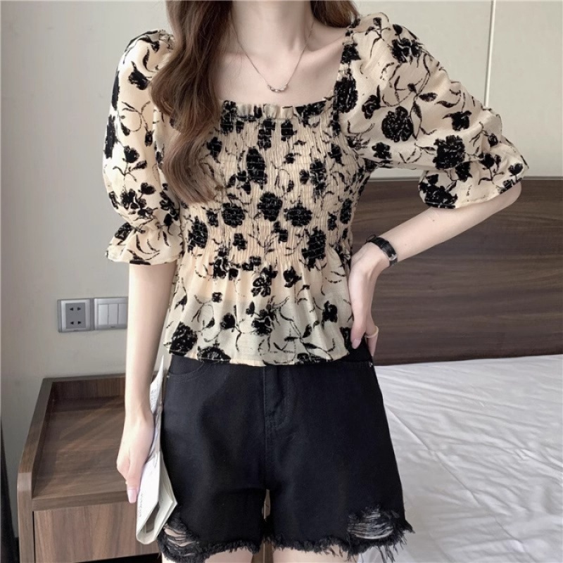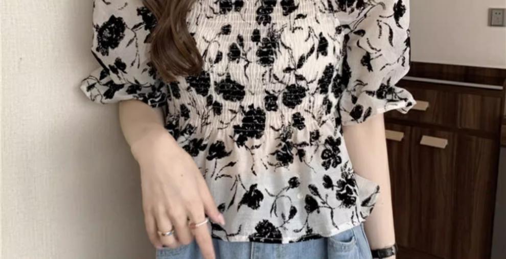 [원래 세련된 프랑스 스타일 버블 짧은 소매 플로럴 셔츠 여성 디자인 여름 짧은 허리-타이트한 탑스토어 가기