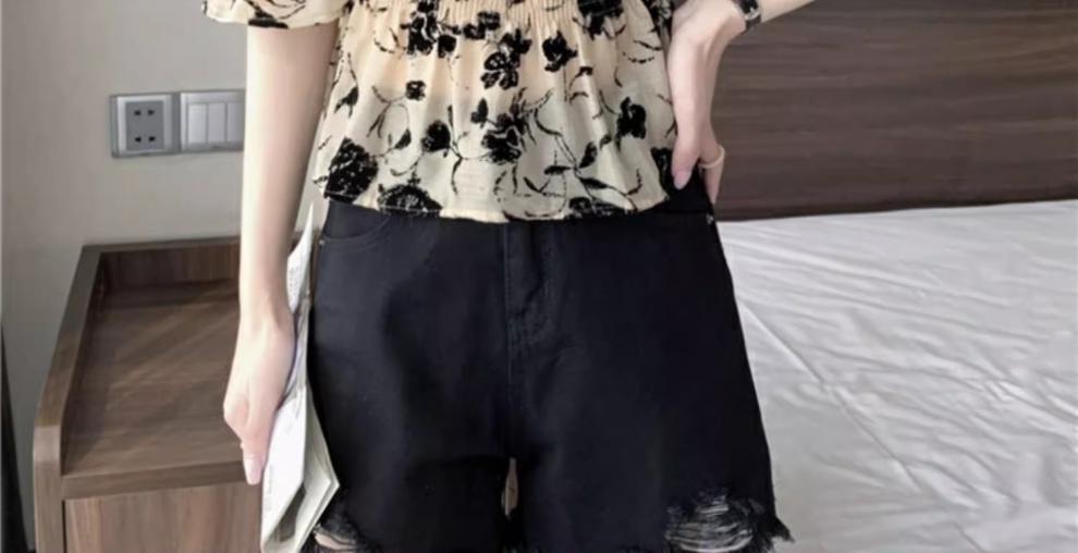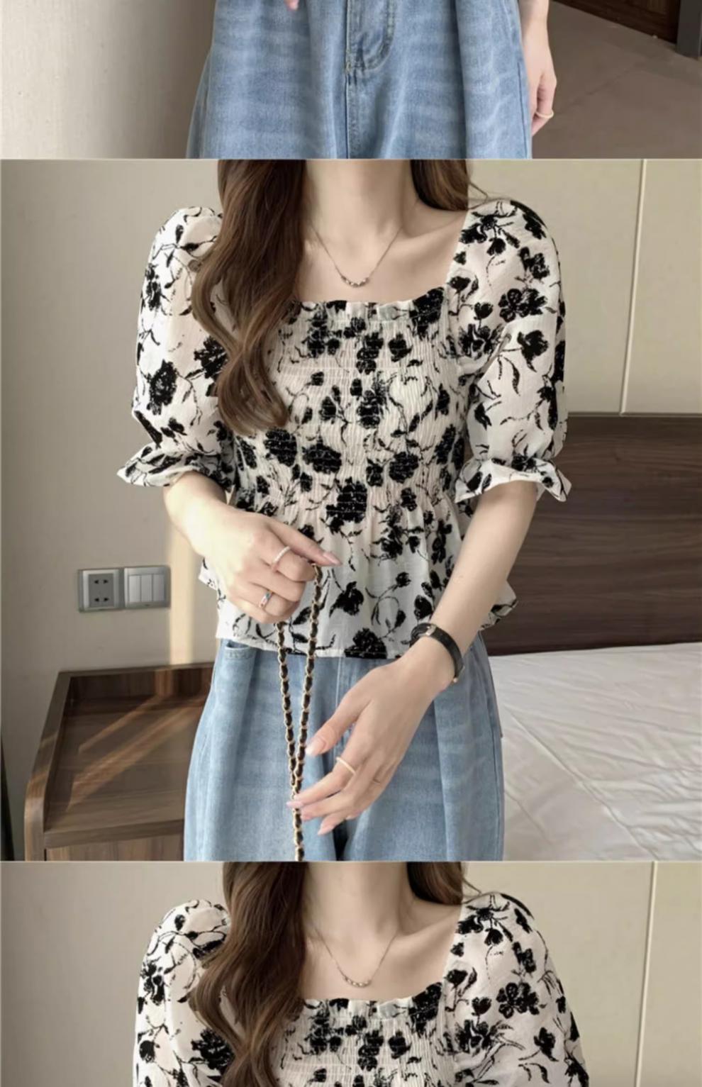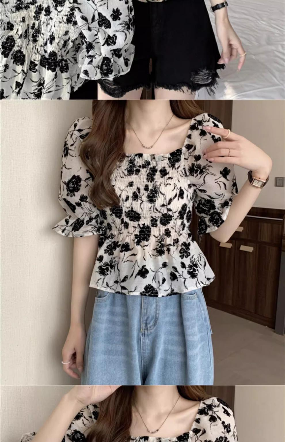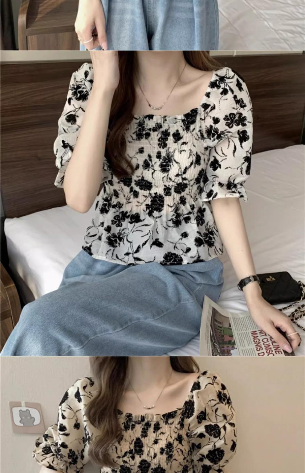 [원래 세련된 프랑스 스타일 버블 짧은 소매 플로럴 셔츠 여성 디자인 여름 짧은 허리-타이트한 탑스토어 가기