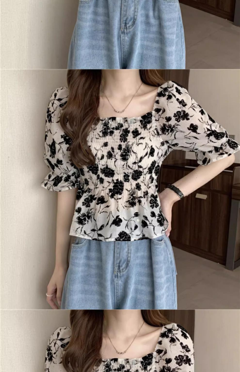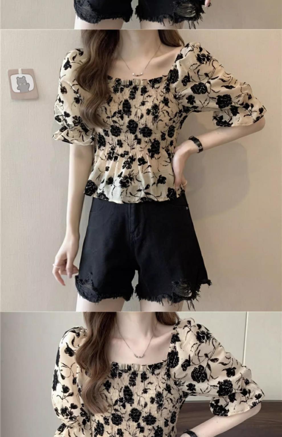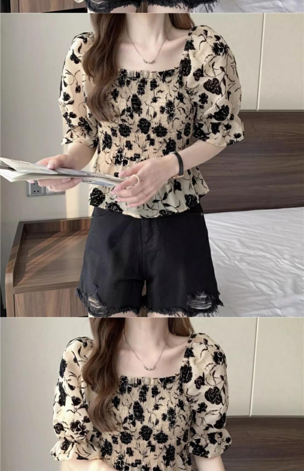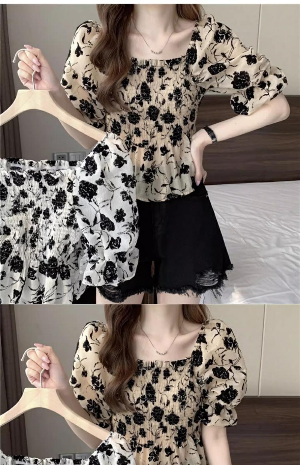 [원래 세련된 프랑스 스타일 버블 짧은 소매 플로럴 셔츠 여성 디자인 여름 짧은 허리-타이트한 탑