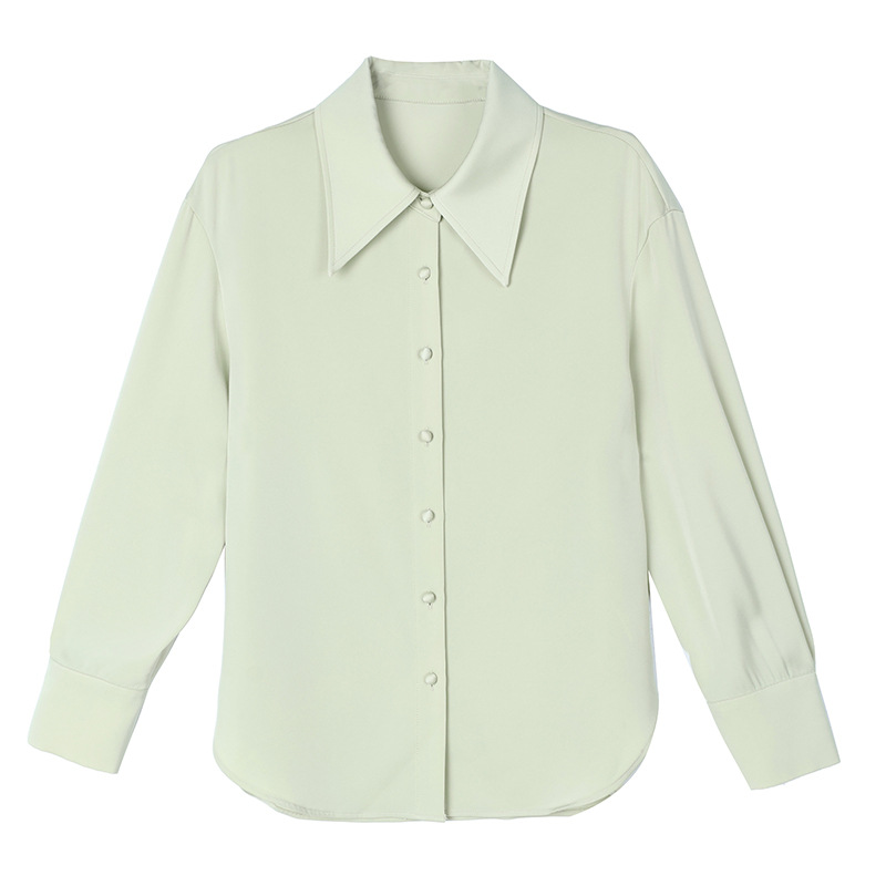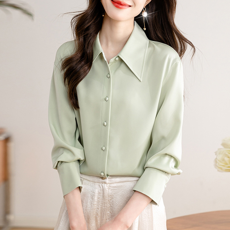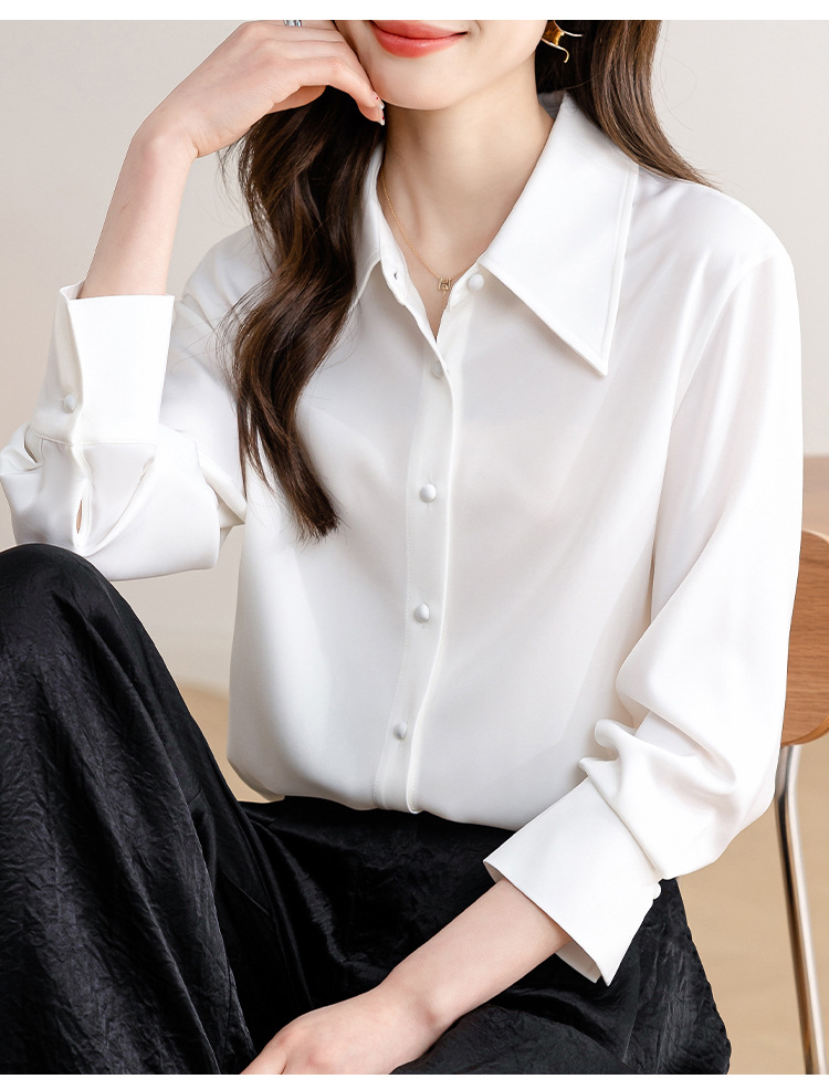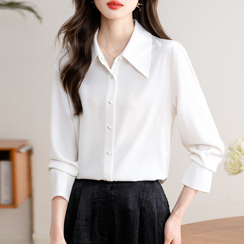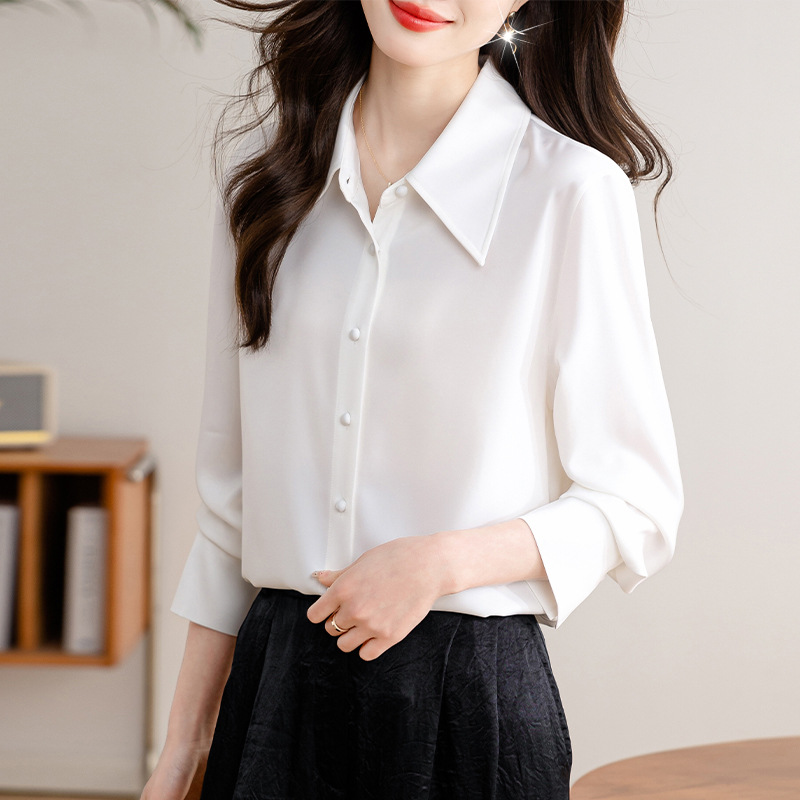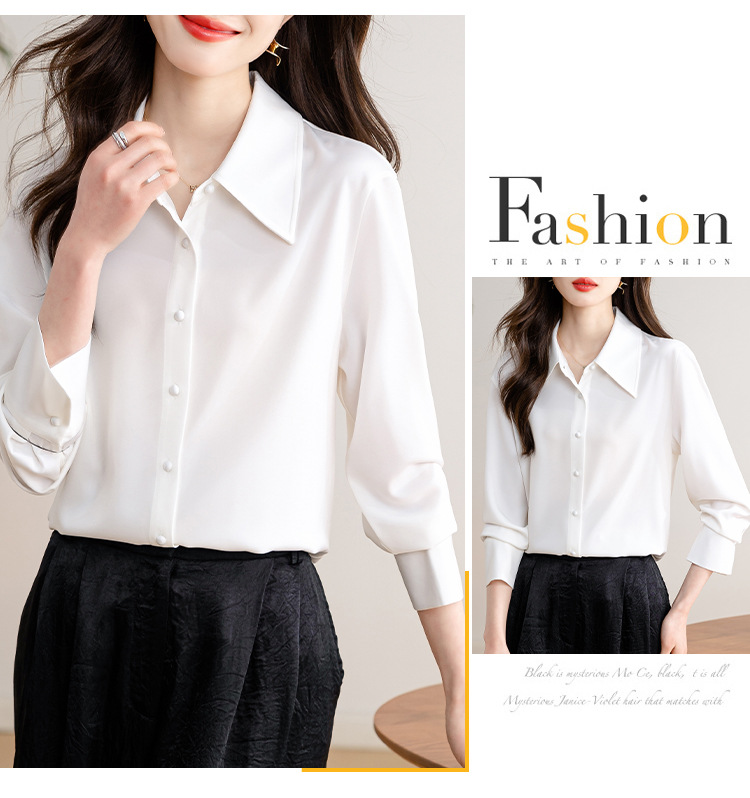 새로운 봄과 여름에 2024 실제 촬영 흰색 긴 소매 새틴 셔츠 여성 봄 기질 전문 슬림 OL 셔츠