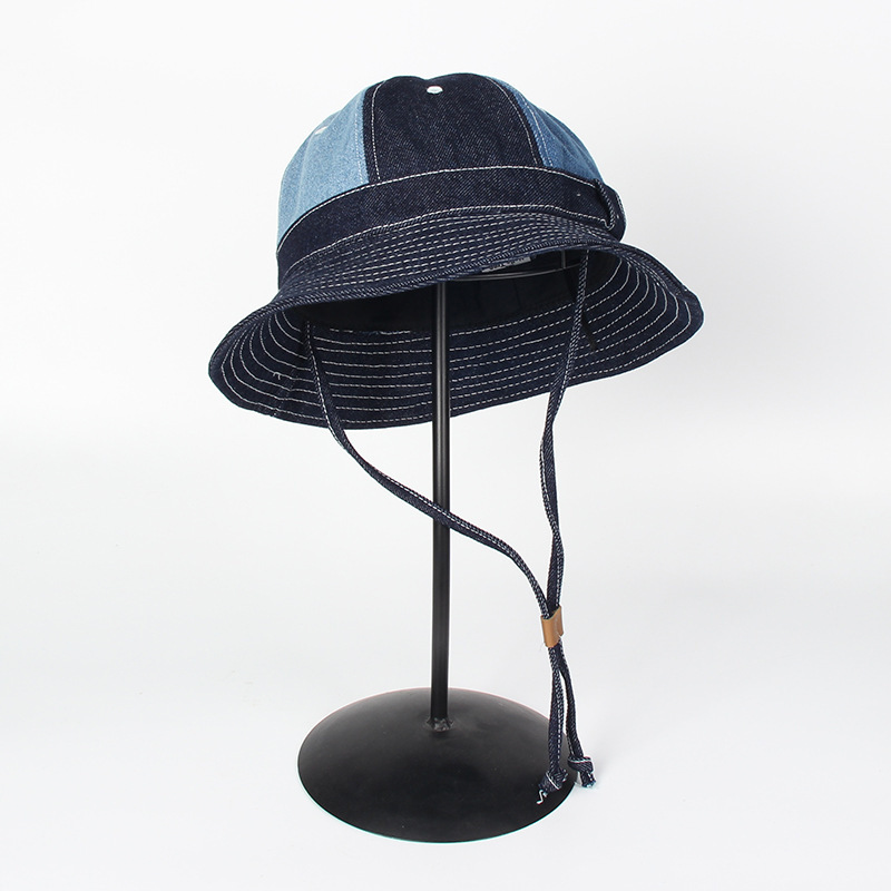 牛仔渔夫帽圆顶拼接盆帽汗带可调节头围带防风绳夏遮阳防晒男女