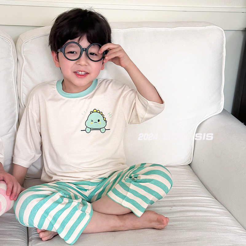 어린이 홈웨어 세트 2024 새 봄과 가을 남학생과 여아 3/4 소매 한국식 여름 모달 파자마