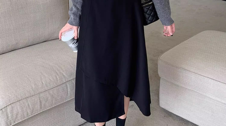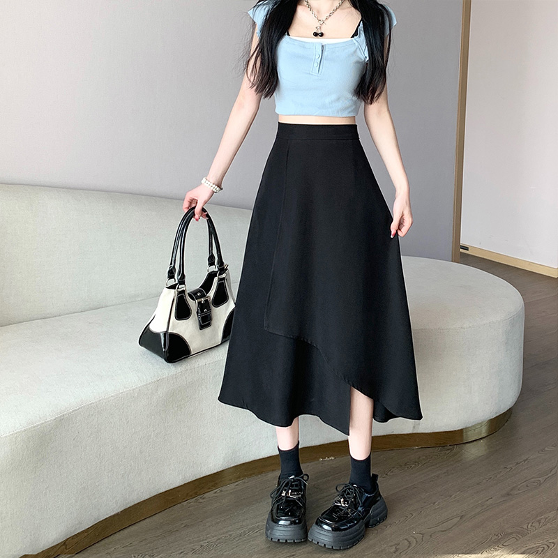 여성용 블랙 스커트 봄과 여름 새로운 높은 허리 슬리밍 느슨한 플러스 사이즈 드레이프 중간 길이 A 라인 불규칙한 스커트스토어 가기