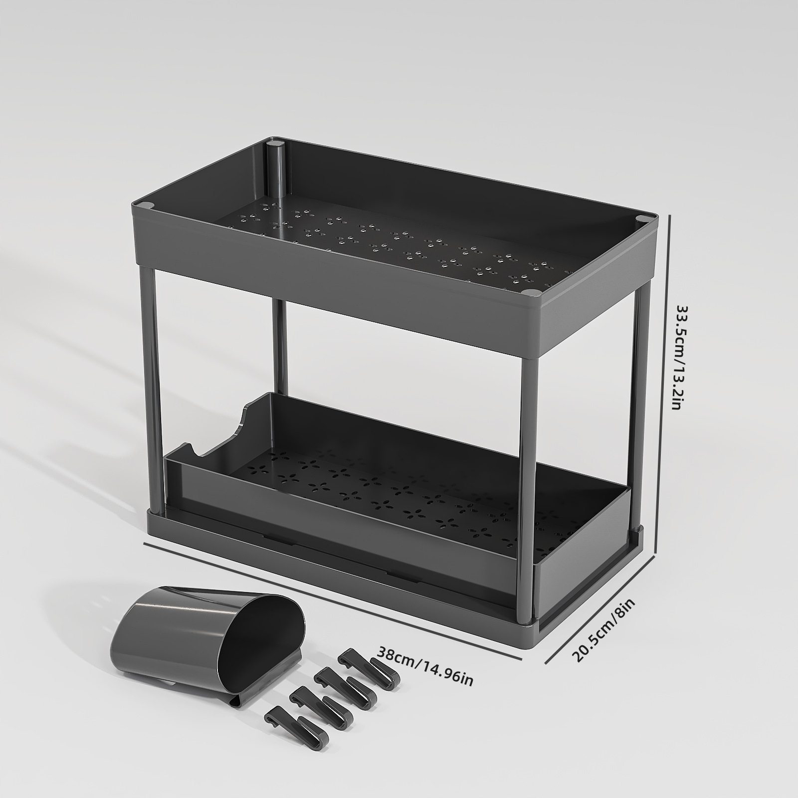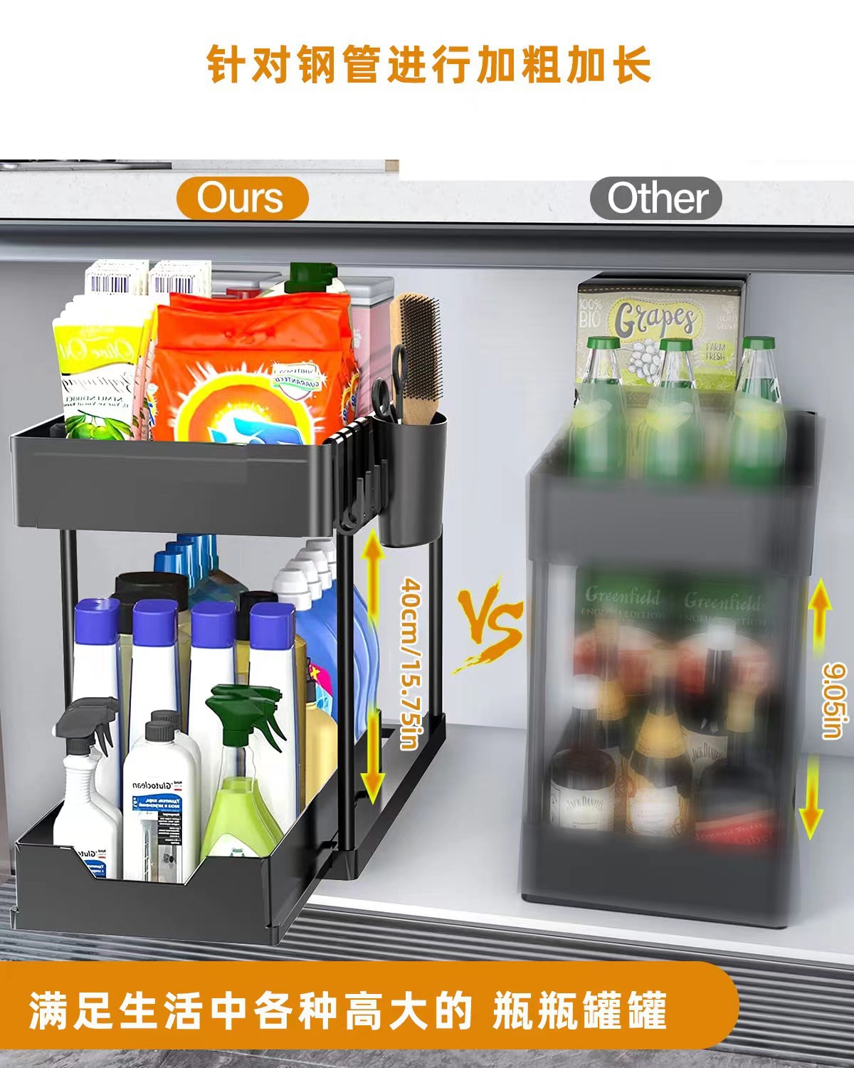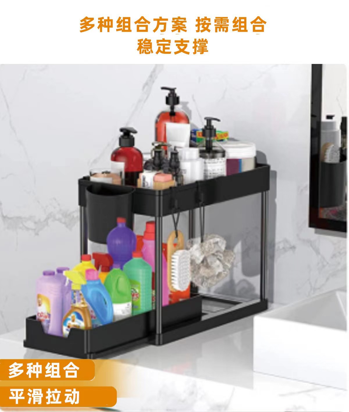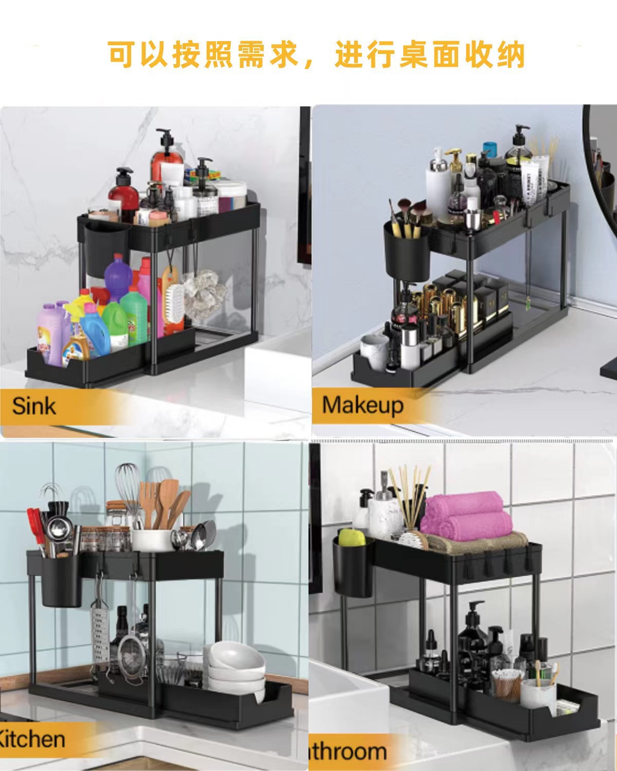 싱크대 아래 침실 및 거실 디스플레이를 위한 국경 간 인기 판매 주방 다기능 풀아웃 스토리지 랙 더블 레이어 스토리지 정리 랙스토어 가기