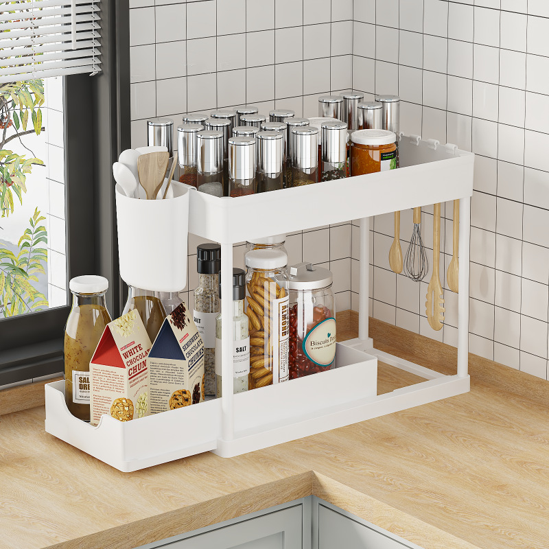 싱크대 아래 침실 및 거실 디스플레이를 위한 국경 간 인기 판매 주방 다기능 풀아웃 스토리지 랙 더블 레이어 스토리지 정리 랙