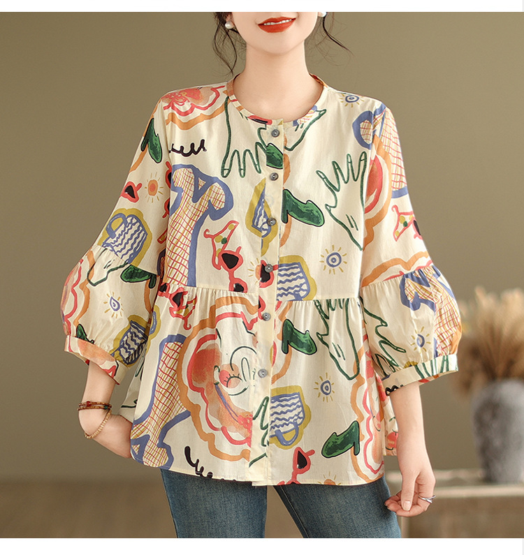 새로운 여성의 3/4 소매 유행 서양식 연령 감소 인형 셔츠 탑 2024 느슨한 배꼽 셔츠 여름스토어 가기