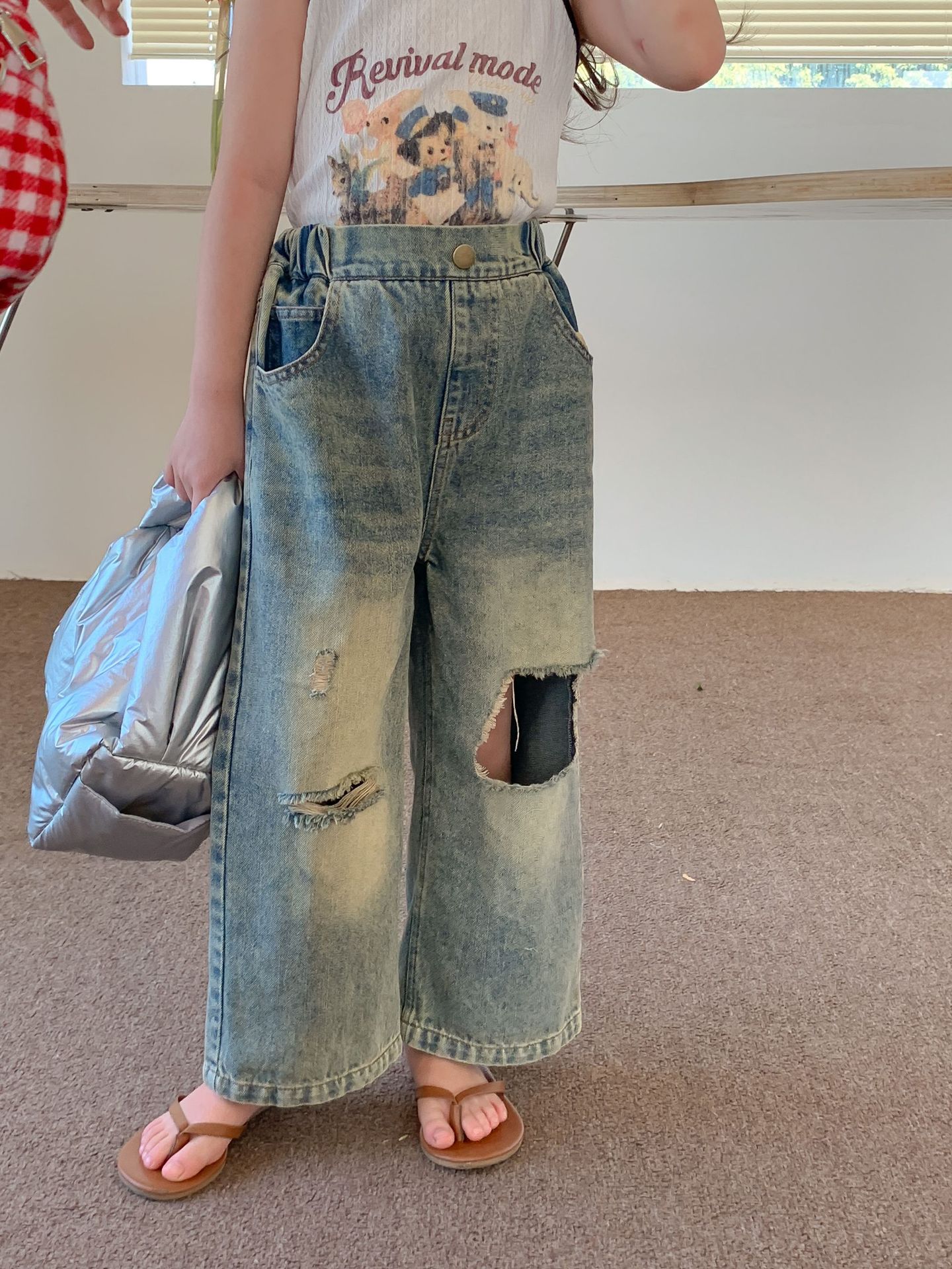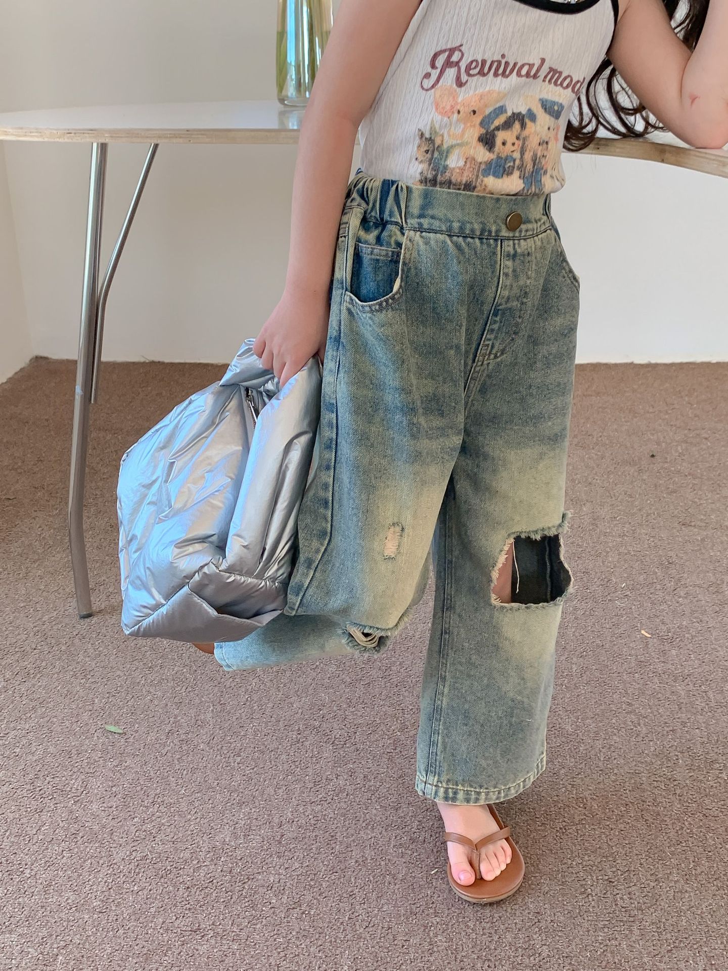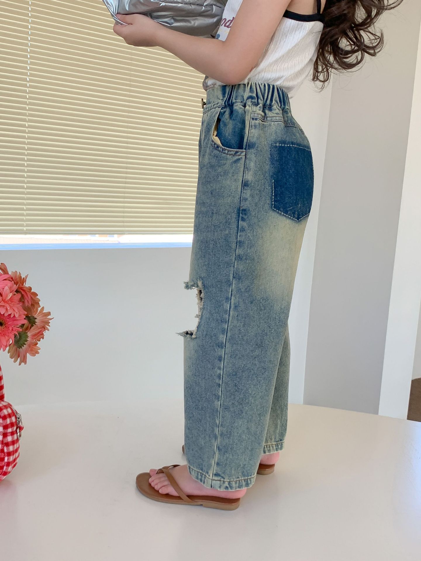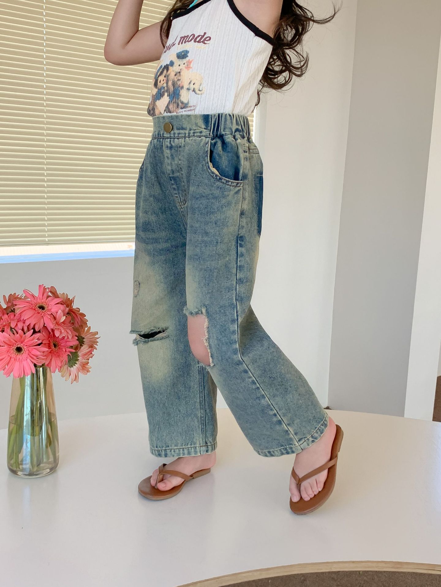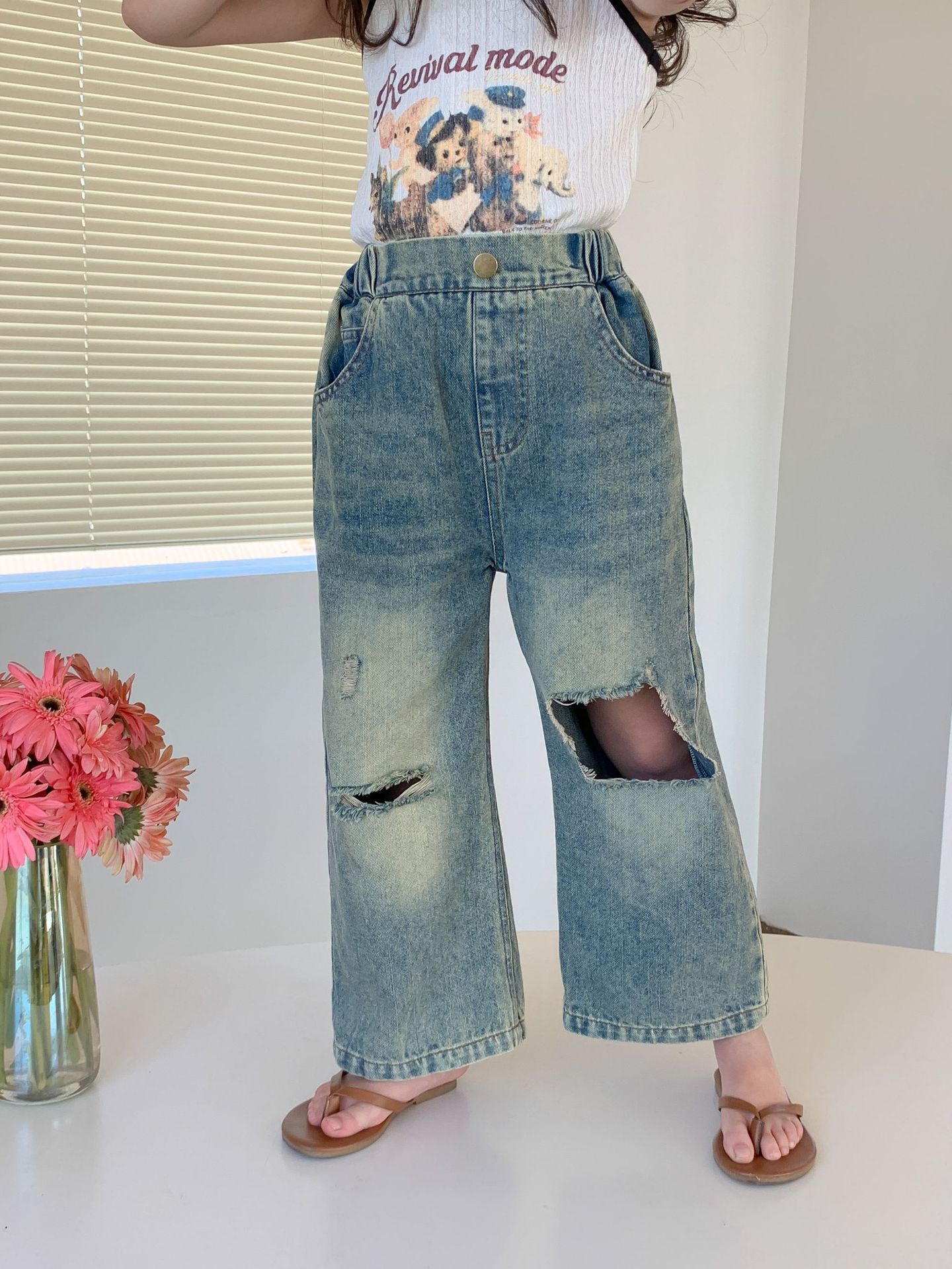 여아 찢어진 레트로 청바지 아동복 2025 여름 유행 스타일의 큰 여아용 팬츠, 어린이 바지스토어 가기