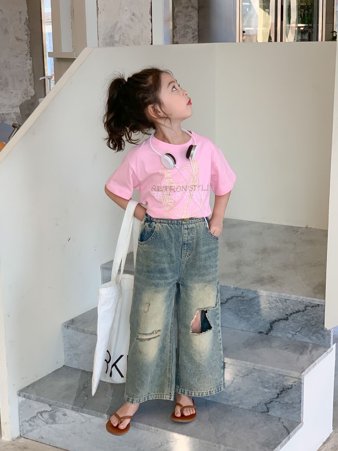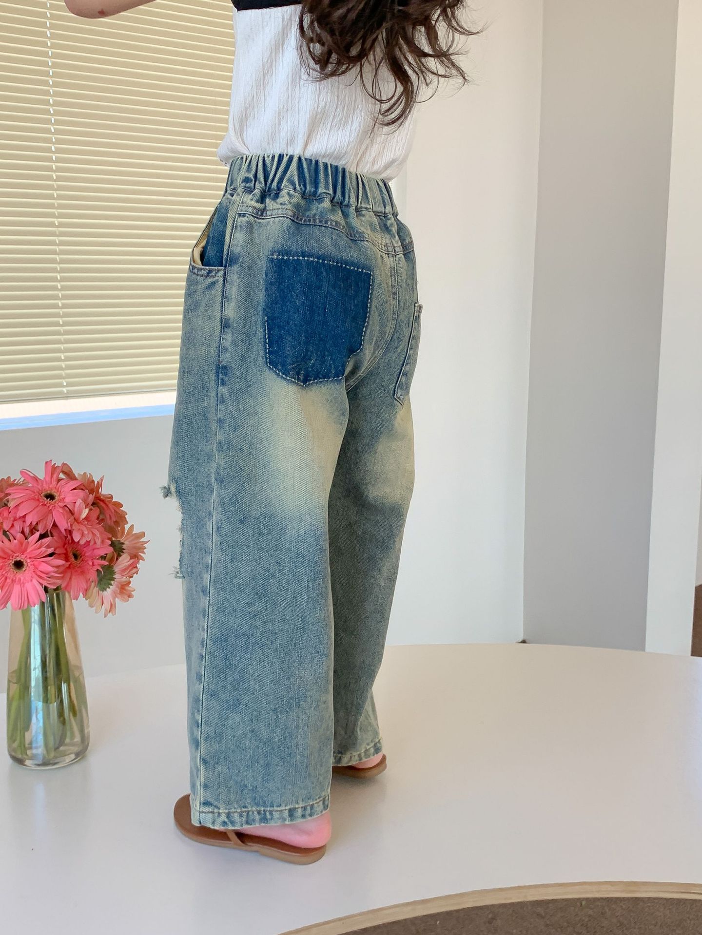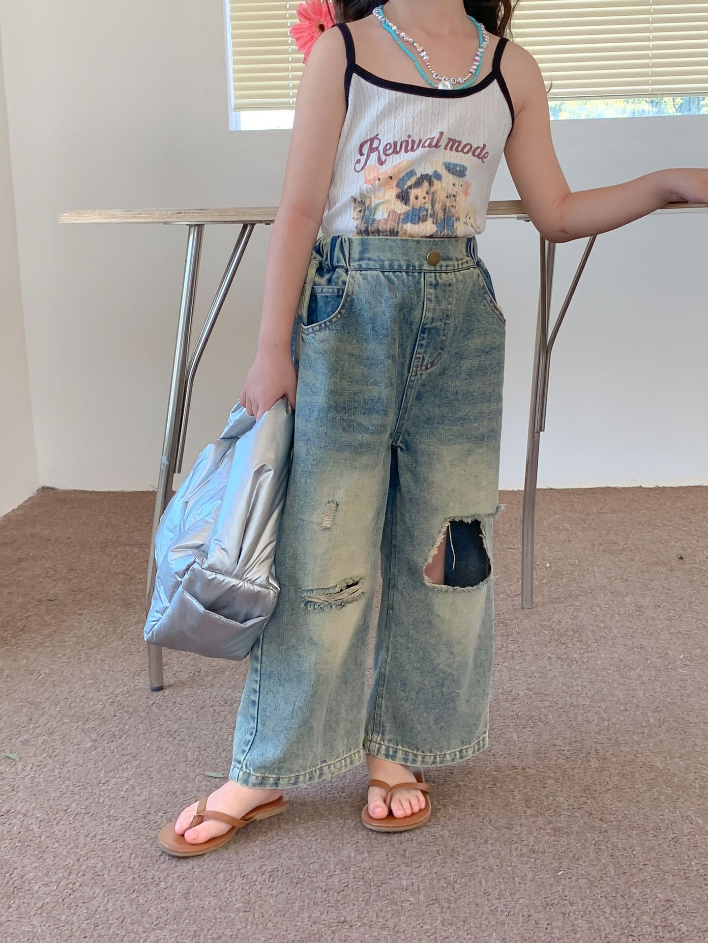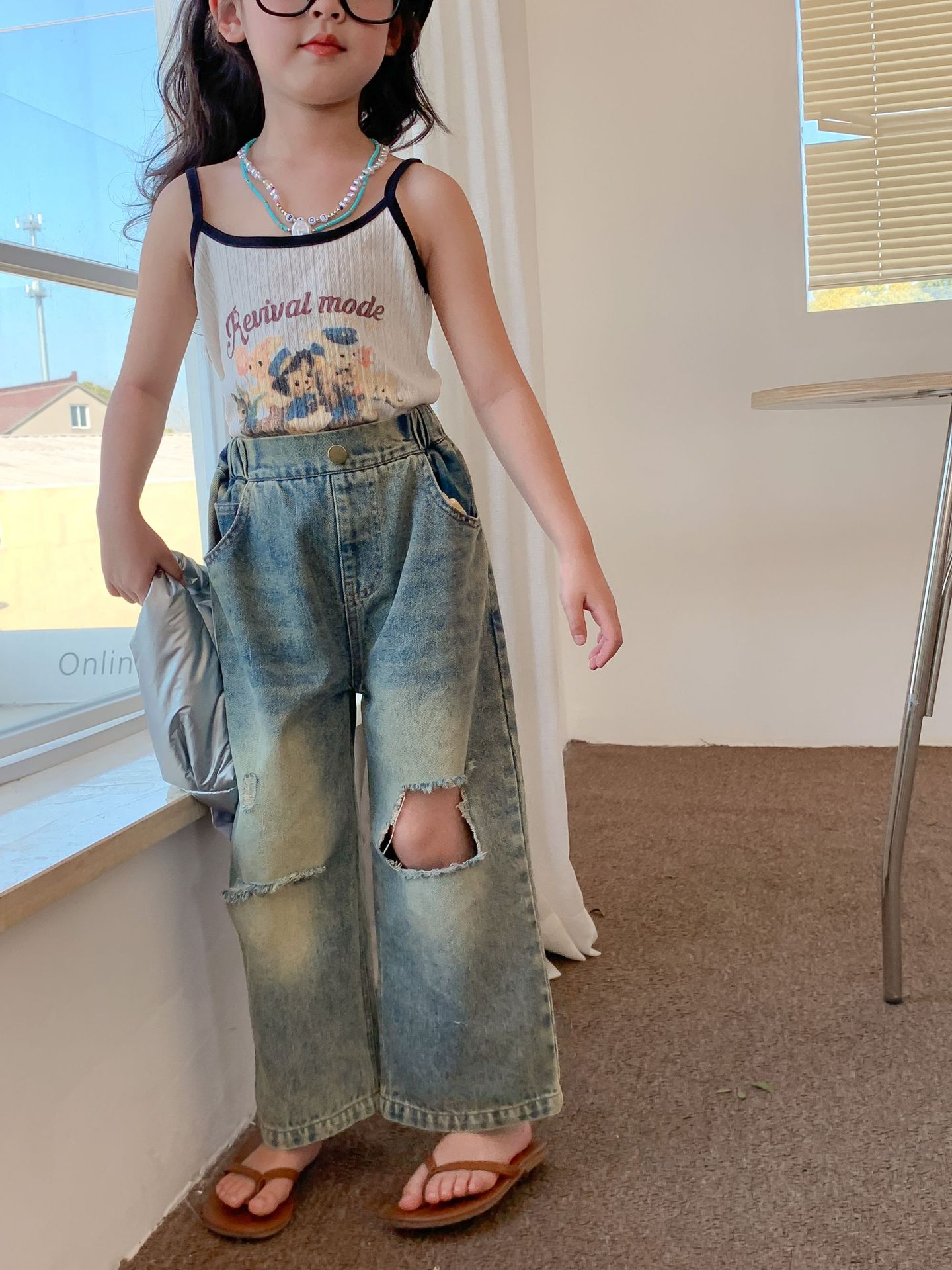 여아 찢어진 레트로 청바지 아동복 2025 여름 유행 스타일의 큰 여아용 팬츠, 어린이 바지스토어 가기