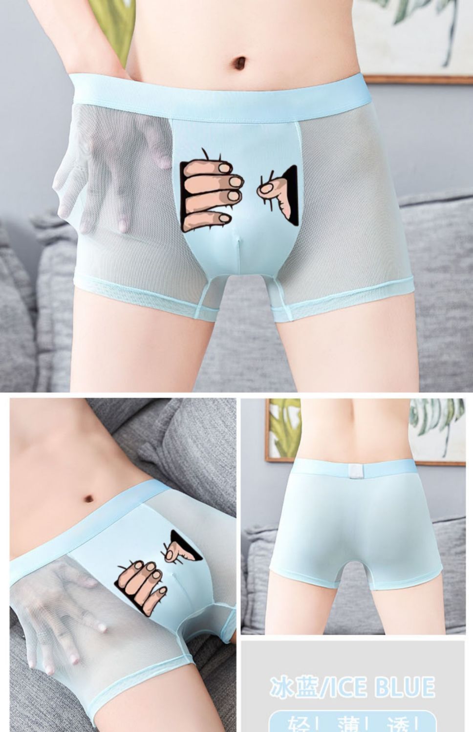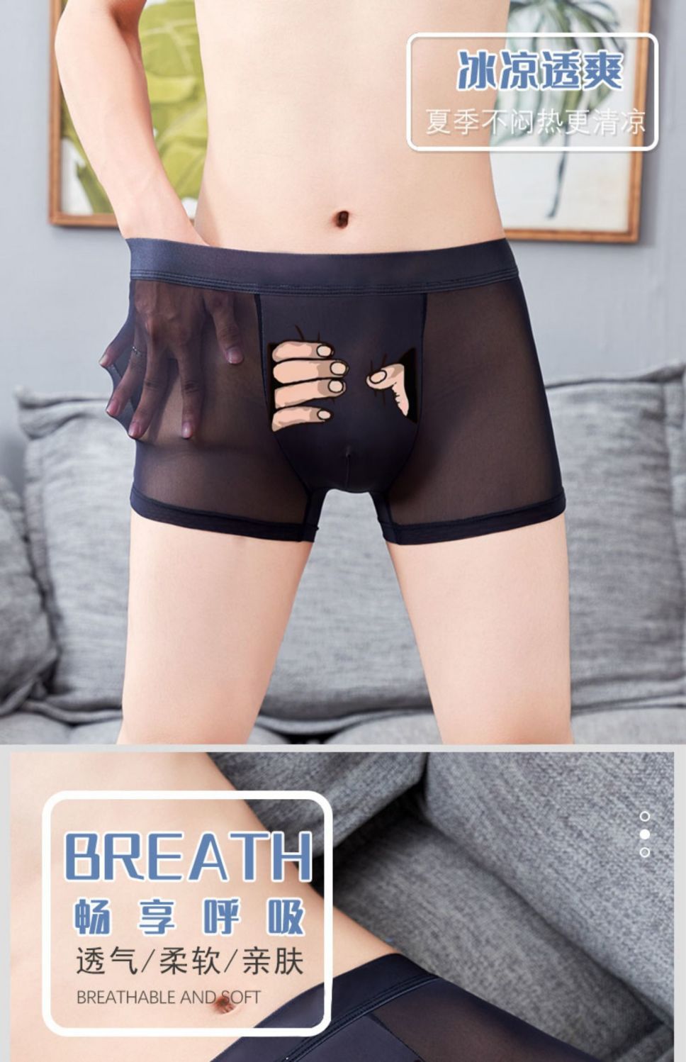 아이스 실크 속옷 남자의 여름 얇은 남자의 네 코너 메쉬 투명한 통기성 창조적 인 재미 있는 성격 남자 바지 여름스토어 가기