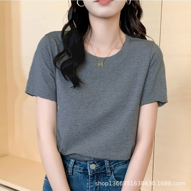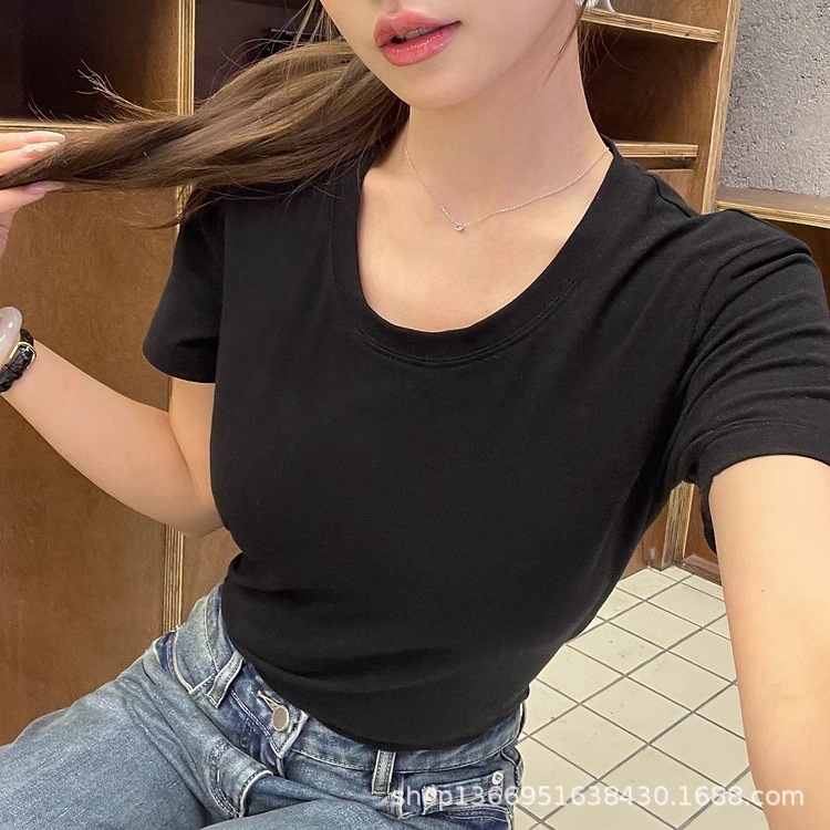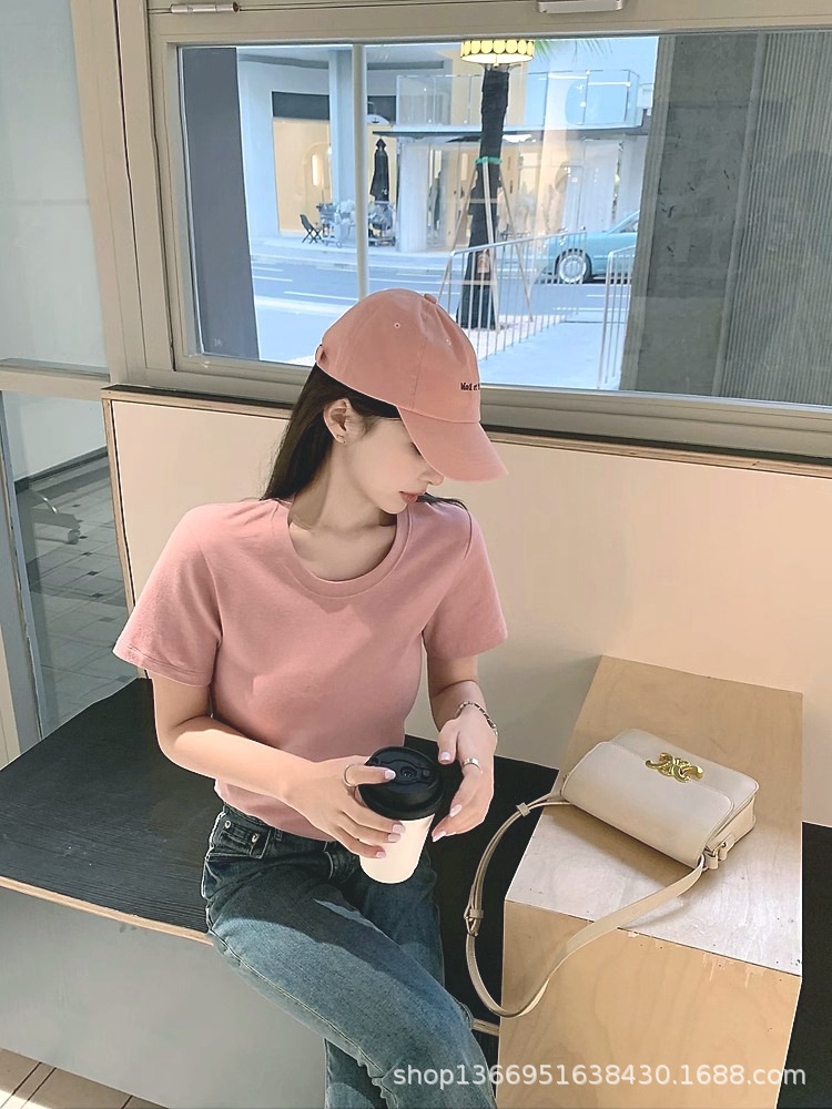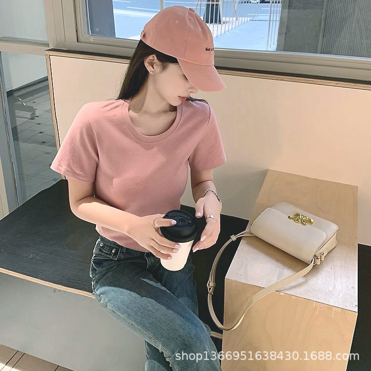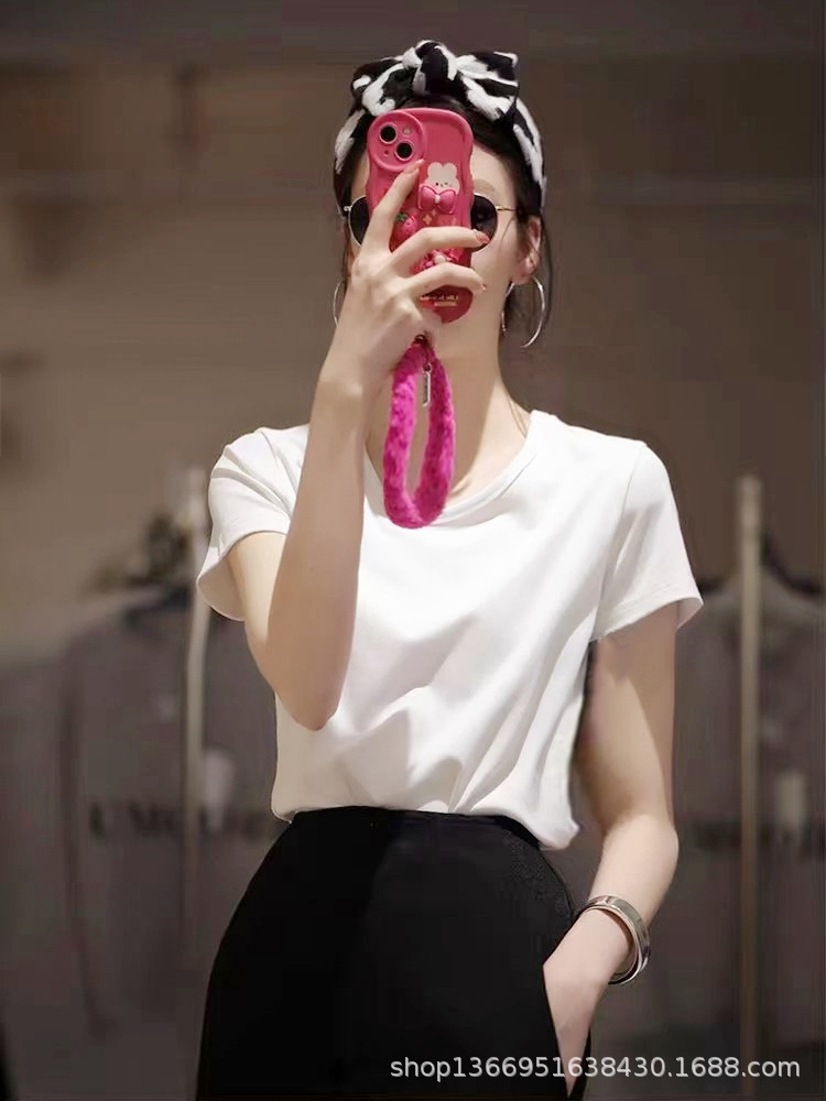 여름 헤비급 수입 페루 코튼 라운드 넥 반팔 티셔츠 여성용 화이트 코튼 슬림 피트 한국 스타일 바닥 오른쪽 어깨 작은 U 넥