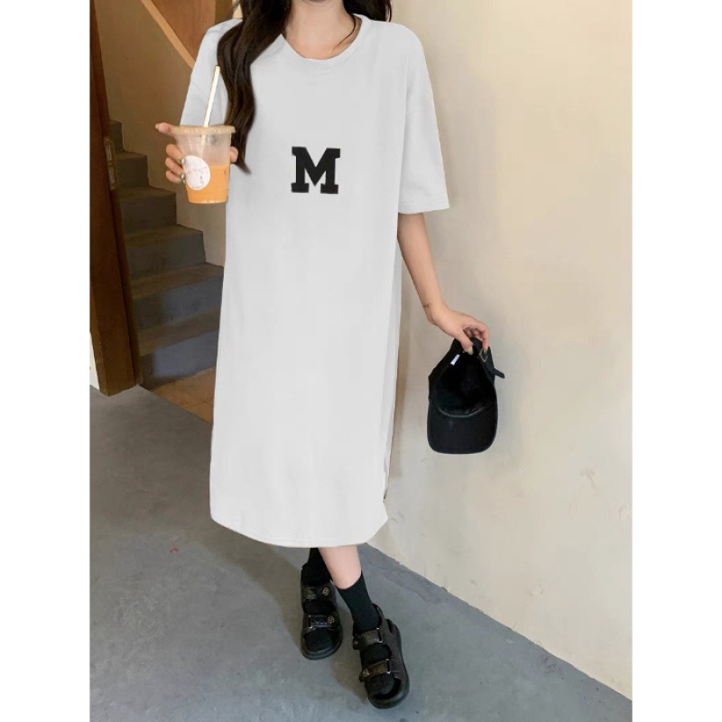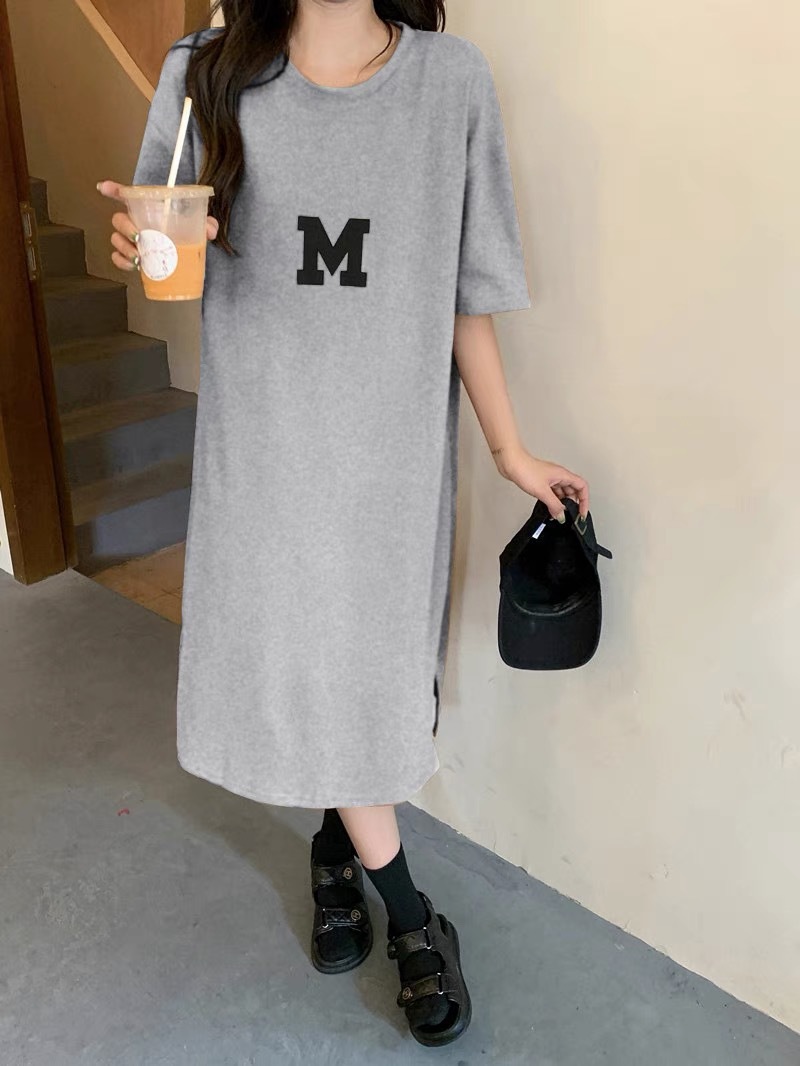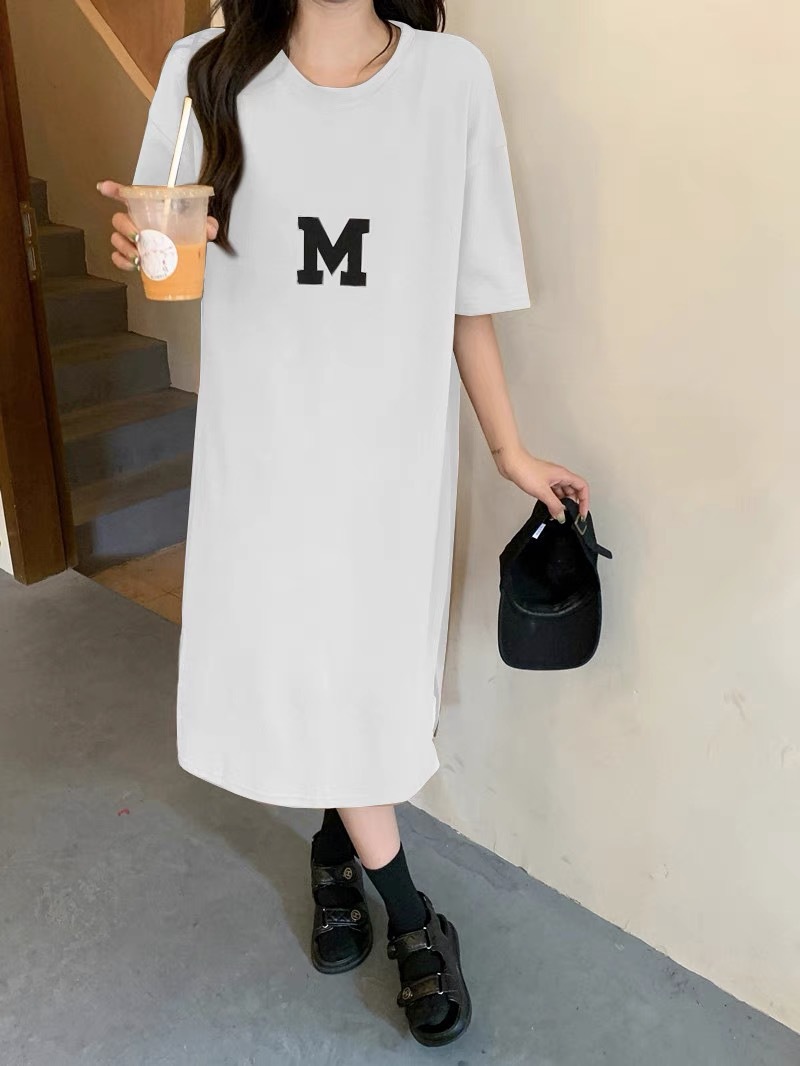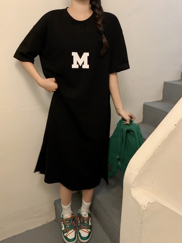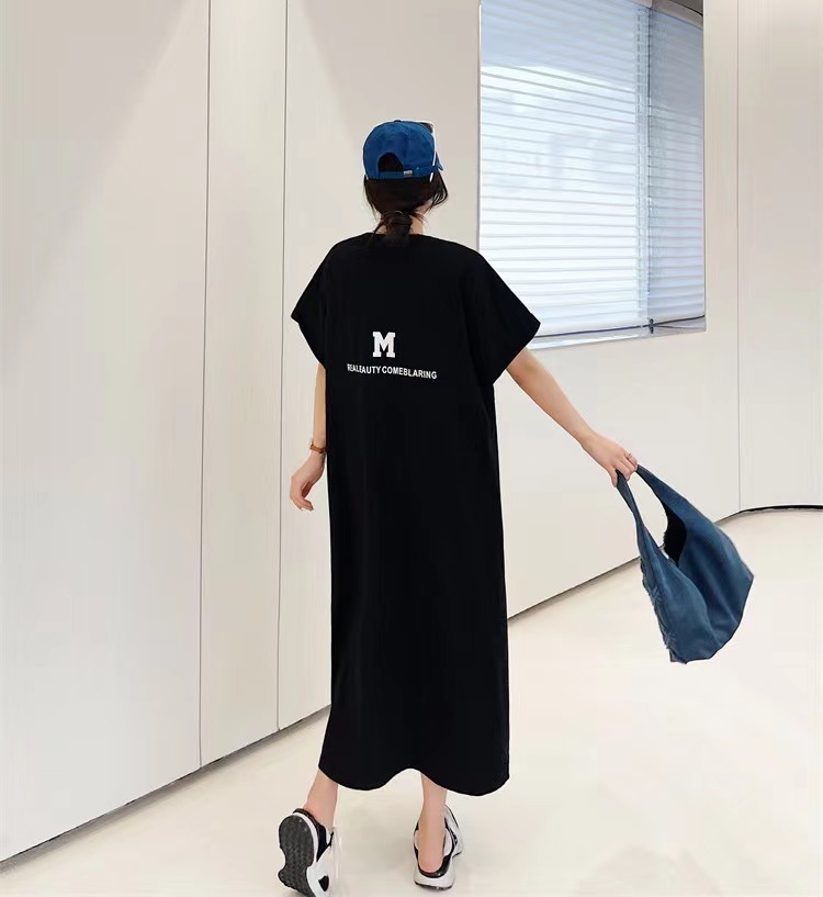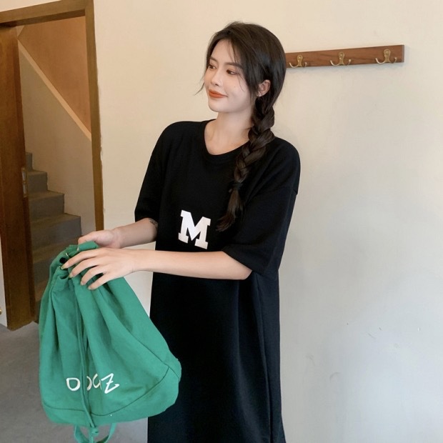 한국식 여름 2023 새로운 느슨한 플러스 사이즈 긴 무릎 둥근 목 티셔츠 캐주얼 개성 게으른 여성 스커트