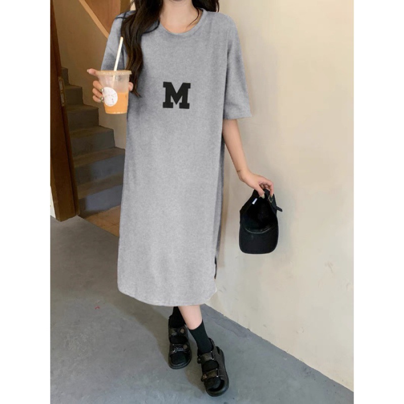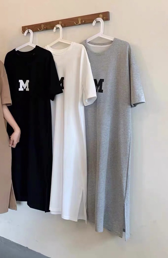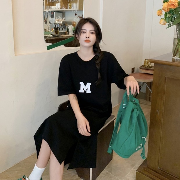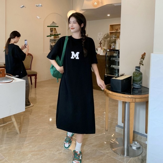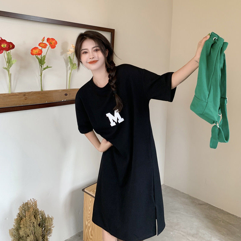 한국식 여름 2023 새로운 느슨한 플러스 사이즈 긴 무릎 둥근 목 티셔츠 캐주얼 개성 게으른 여성 스커트스토어 가기