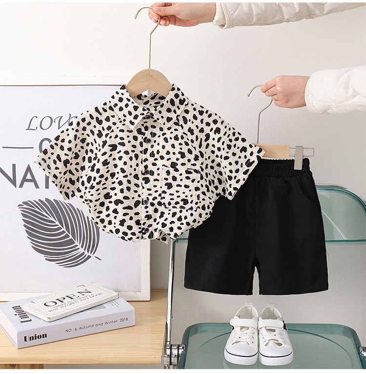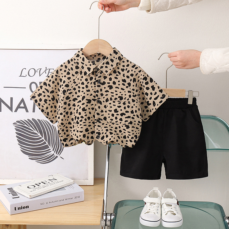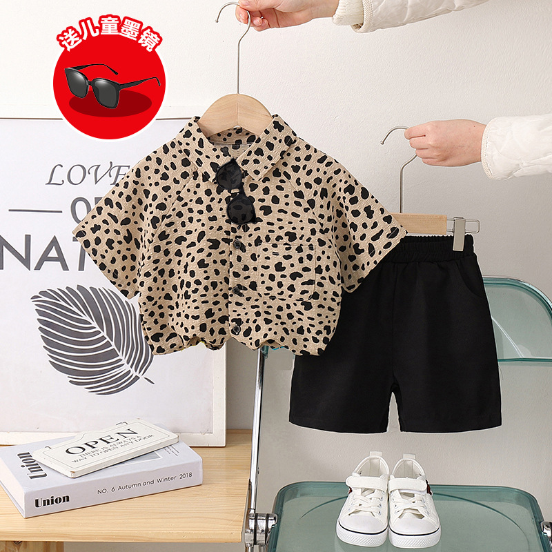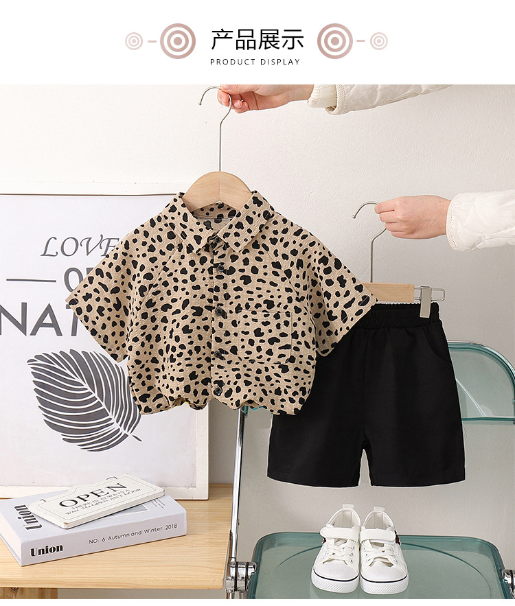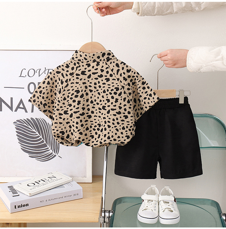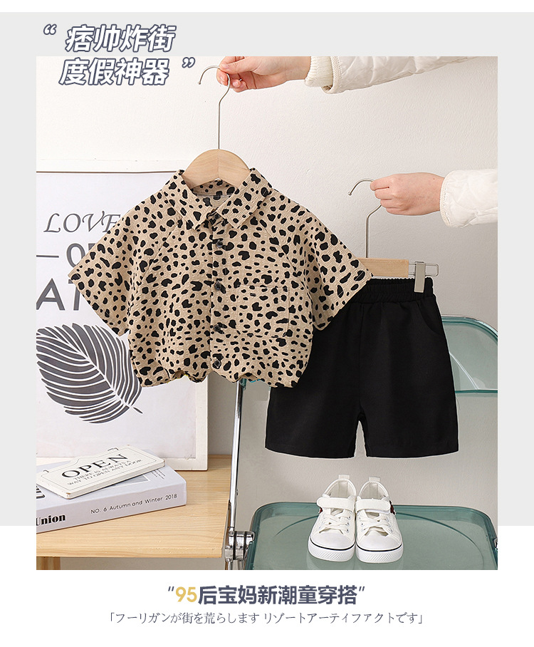 아동복 아동복 여름 신작 홍콩 스타일 잘 생긴 캐주얼 소년 소녀 반팔 3 색 표범 무늬 얇은 셔츠 반바지스토어 가기