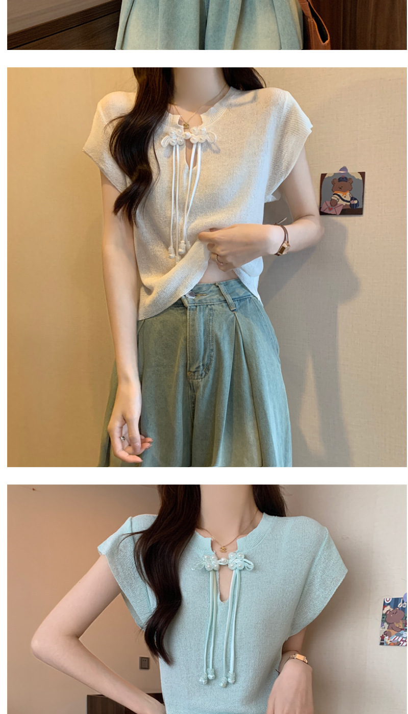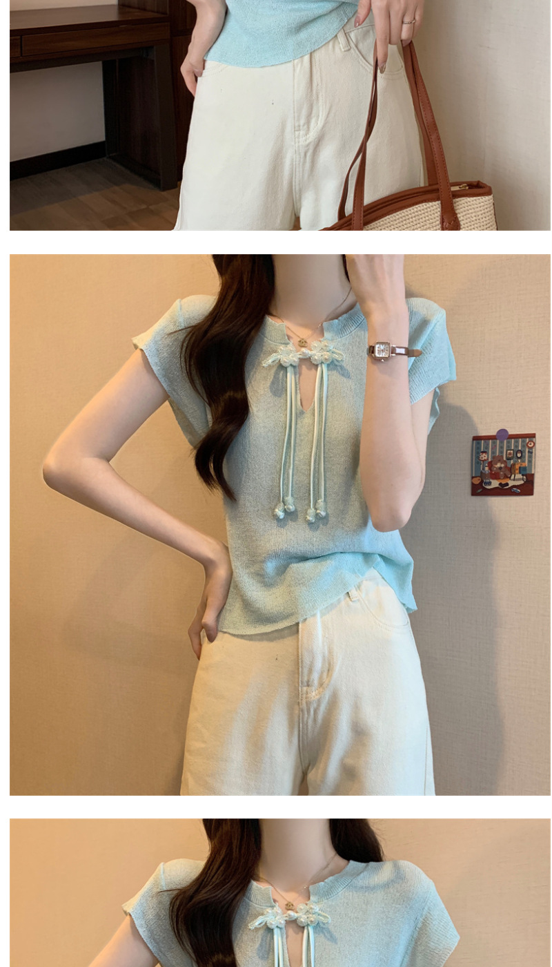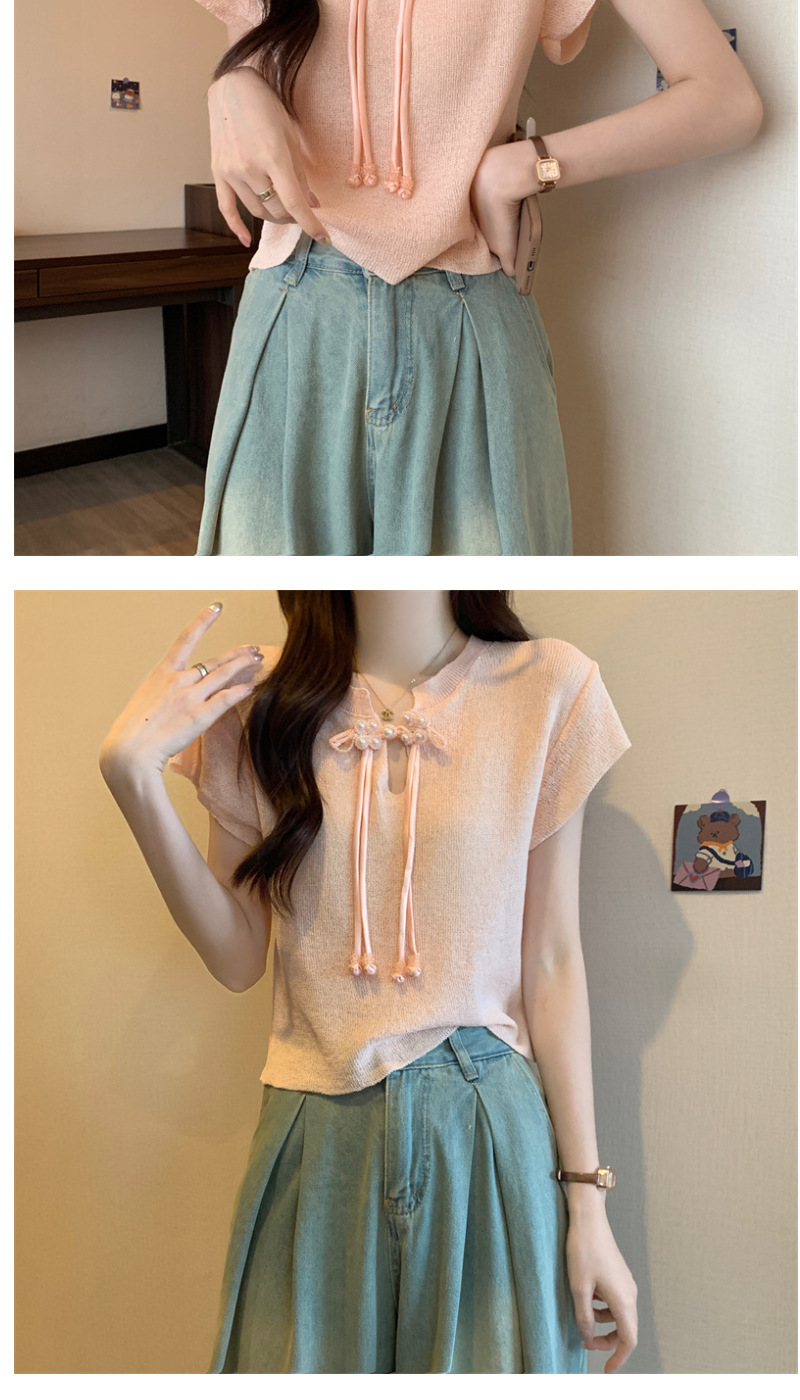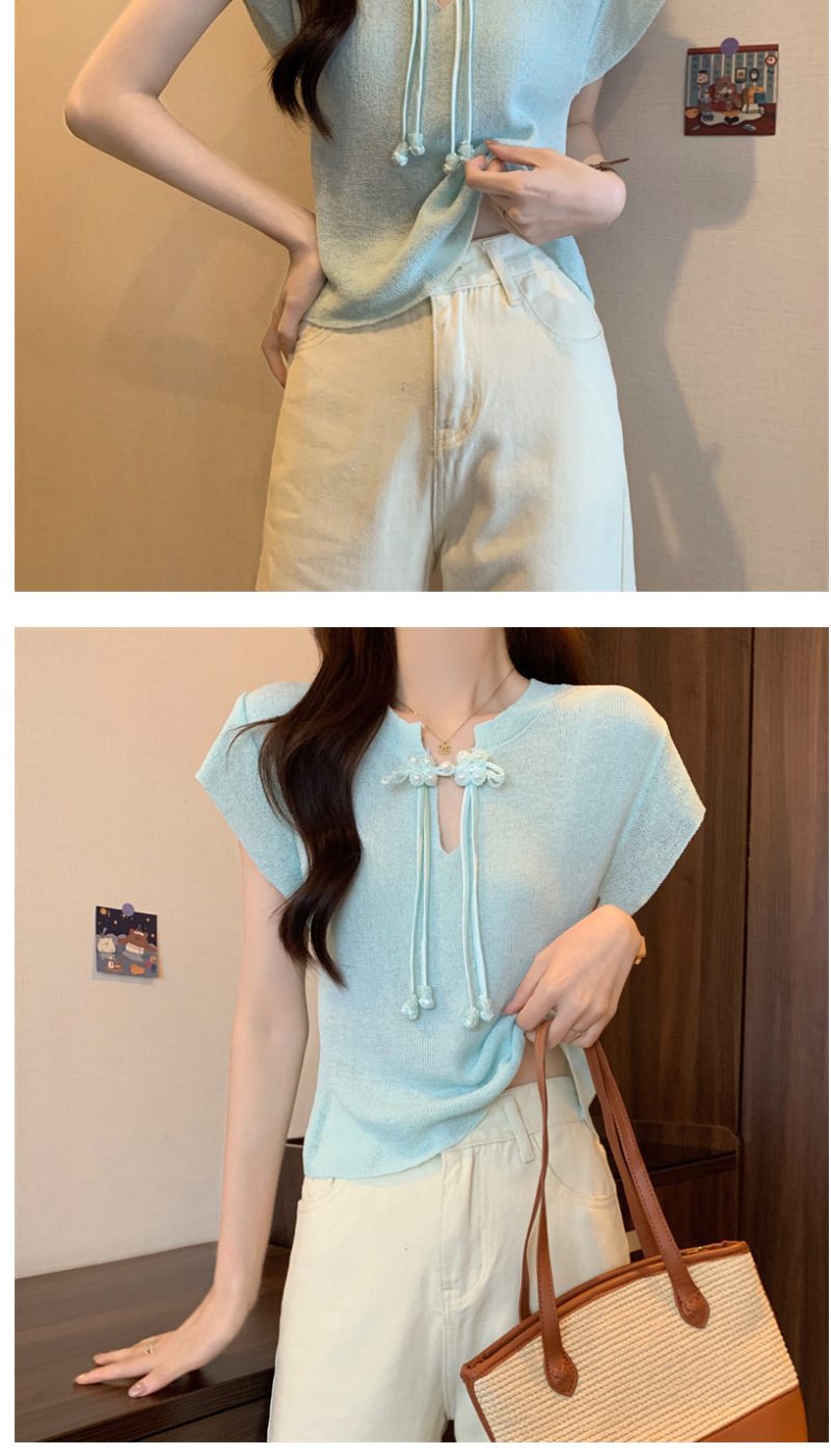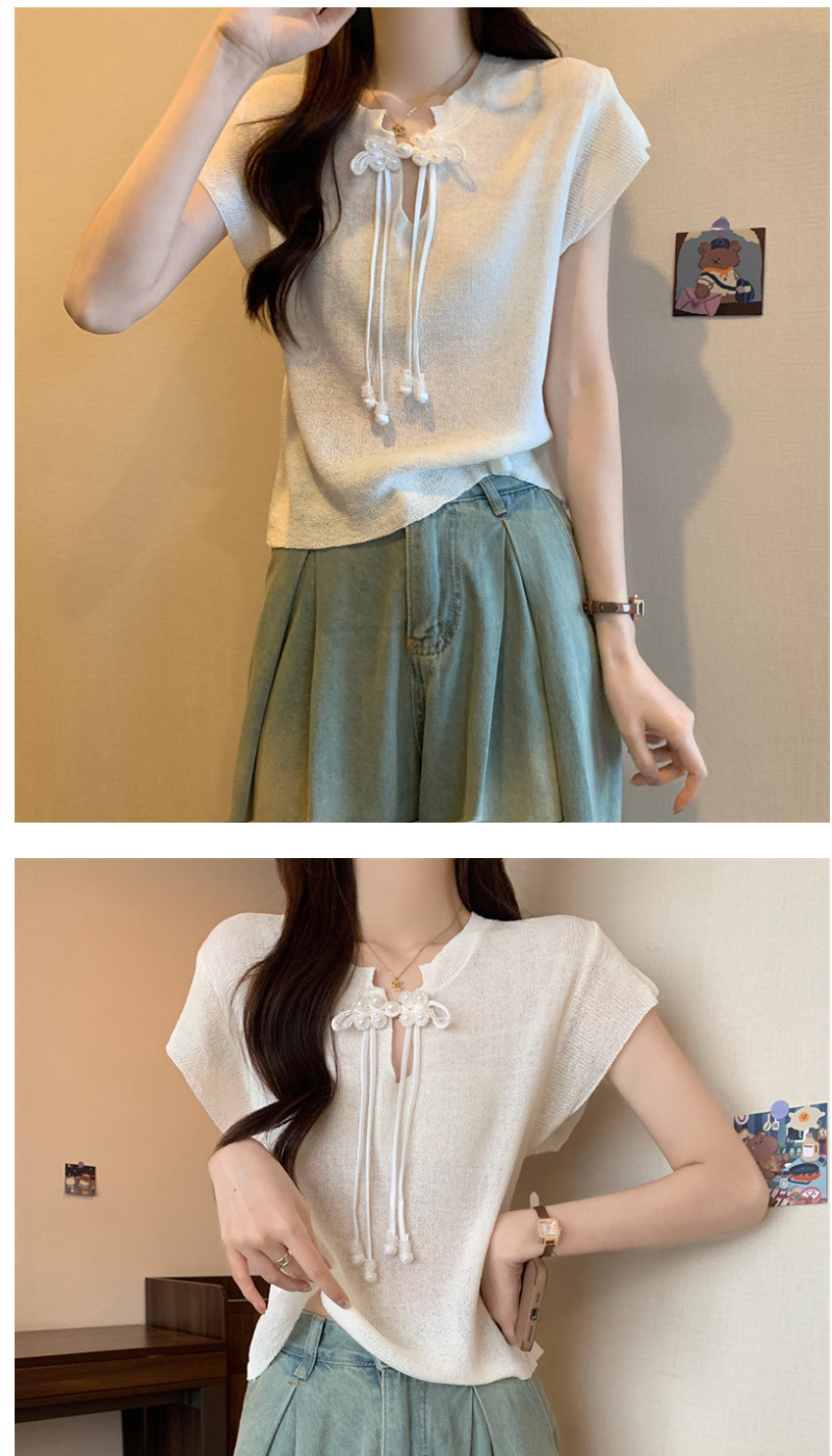 새로운 중국 스타일 버클 니트 반팔 티셔츠 여성 의류 2024 새로운 슬림 핏 디자인 감각 여름 다목적 탑 패션스토어 가기