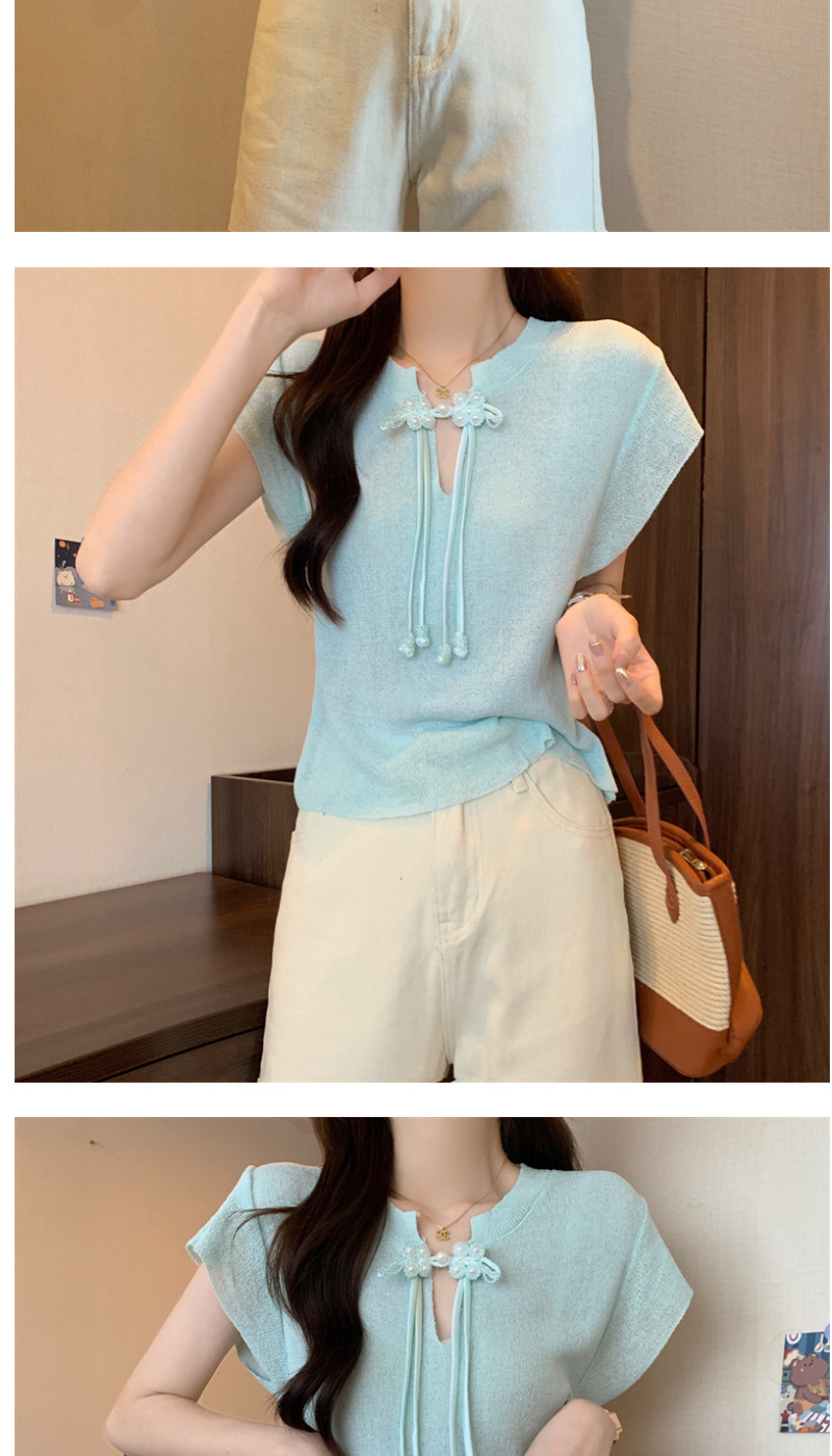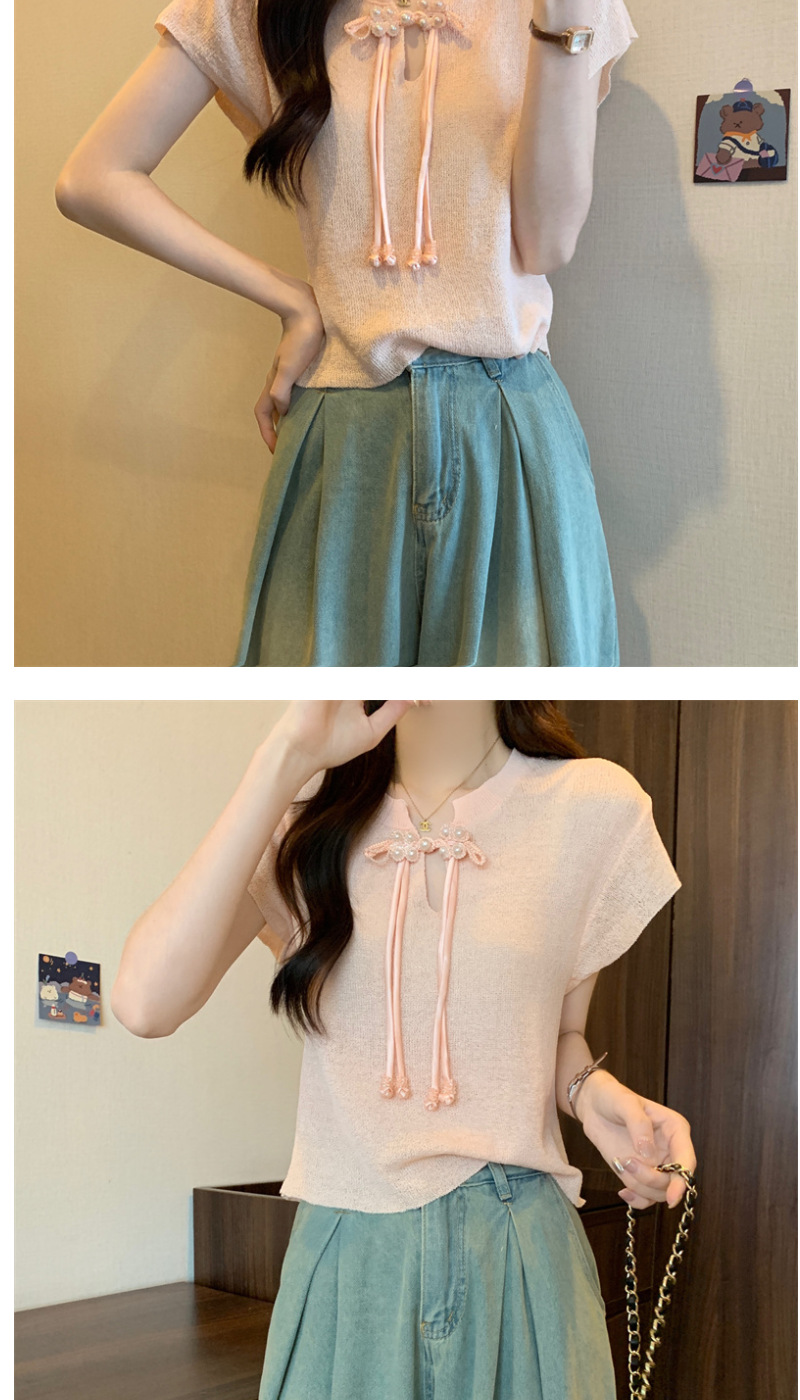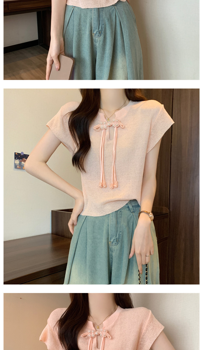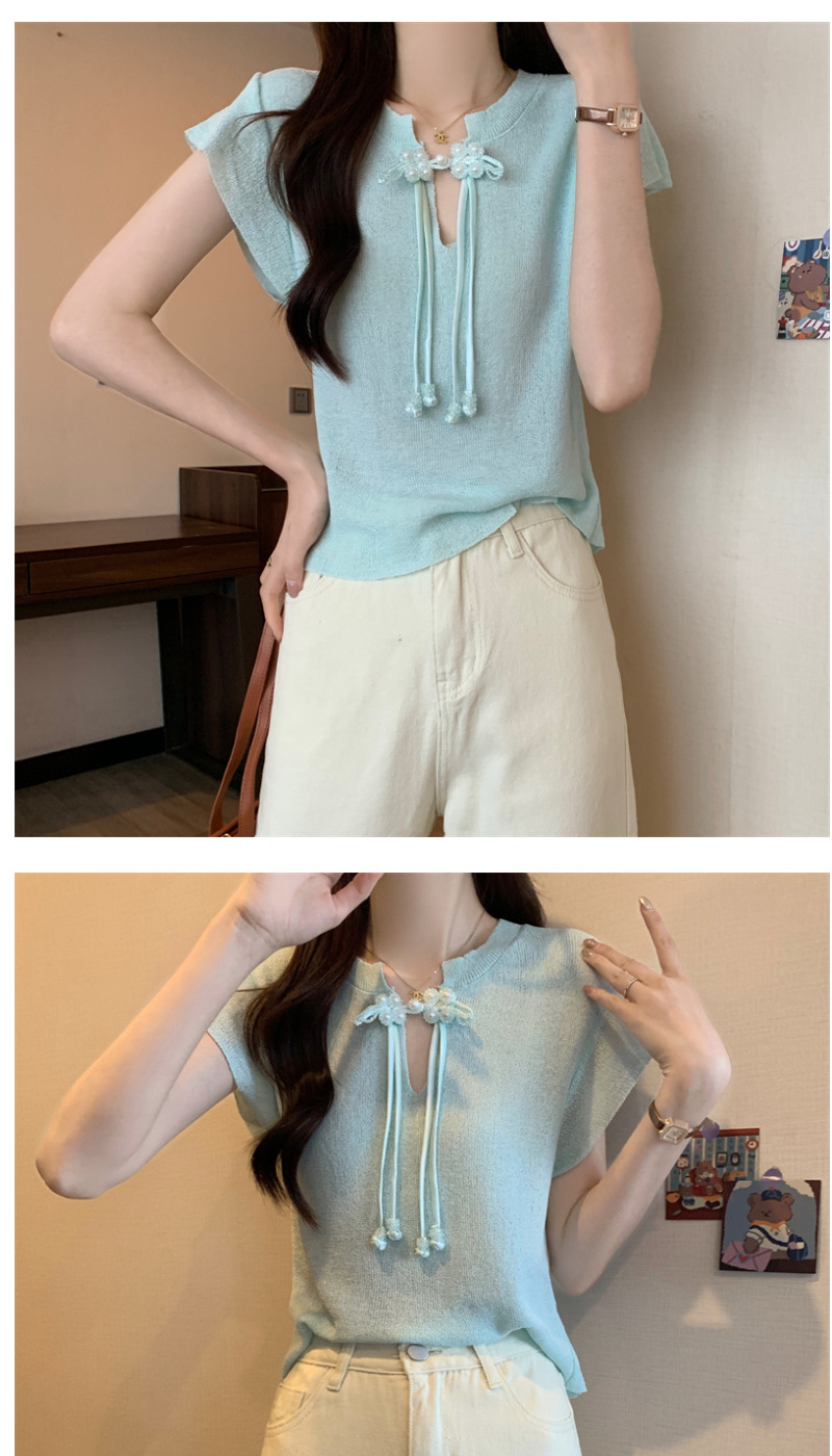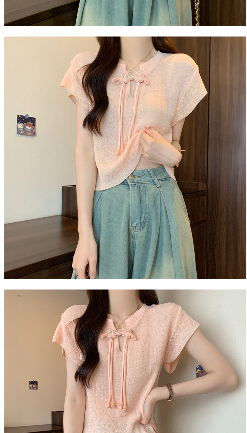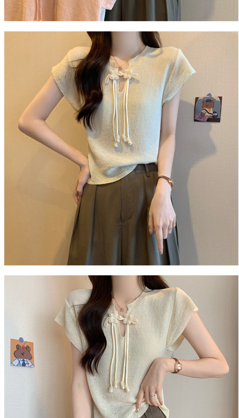 새로운 중국 스타일 버클 니트 반팔 티셔츠 여성 의류 2024 새로운 슬림 핏 디자인 감각 여름 다목적 탑 패션스토어 가기