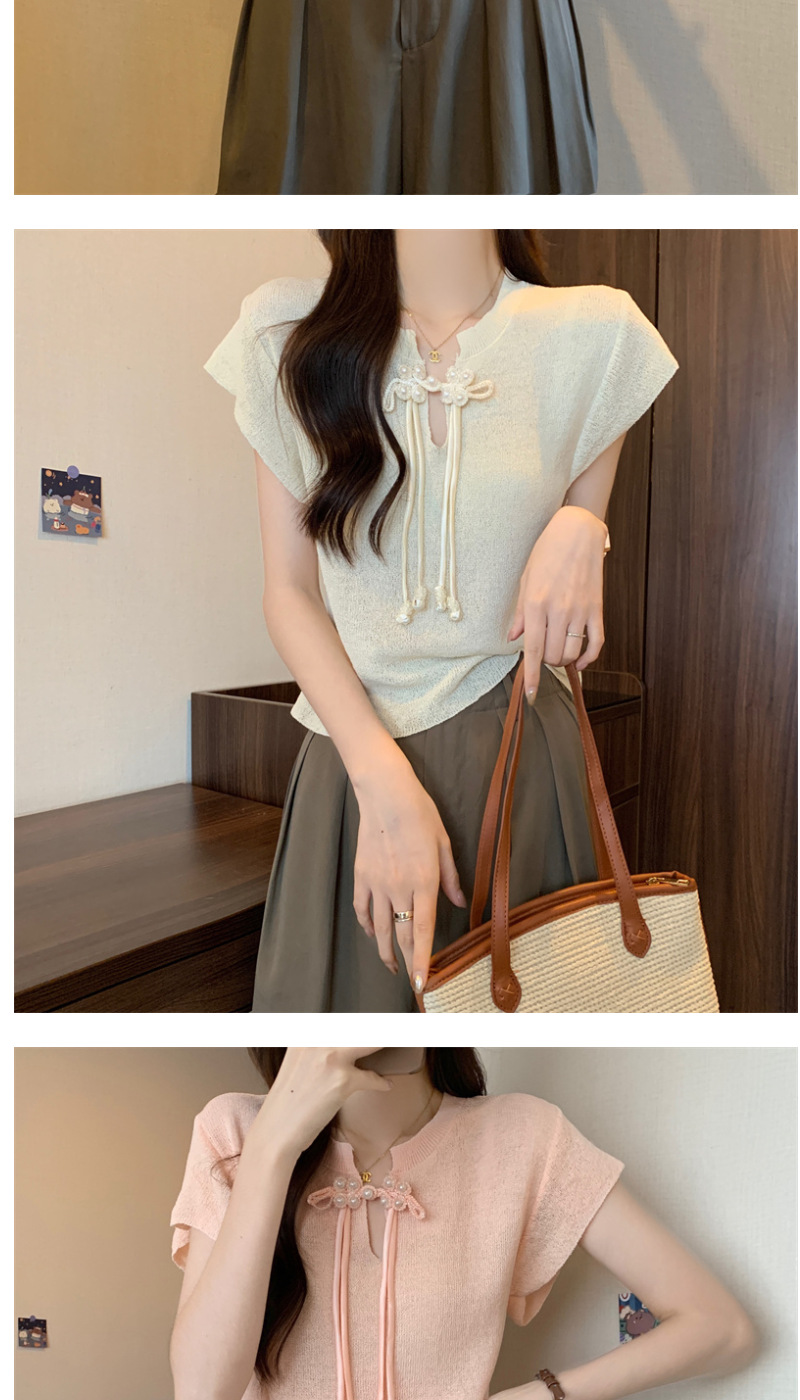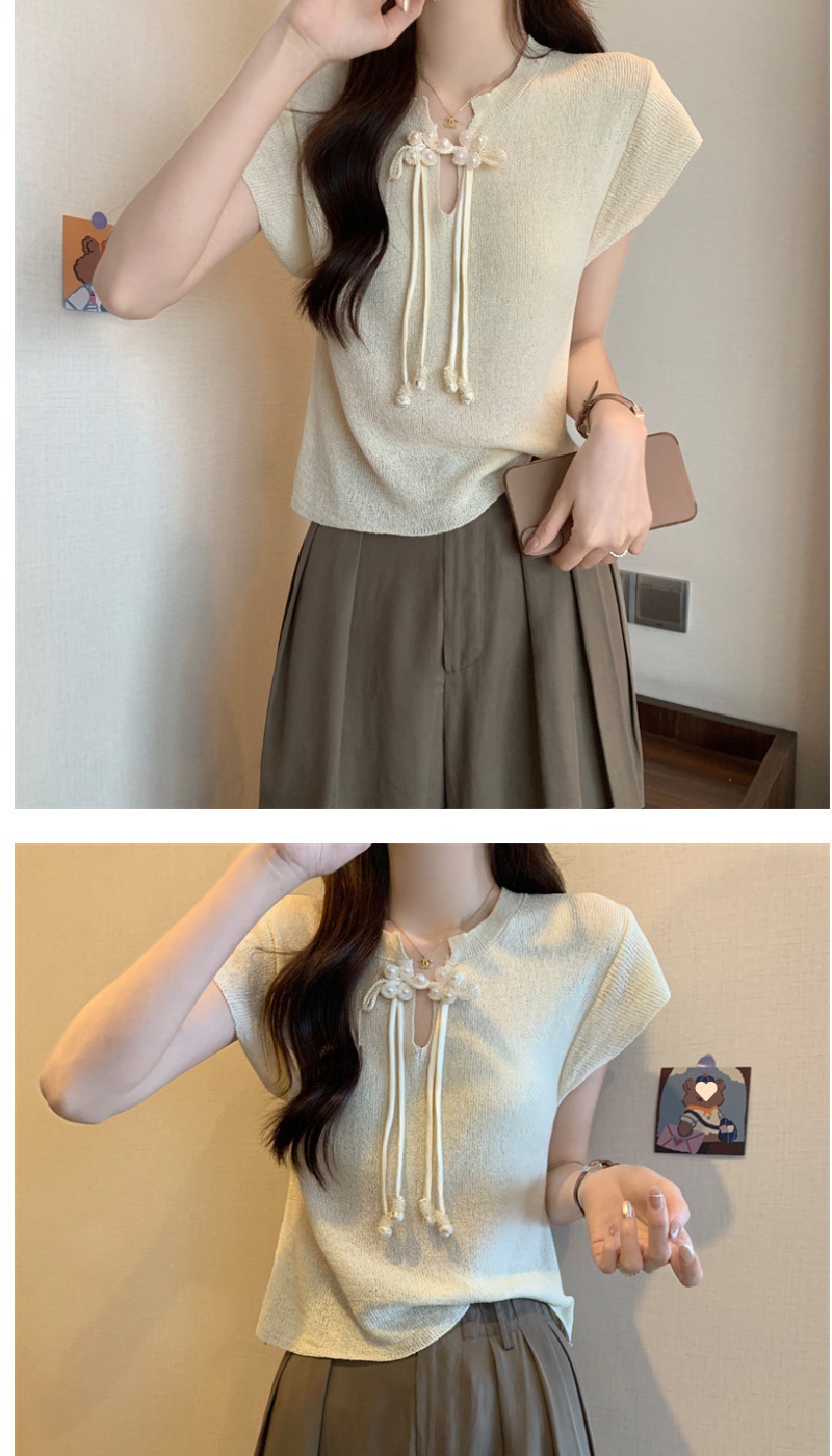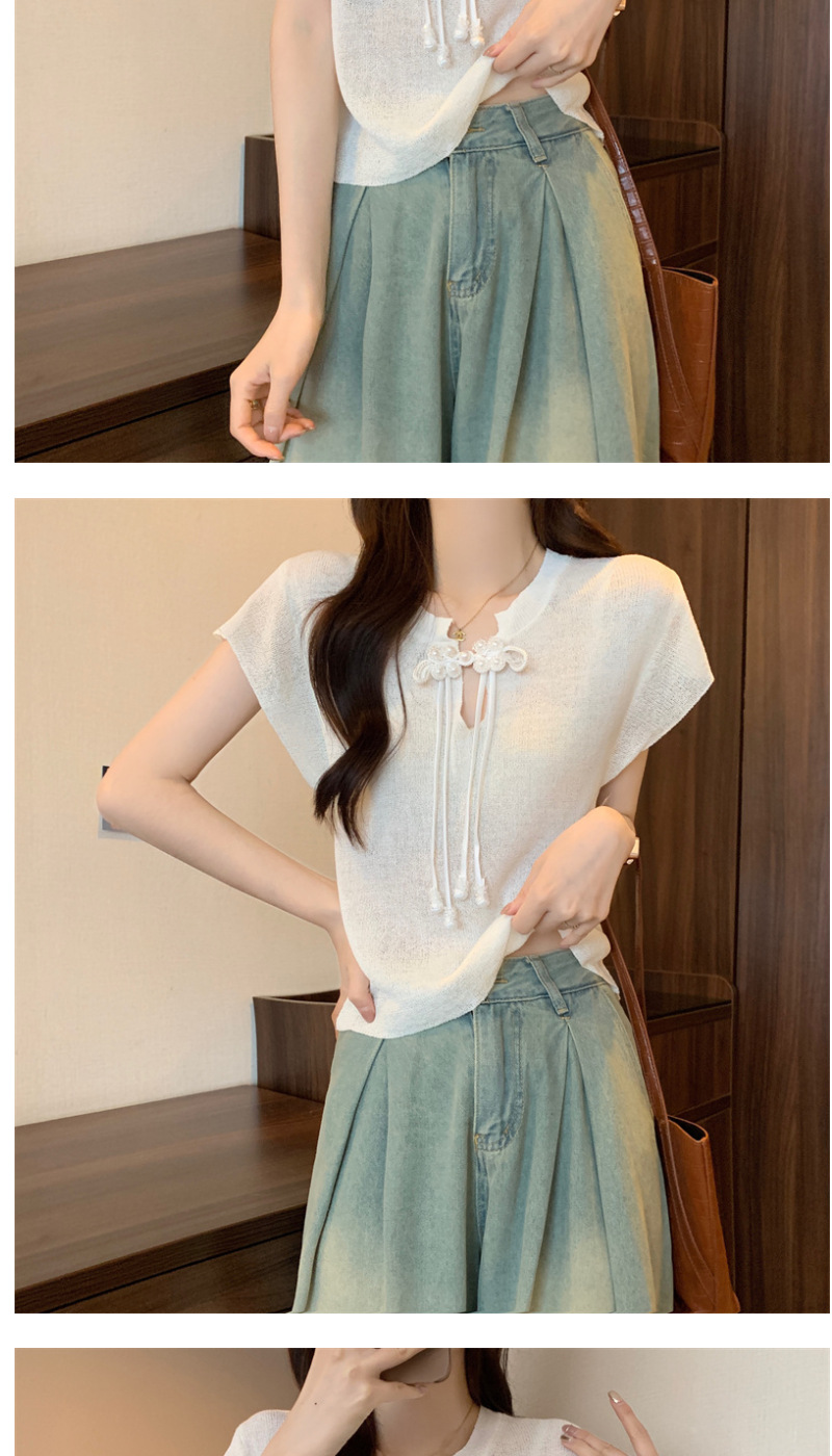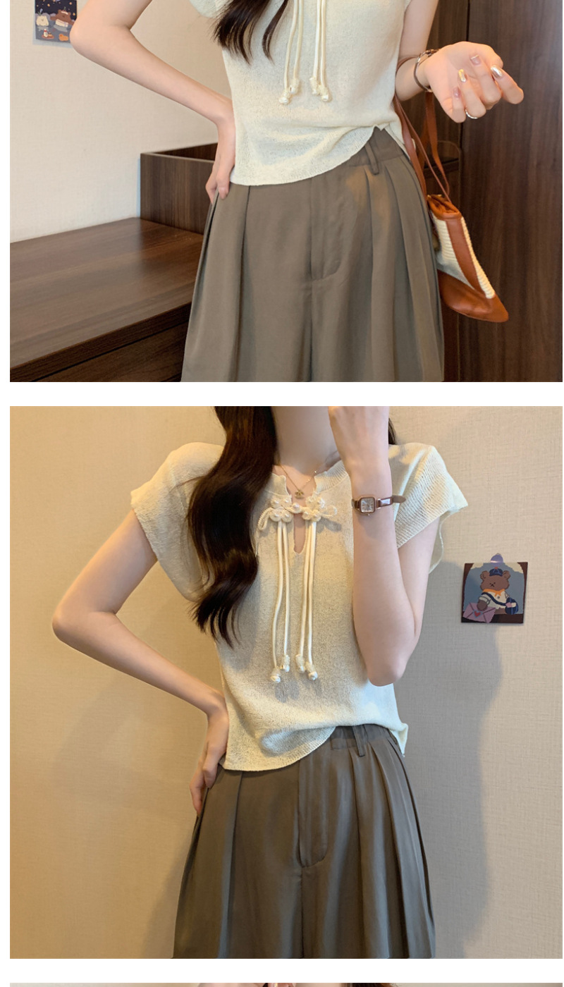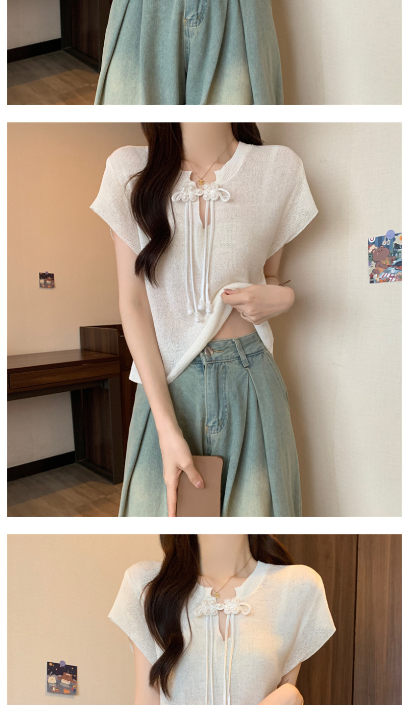 새로운 중국 스타일 버클 니트 반팔 티셔츠 여성 의류 2024 새로운 슬림 핏 디자인 감각 여름 다목적 탑 패션스토어 가기