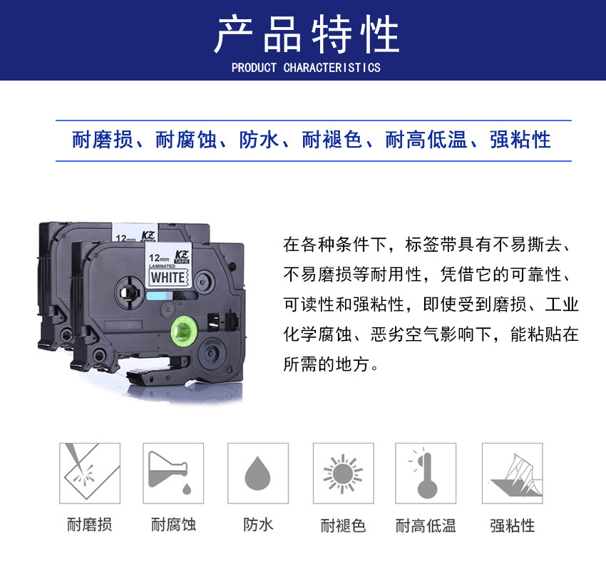 产品特点:覆膜强粘性色带,此型号色带具有防水、防油污、耐高温、耐腐蚀、耐磨损等特点,不易褪色。室内外都可使用,一直应用于通信,电力,图书馆,医院等。