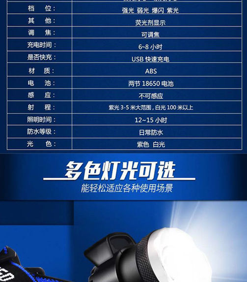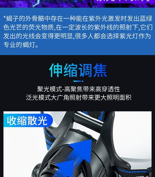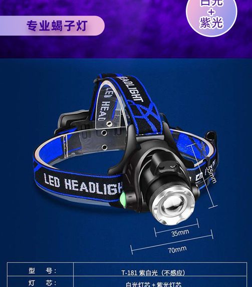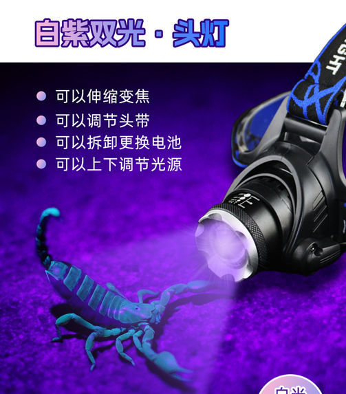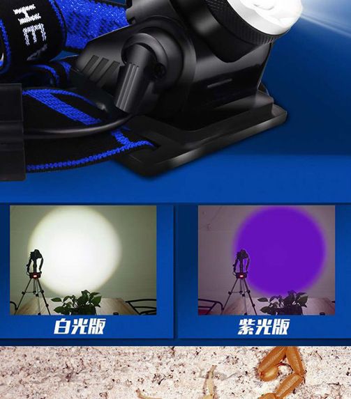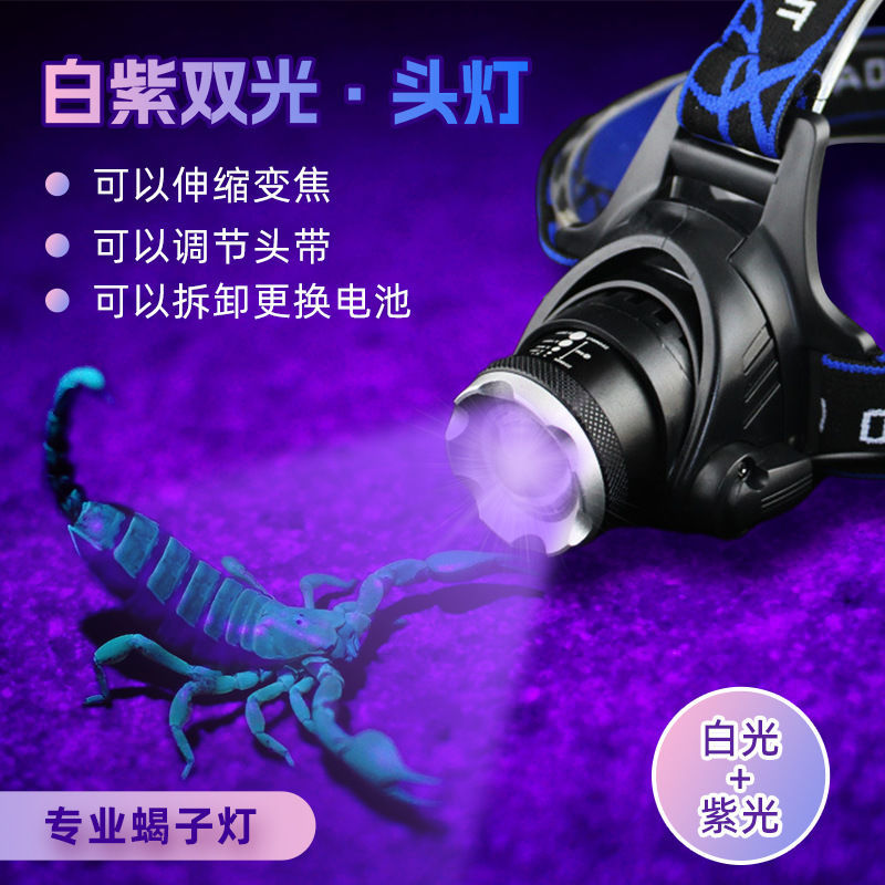 흰색 보라색 빛 전갈 헤드 램프 강한 빛 야외 장거리 led 돈 탐지기 UV 램프 충전 유도 밤 낚시 머리 장착 손전등