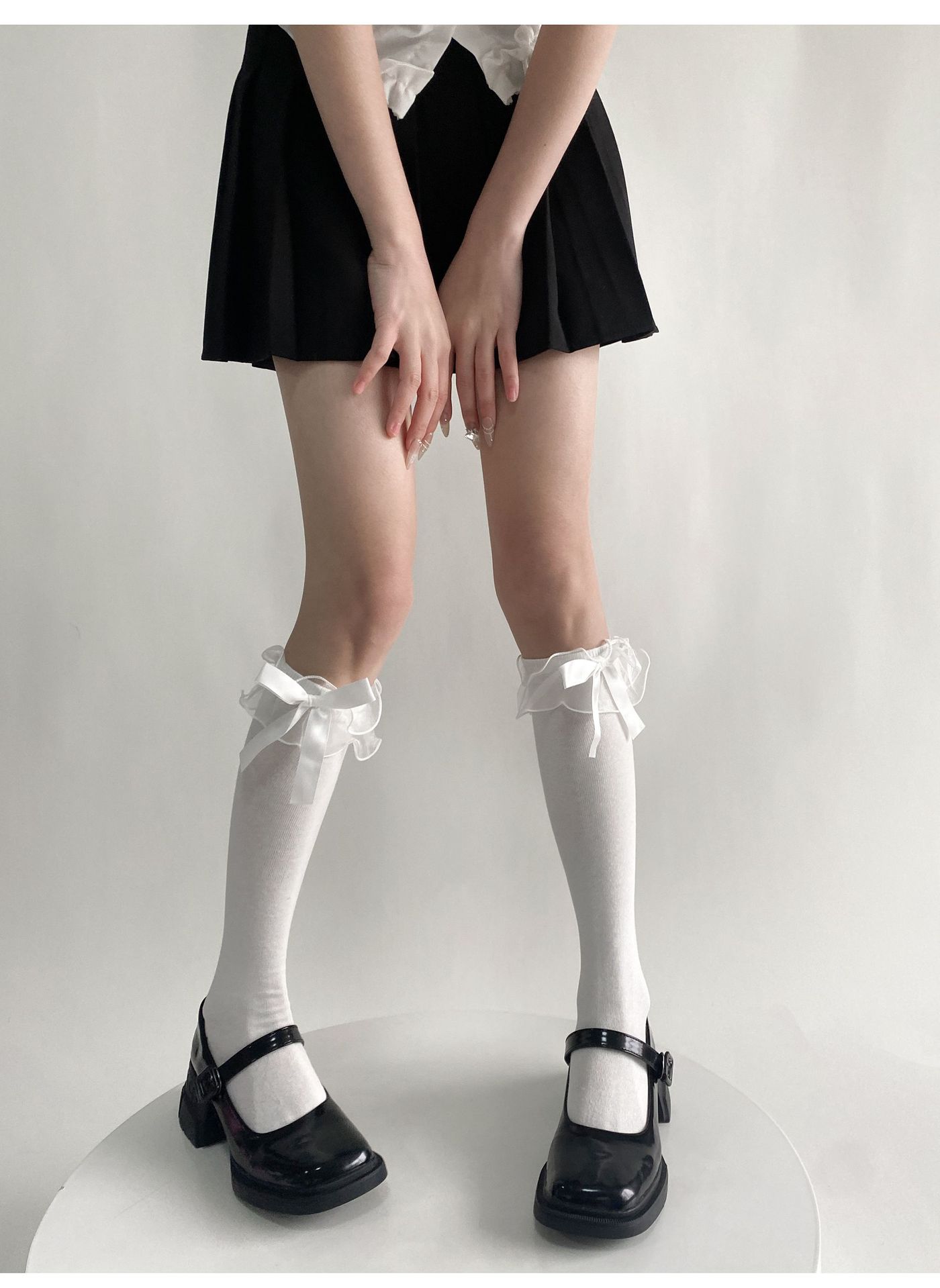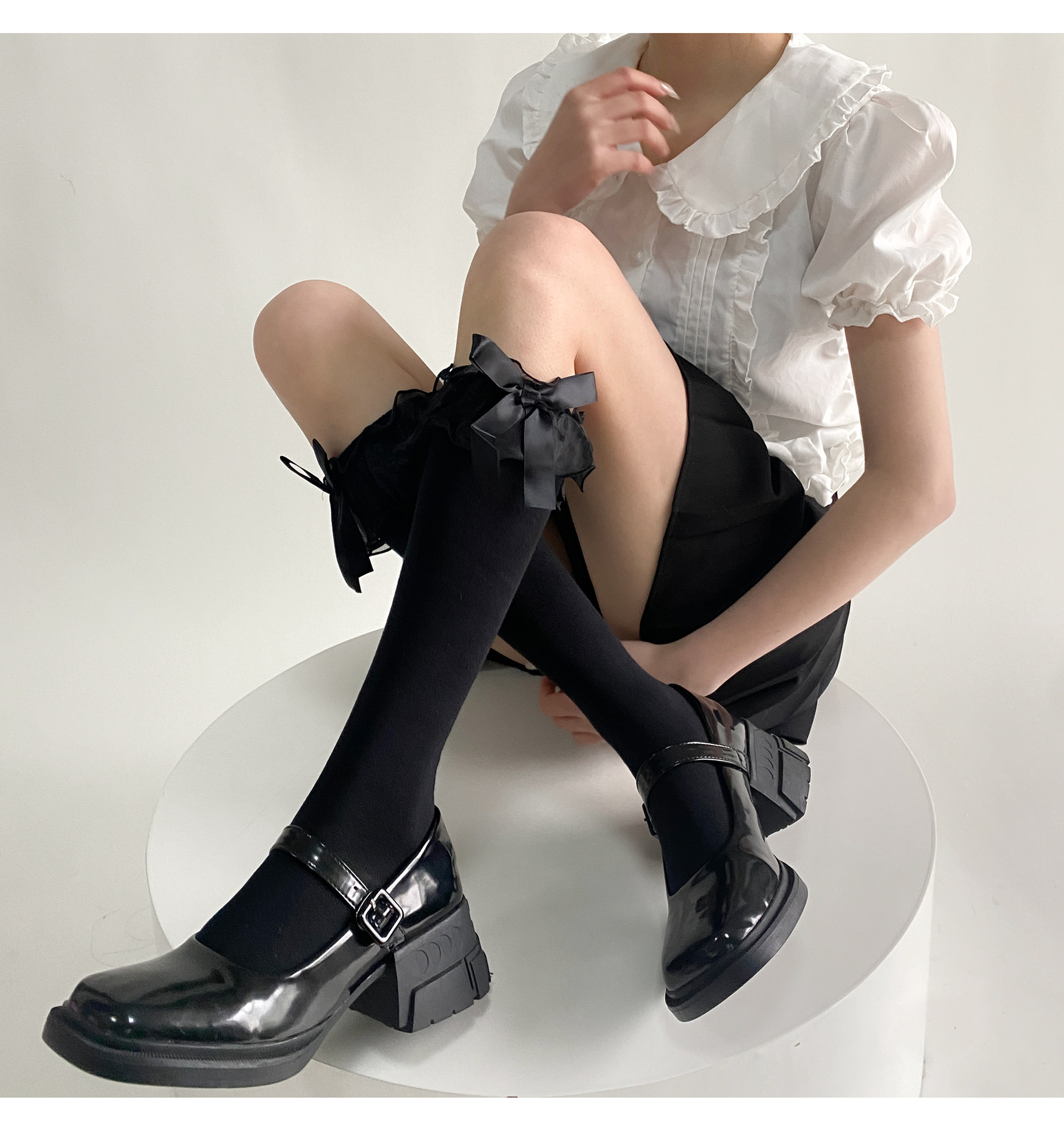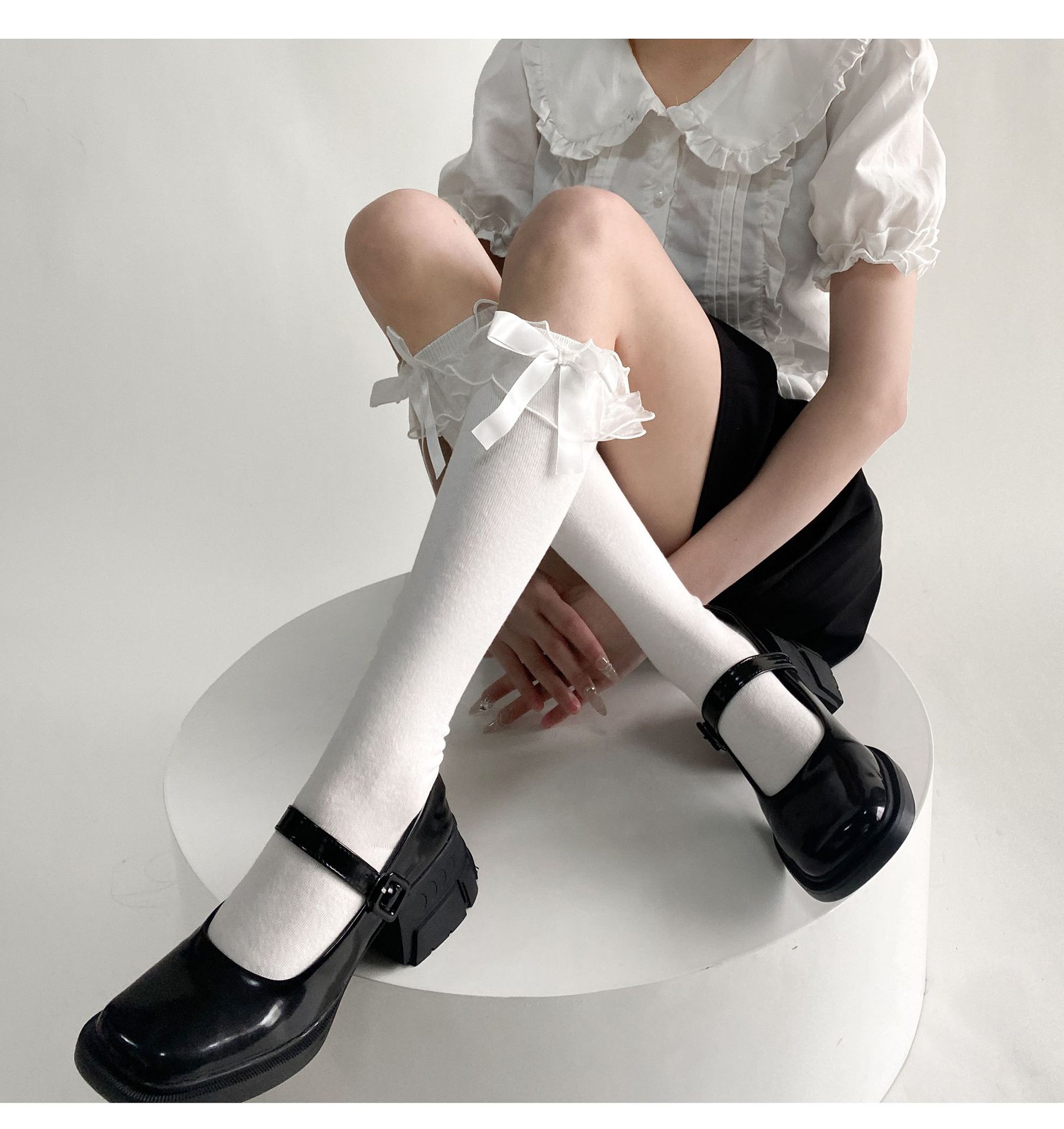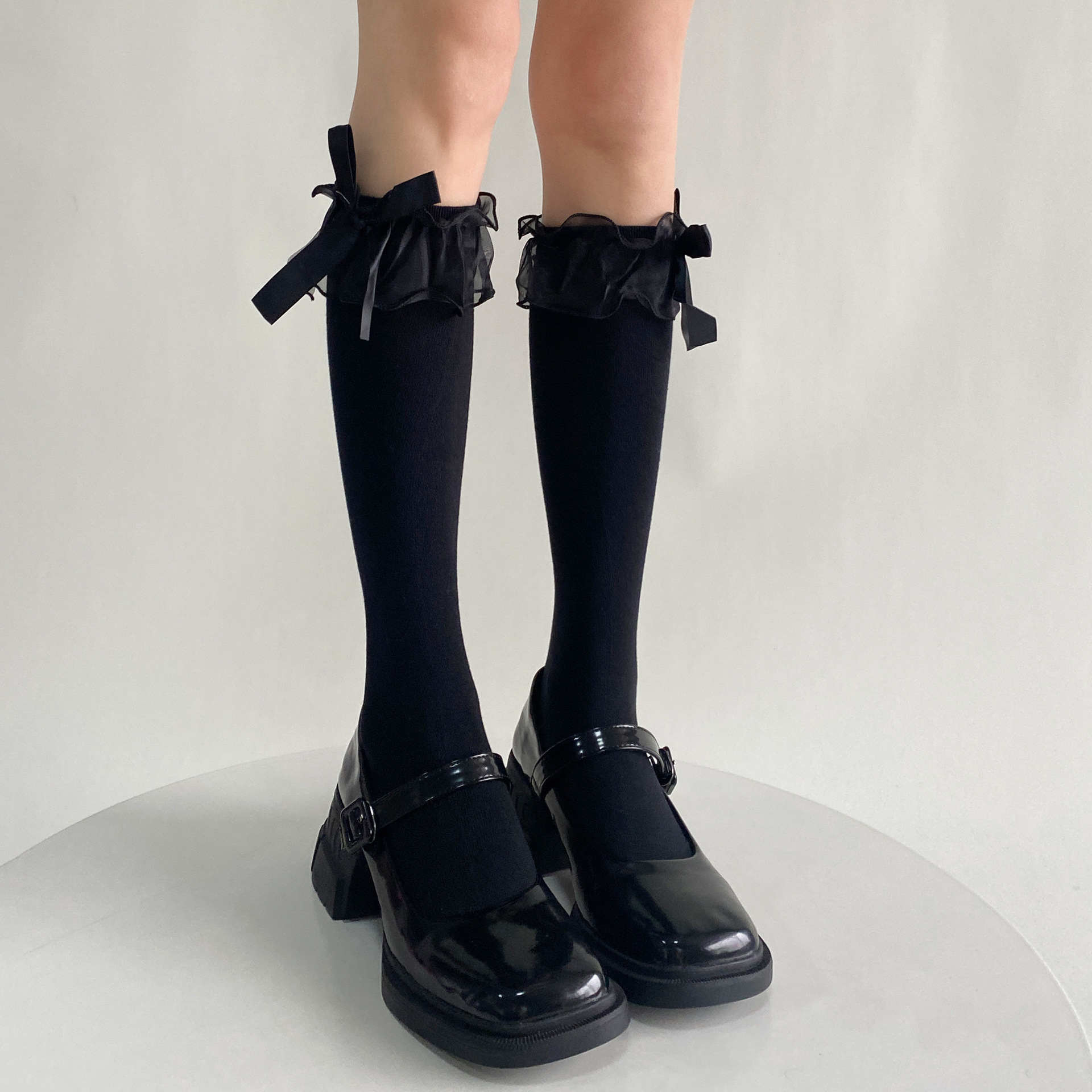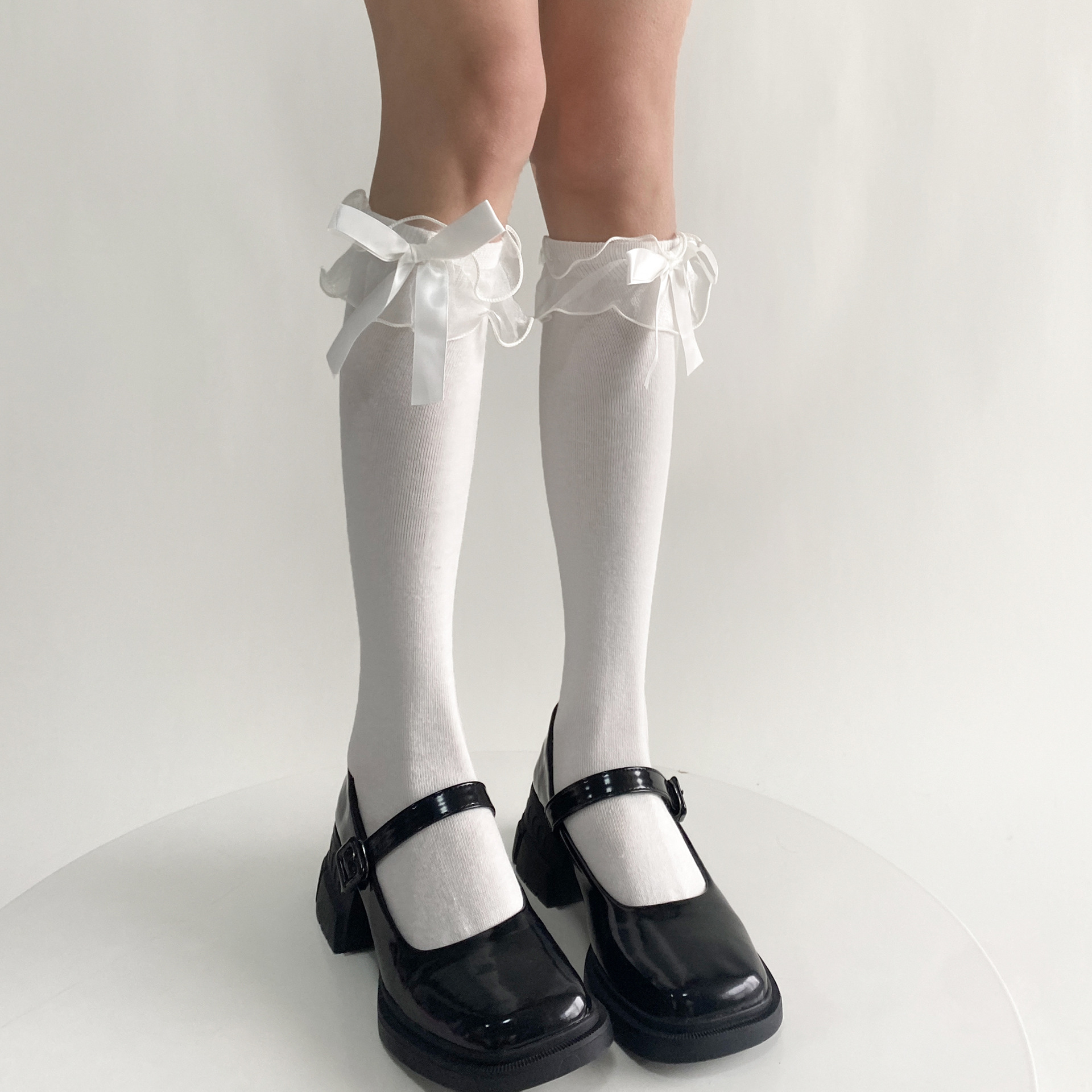 일본 봄과 가을 귀여운 유백색 활 오간자 푹신한 레이스 니트 면 종아리 양말 여성 달콤한 스타일스토어 가기