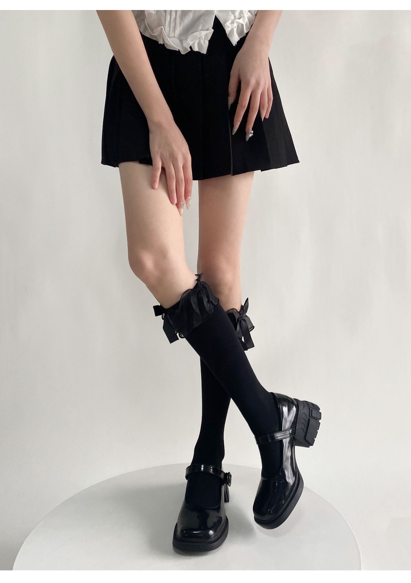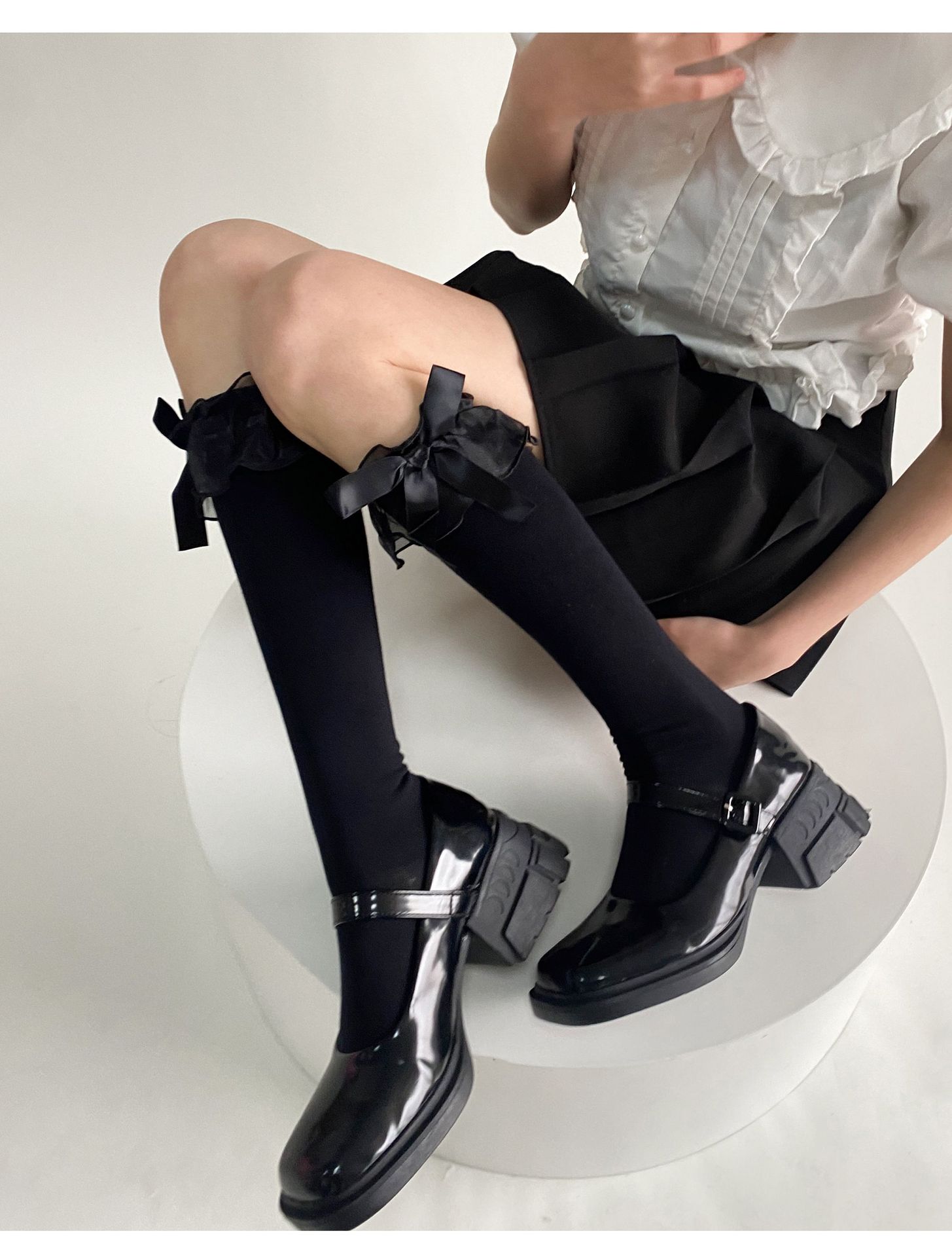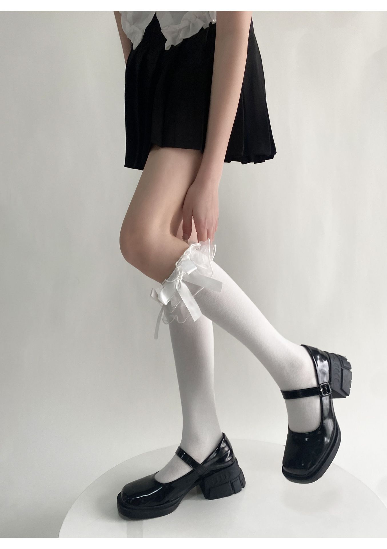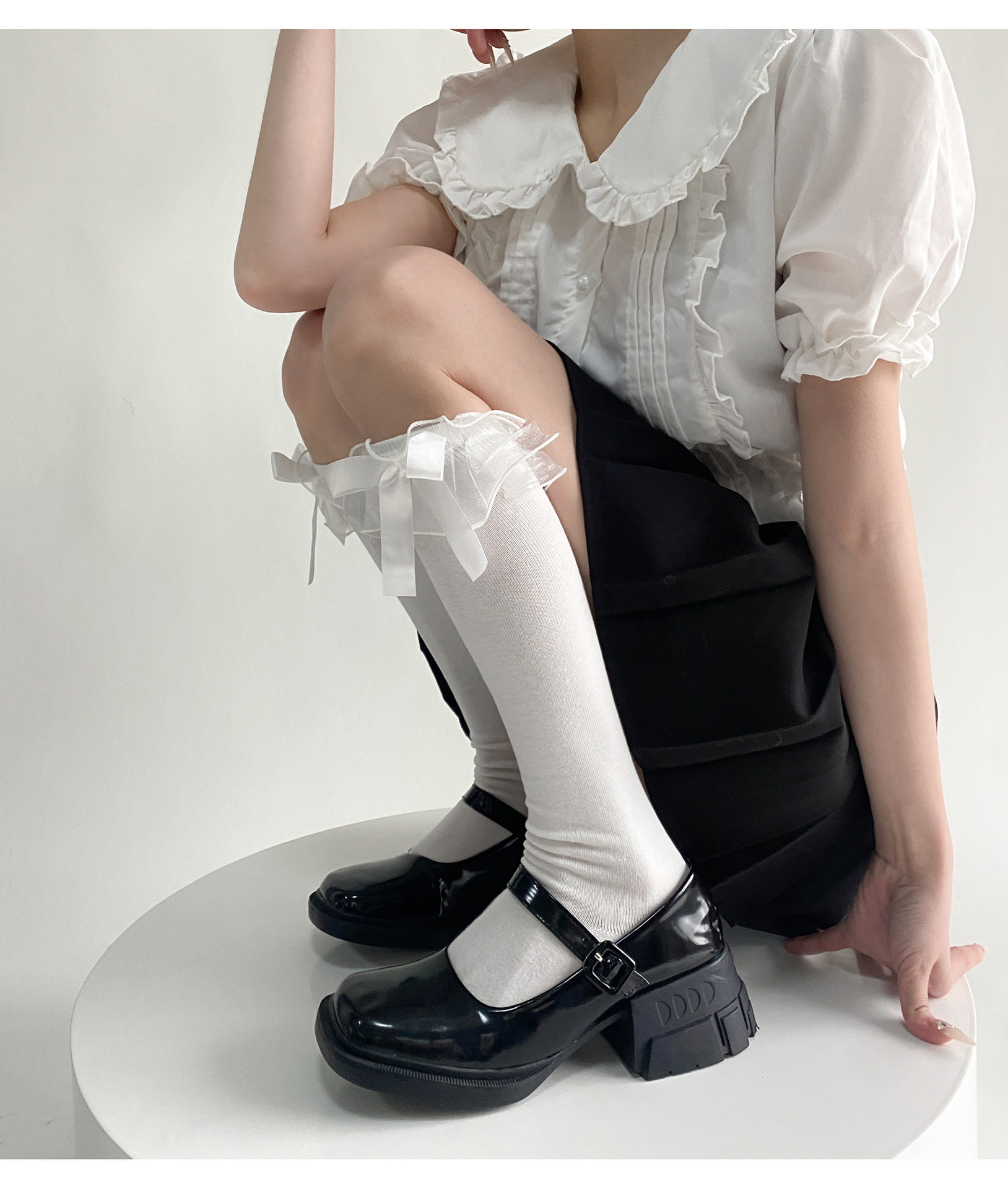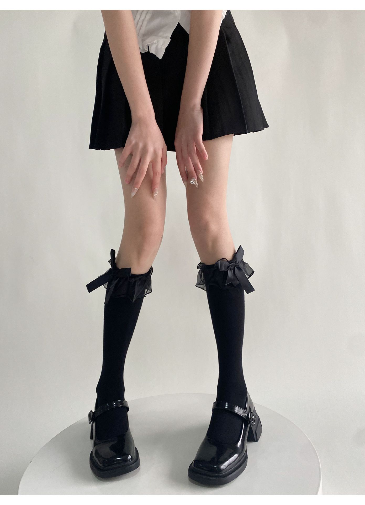 일본 봄과 가을 귀여운 유백색 활 오간자 푹신한 레이스 니트 면 종아리 양말 여성 달콤한 스타일스토어 가기