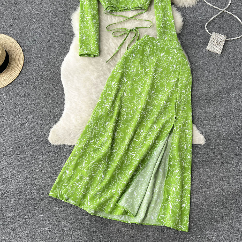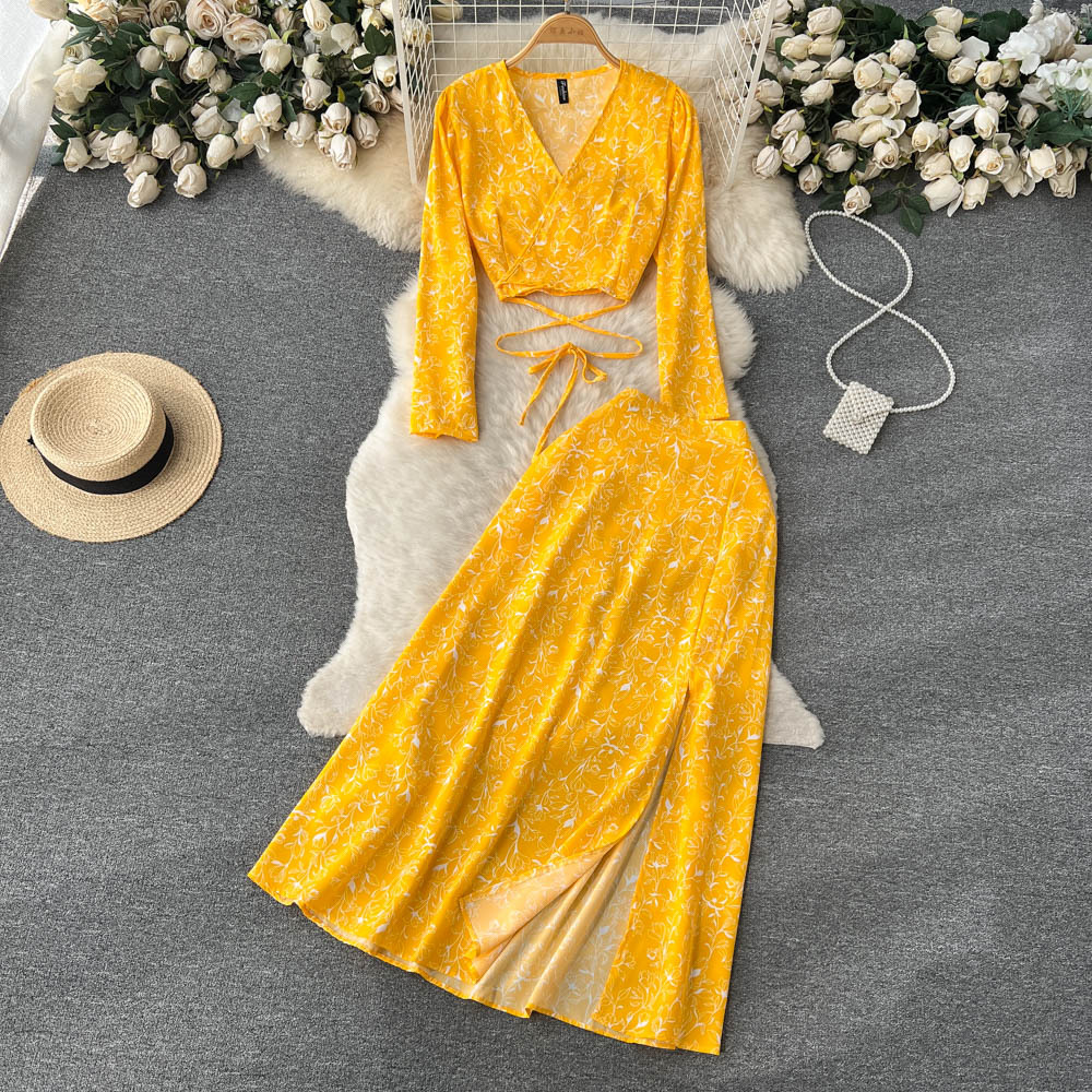 봄과 가을 휴가 스타일 빈티지 꽃 세트 여성용 긴팔 프랑스 슬리밍 V 넥 탑 스플릿 스커트 투피스 세트
