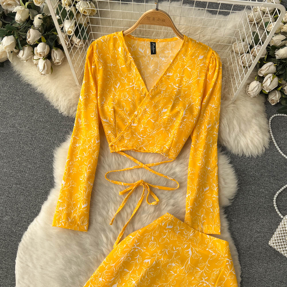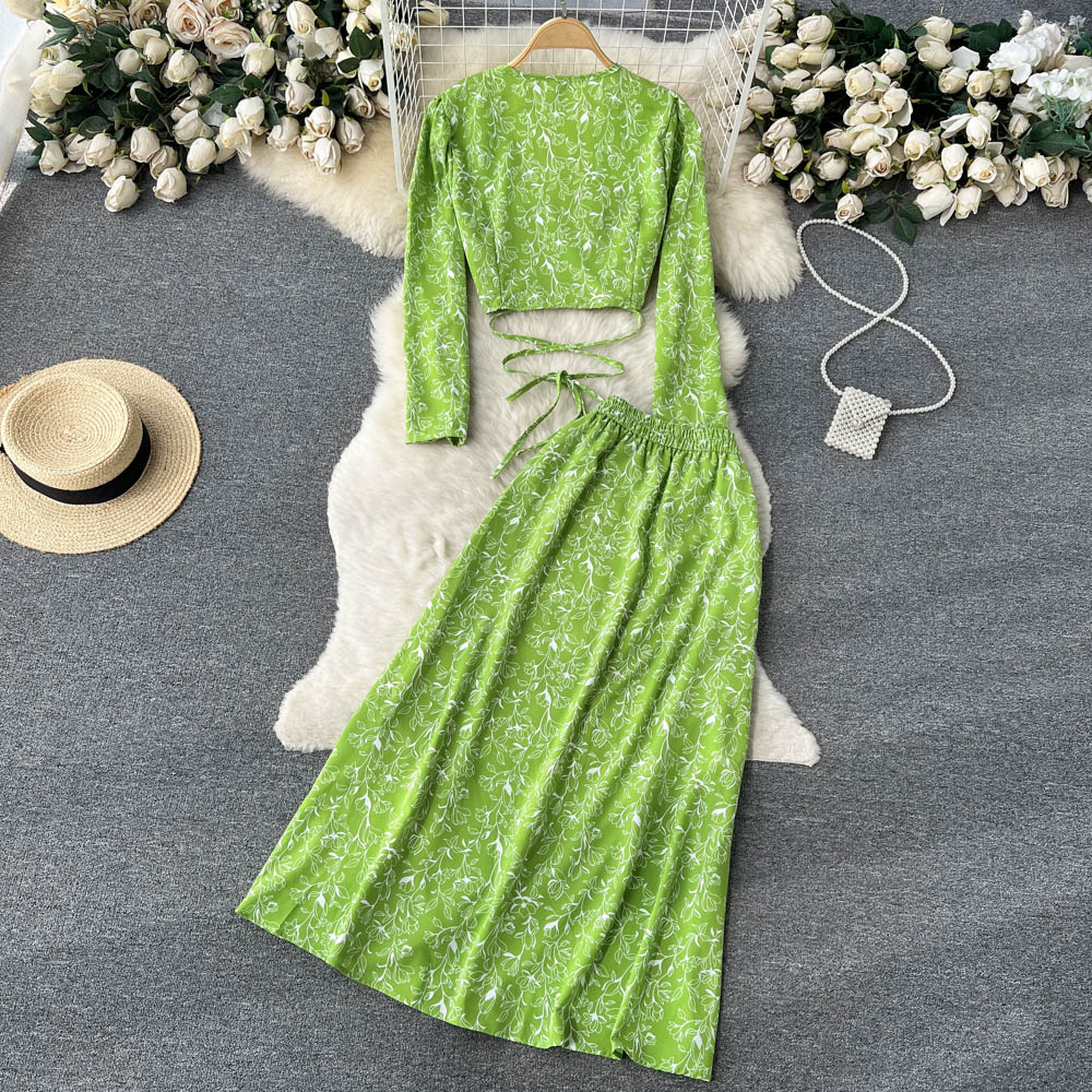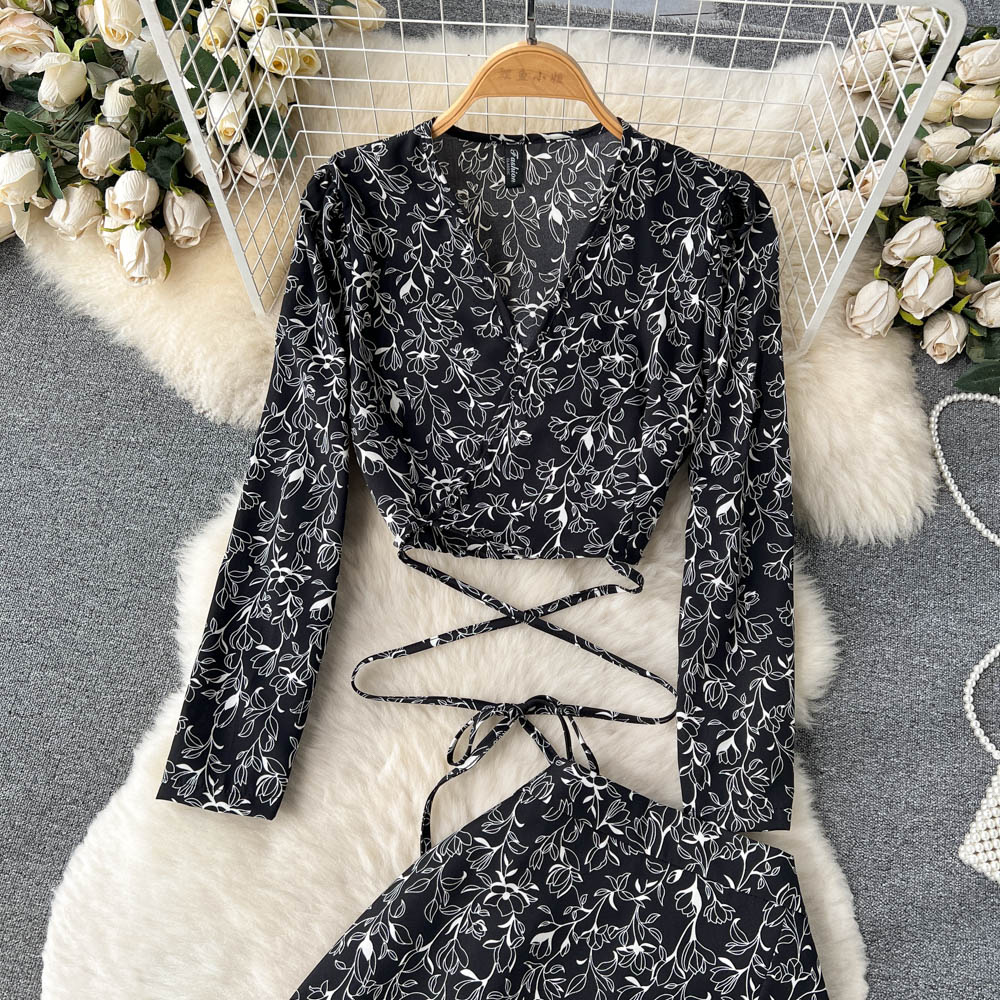 봄과 가을 휴가 스타일 빈티지 꽃 세트 여성용 긴팔 프랑스 슬리밍 V 넥 탑 스플릿 스커트 투피스 세트스토어 가기