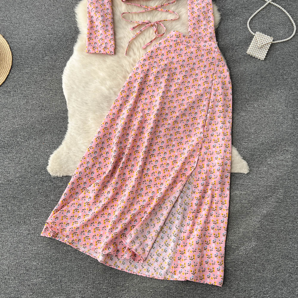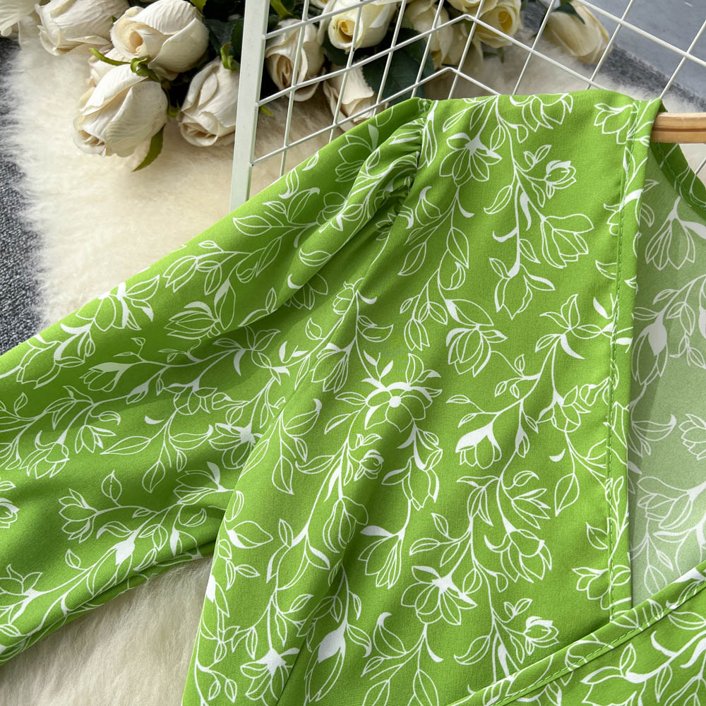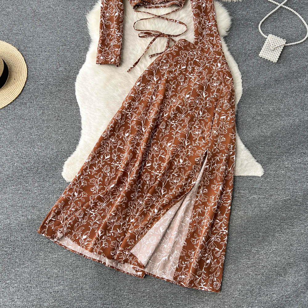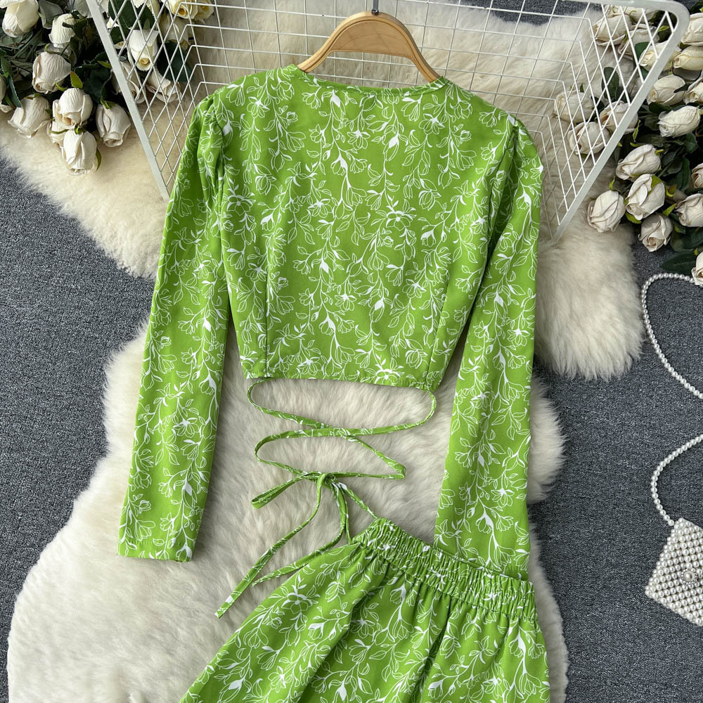 봄과 가을 휴가 스타일 빈티지 꽃 세트 여성용 긴팔 프랑스 슬리밍 V 넥 탑 스플릿 스커트 투피스 세트스토어 가기