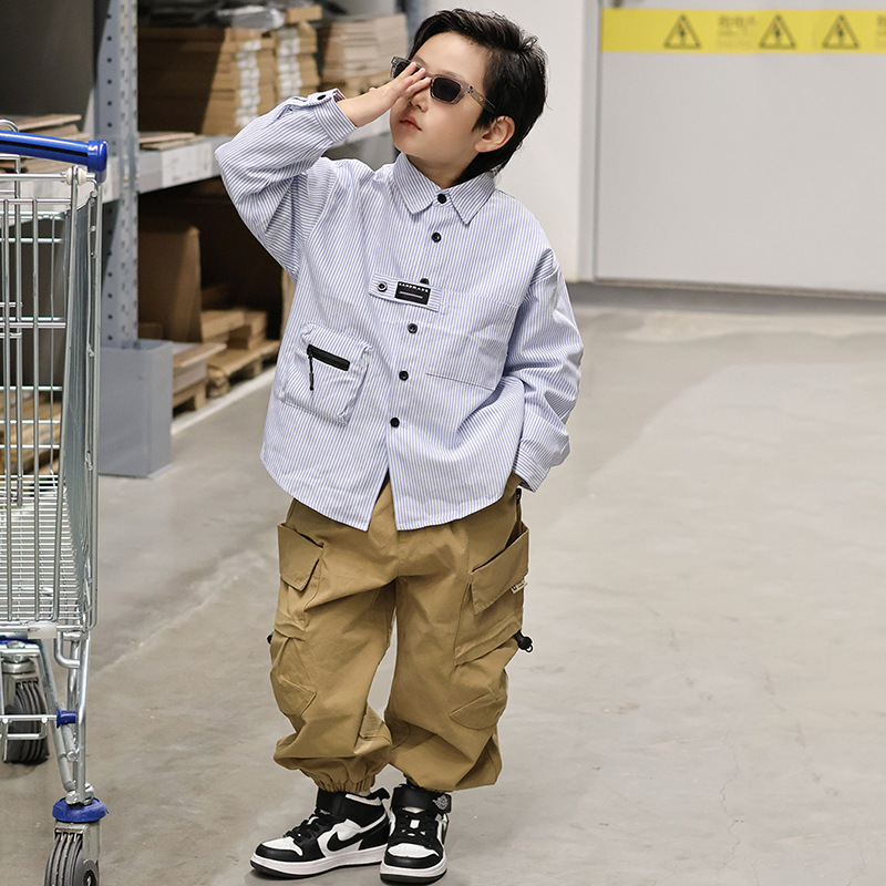 2024 소년 긴팔 셔츠 가을 의류 아동 대학 스타일 포켓 셔츠 캐주얼 가을 아동 의류 스트라이프 카디건스토어 가기