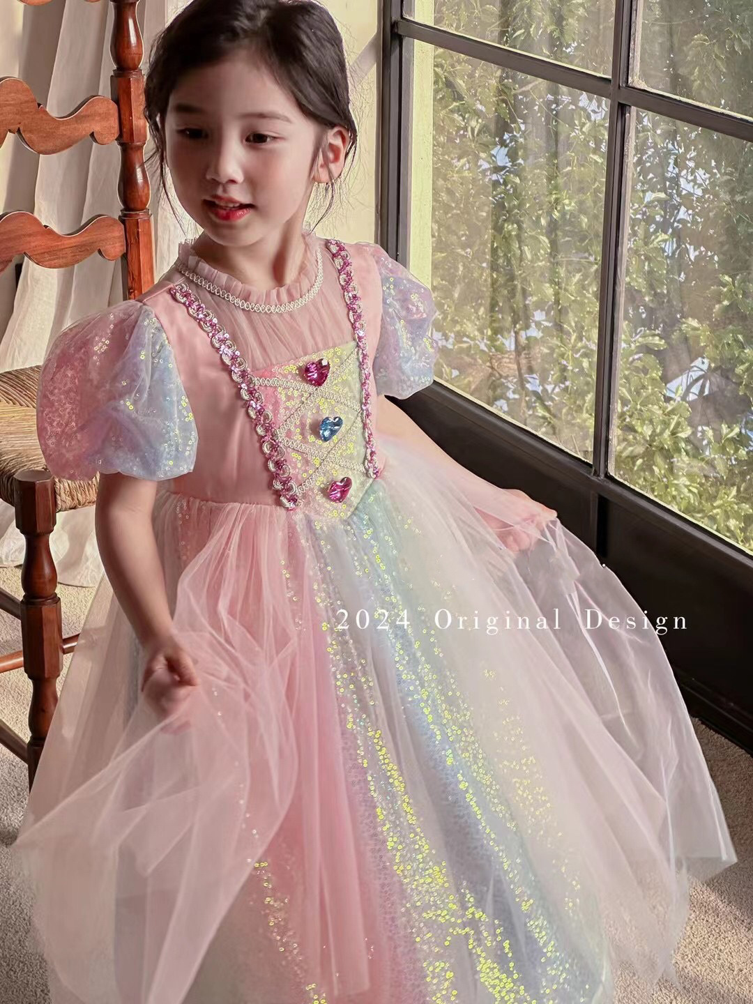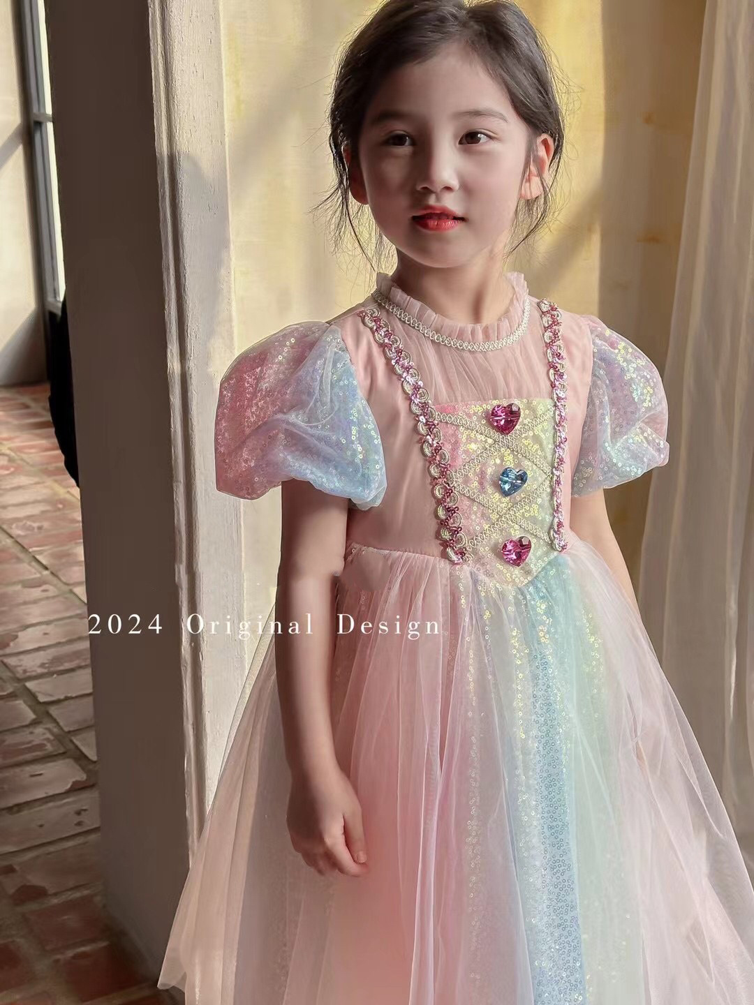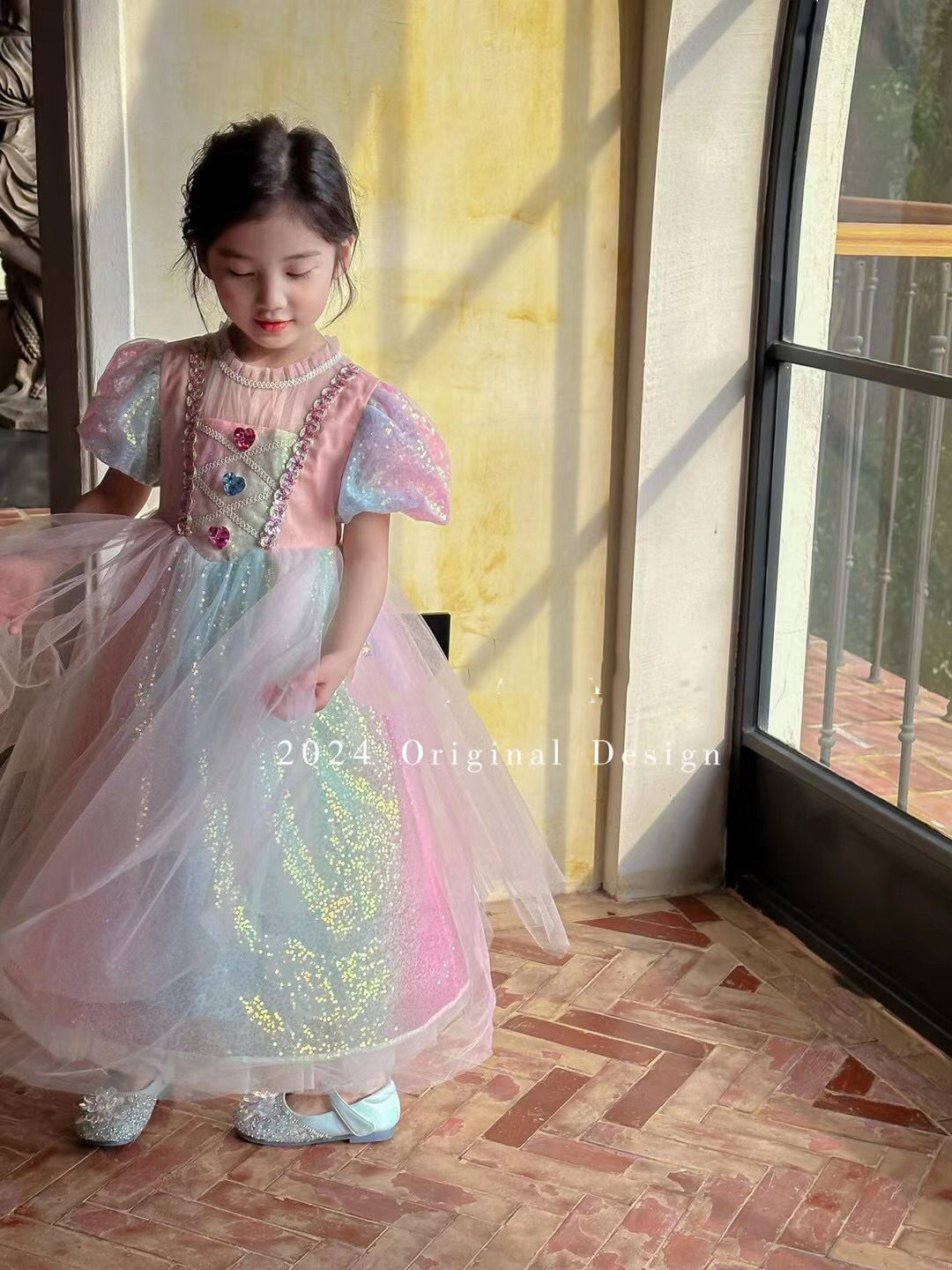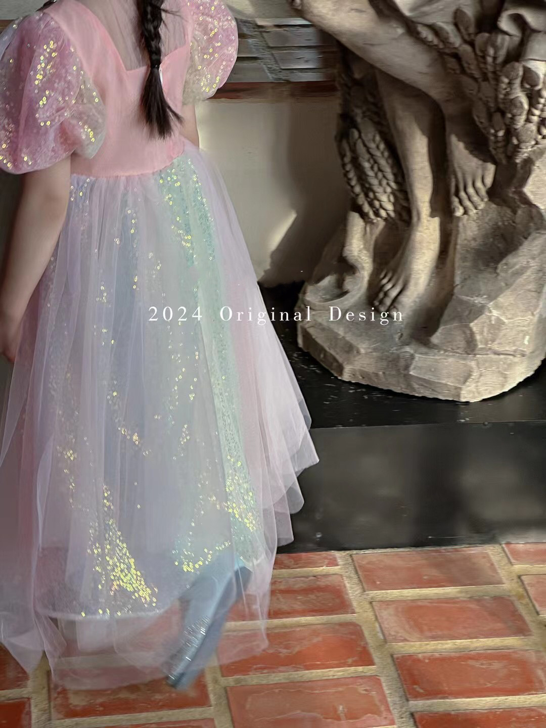 소녀의 원피스 캔디 컬러 스팽글 인어 공주 원피스 그라디언트 메쉬 24 여름 새로운 무거운 작업 원피스 성능